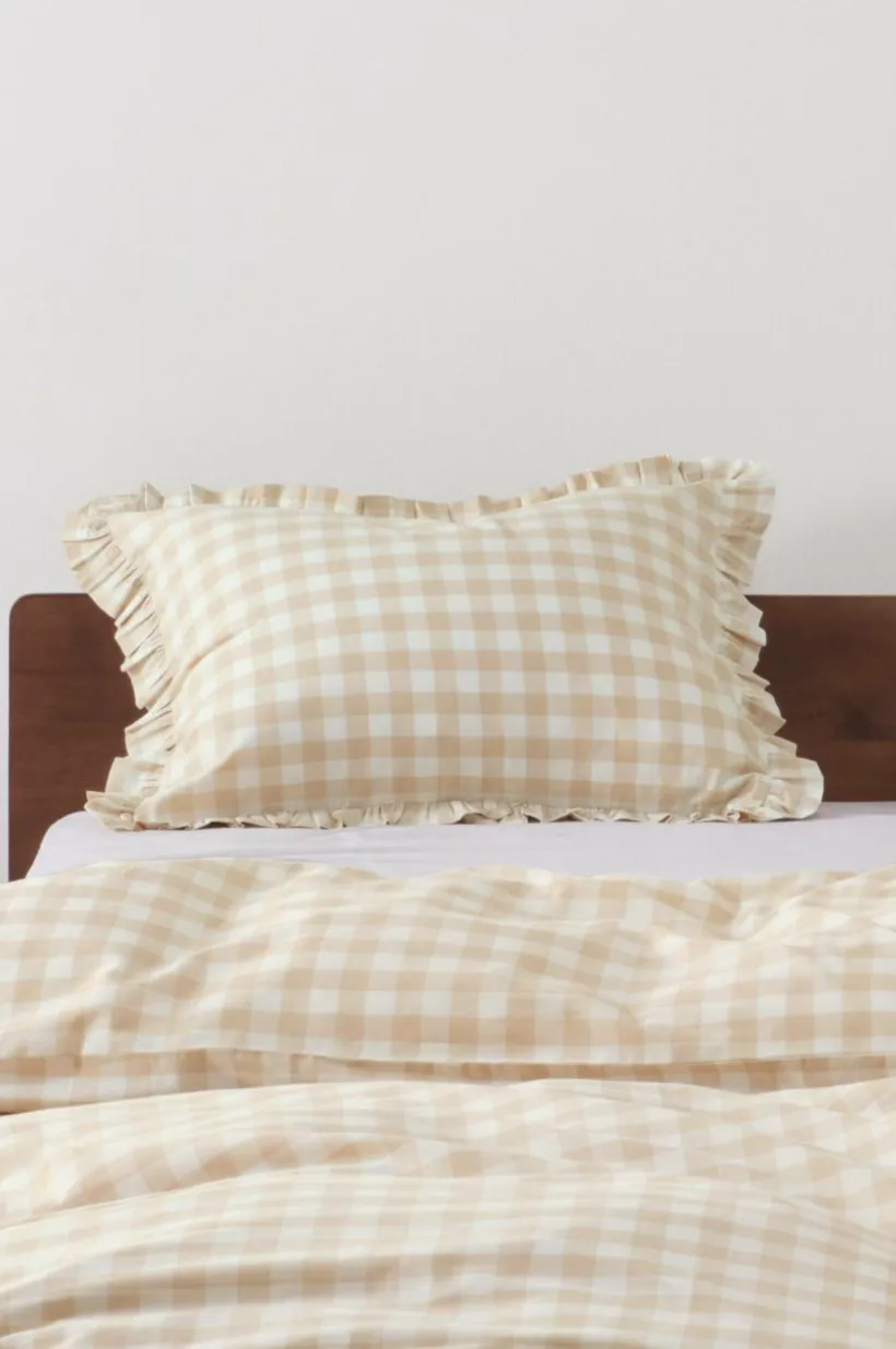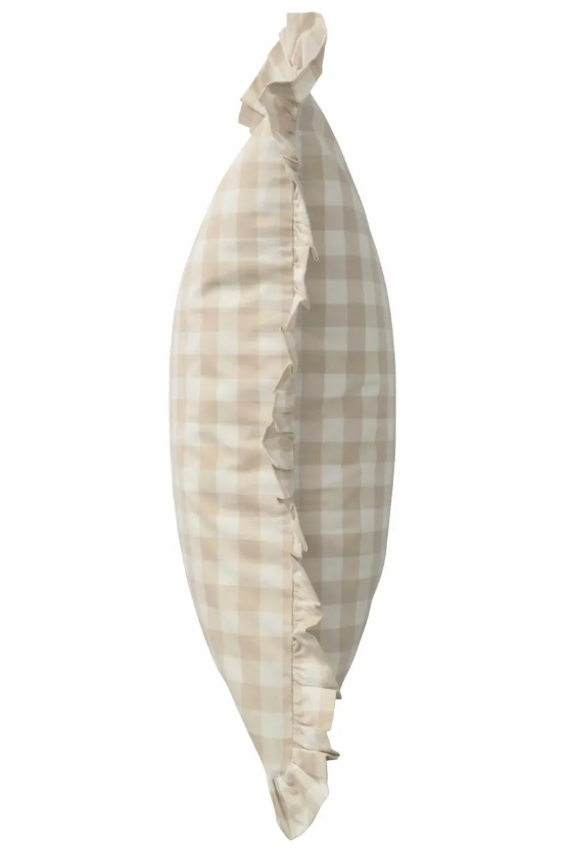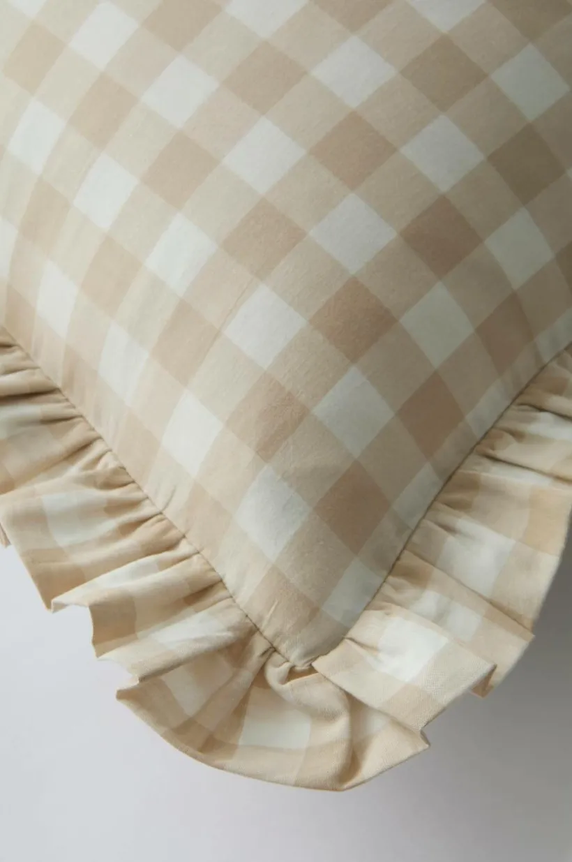 Kuddfodralet LAUREN ger en charmig touch till ditt sovrum med sitt gingham-mönster och eleganta volangdetaljer. Det är garnfärgat för livfulla färger och passar perfekt ihop med LAUREN-familjen av koordinerande föremål, vilket skapar en personlig och elegant hematmosfär.