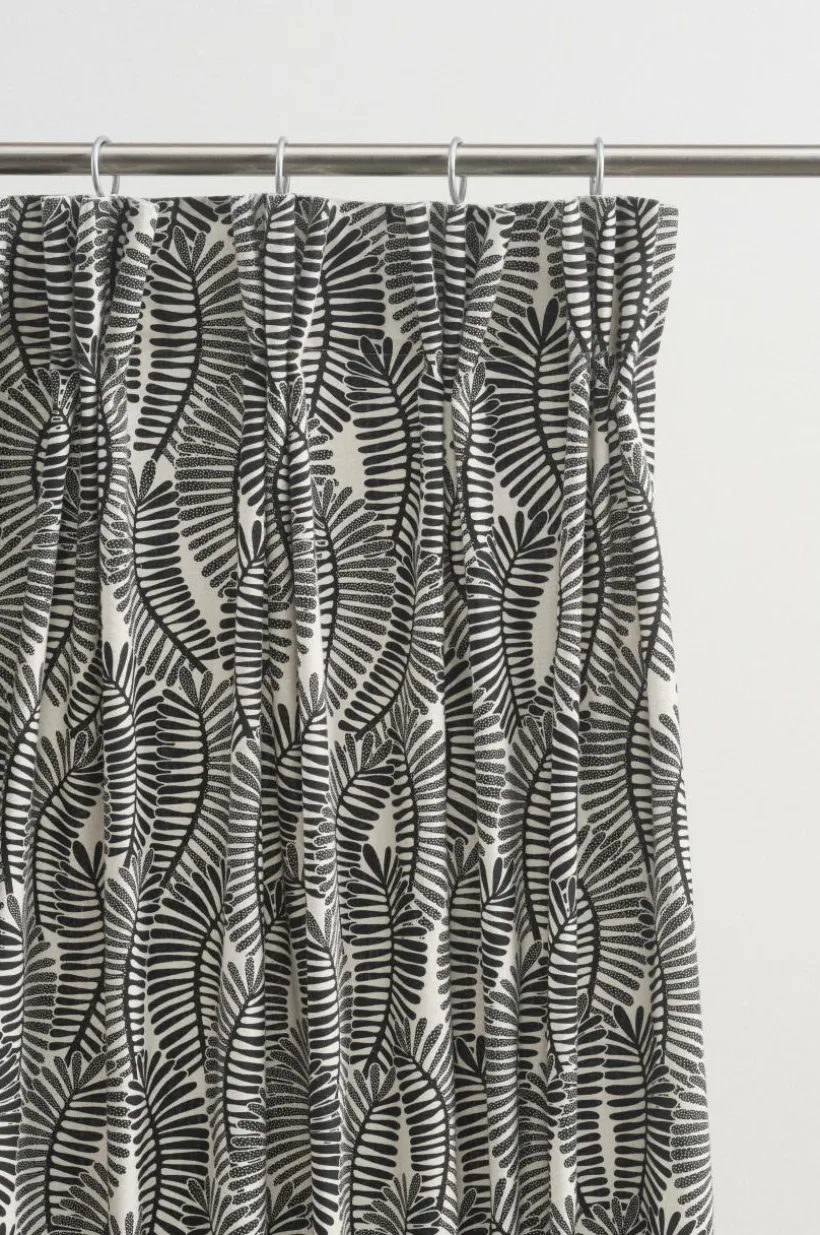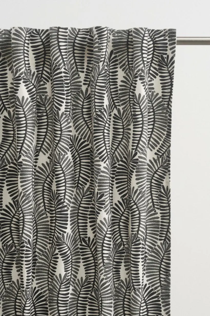Två gardinlängder i fin kvalité av bomull och lin med stilistiskt ormbunksmönster i läckra färgställningar. Tyget är plaggtvättat vilket ger följsamhet och fint fall. Längderna har påsytt multifunktionsband och kan hängas upp med fingerkrokar, kanal samt dold hälla. Tygets vikt 210 g/m².
