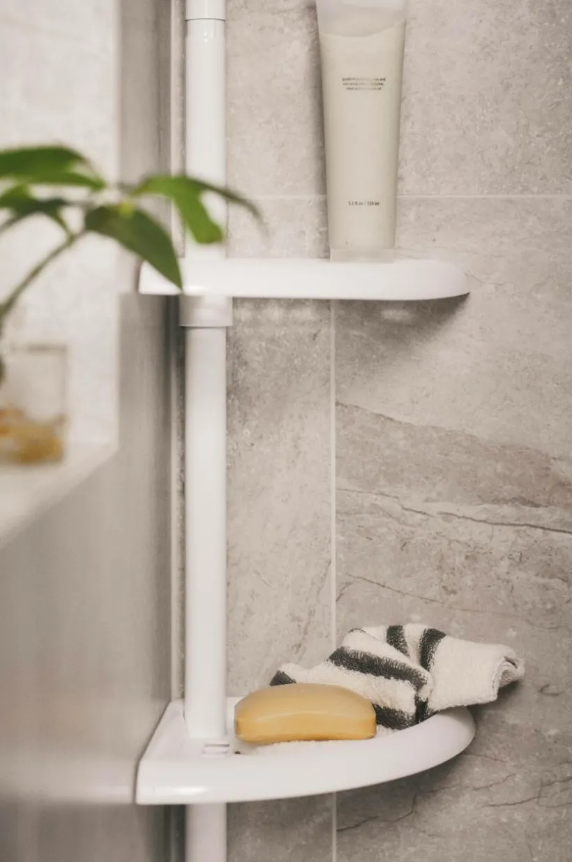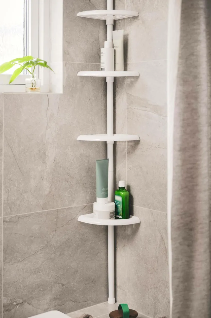 Hörnhylla av plast med teleskopstång av metall. En praktisk hörnhylla med fyra flyttbara hyllor som passar perfekt till badrummet. Placera hyllan mellan badkarskanten och taket, eller från golv till tak. Teleskopstång ger reglerbar höjd och gör den enkel att fästa. Flexibel efter dina önskemål med fyra flyttbara hyllor.