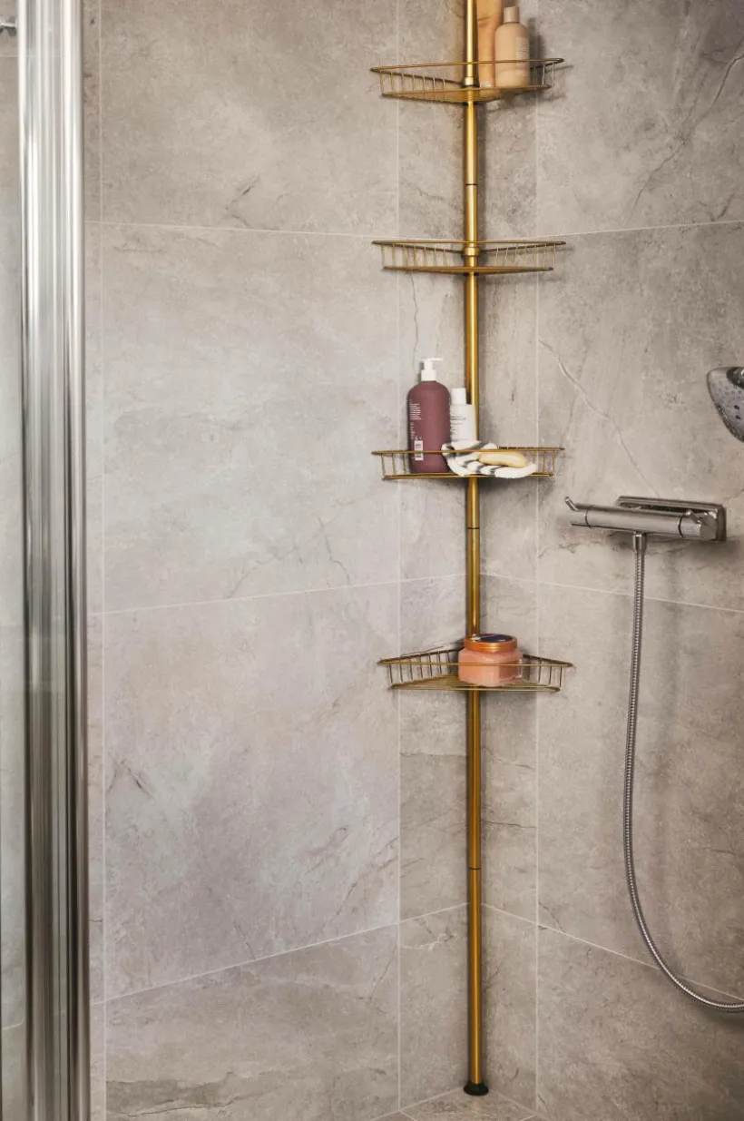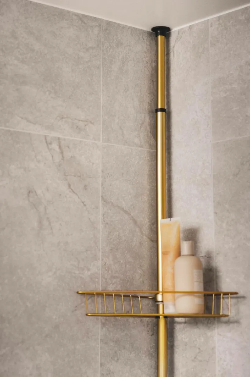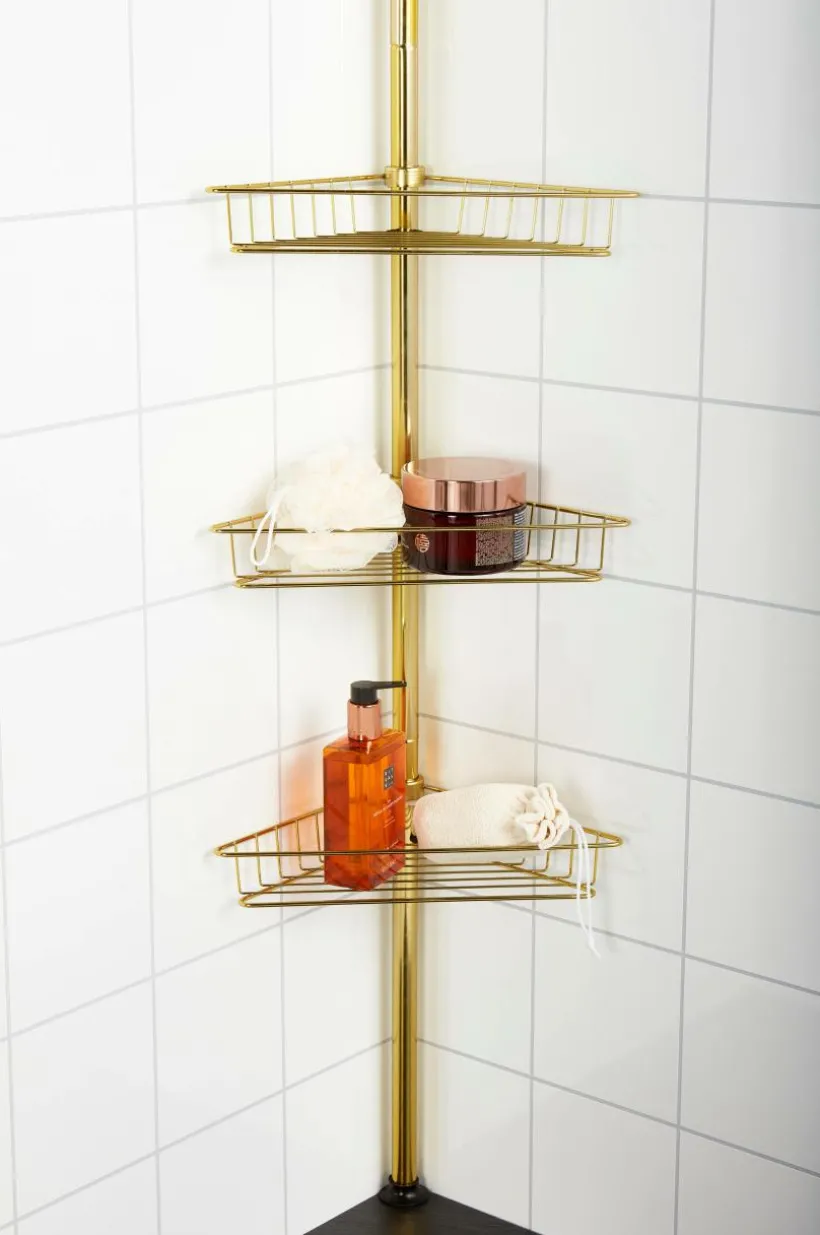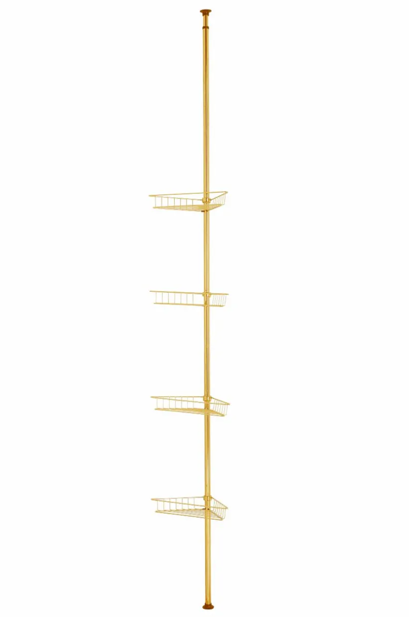 Praktisk hörnhylla till badrummet. Placera hyllan mellan badkarskanten och taket, eller från golv till tak. Teleskopstång ger reglerbar höjd och gör den enkel att fästa. Flexibel efter dina önskemål med fyra flyttbara hyllor. Det är viktigt att du följer medföljande monteringsanvisning när du monterar hyllan för stabiliteten.