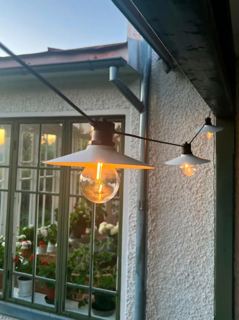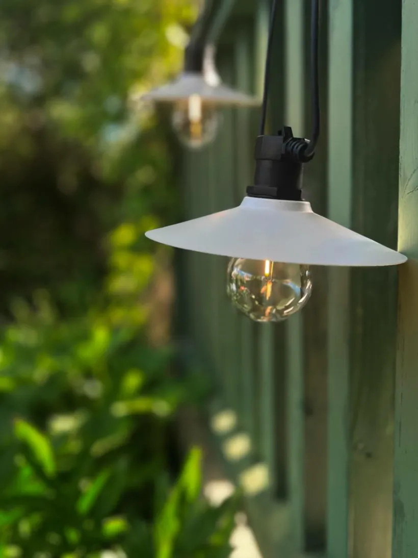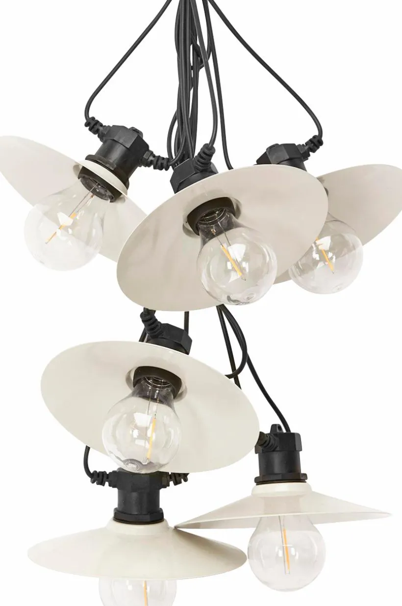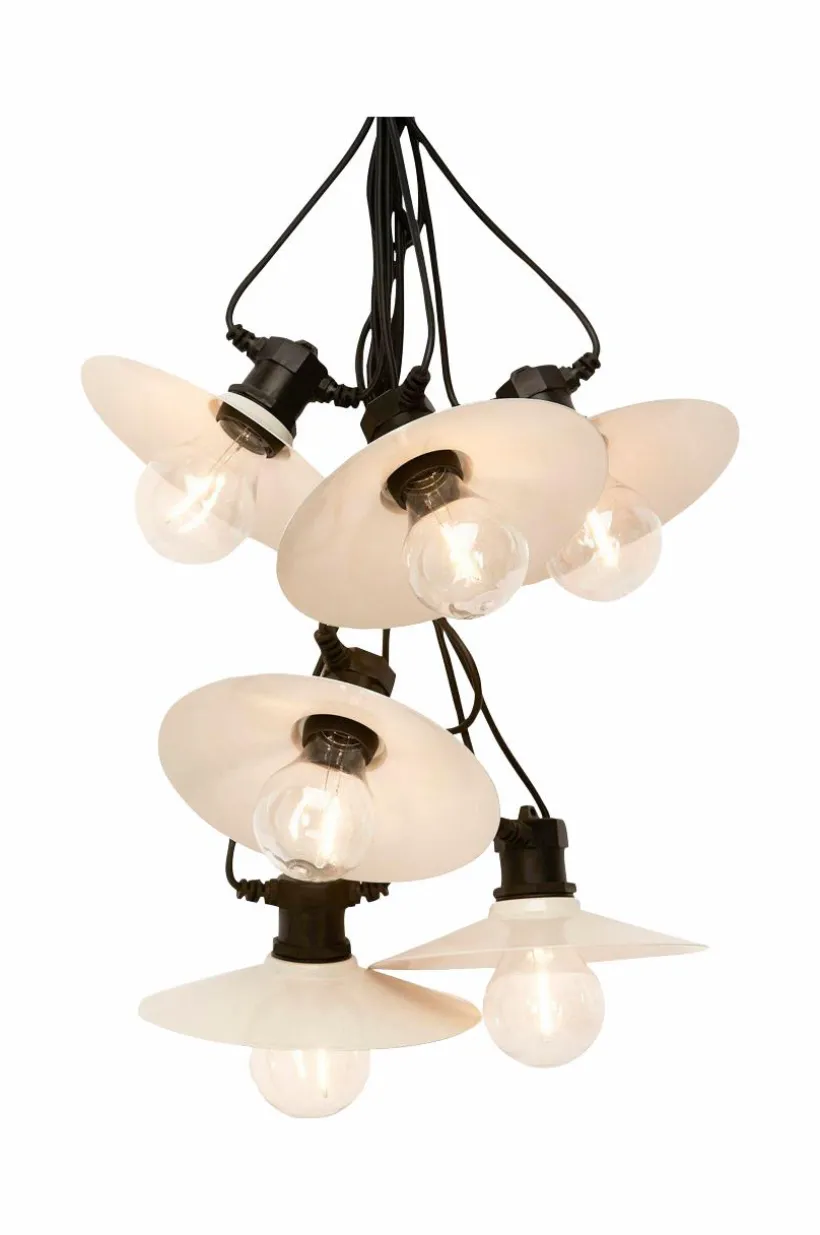 Donna Ljusslinga med släta skärmar i metall. Ljusslingan har 6st skärmar med fasta LED lampor. Anpassad för utomhusbruk med klassificering IP44, men kan även hänga inomhus. Total längd 7,9 meter. 3 meter till 1:a lampan och sedan 0,7 meter mellan varje lampa. Ljuskällorna är inte utbytbara.
