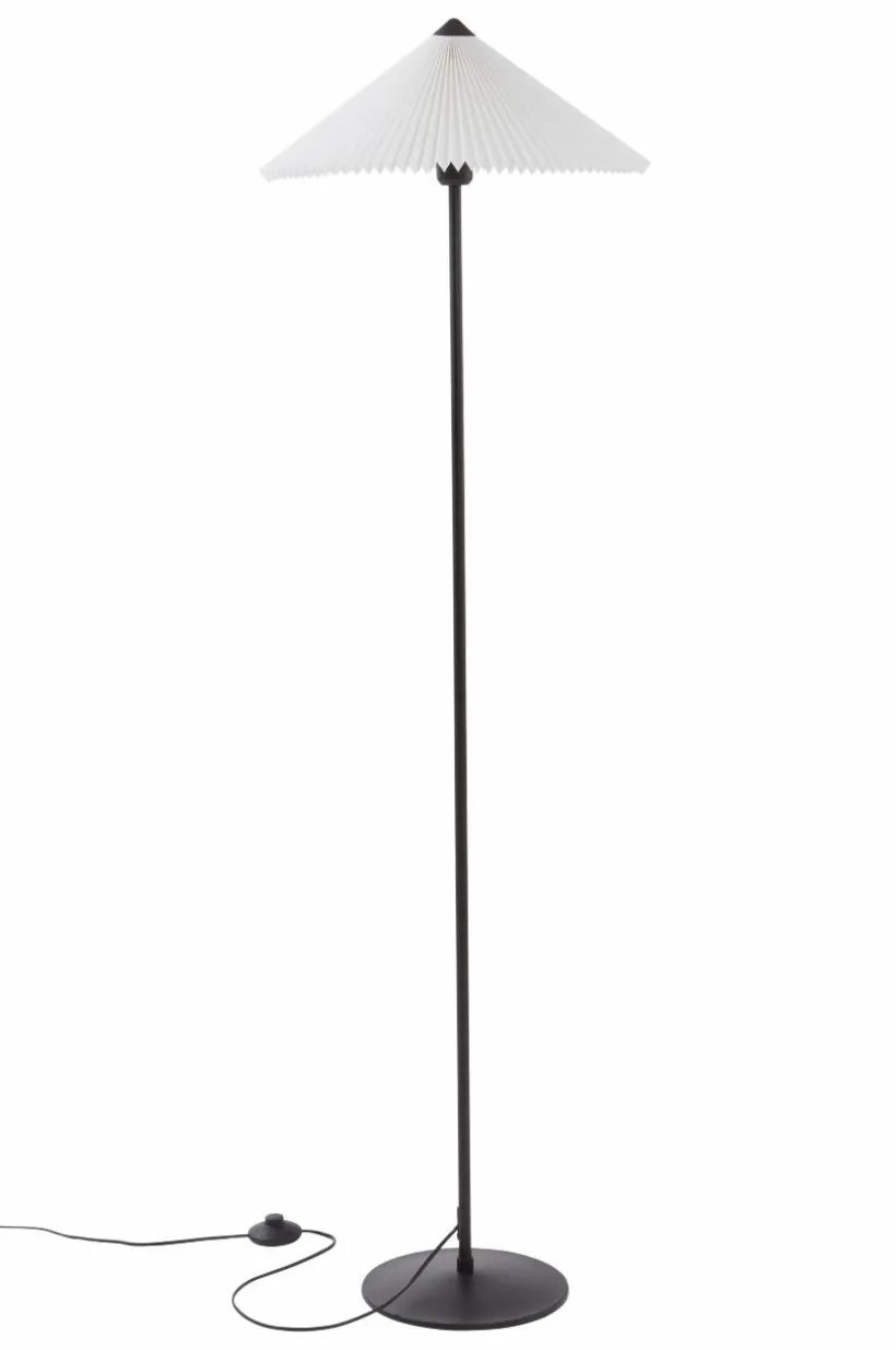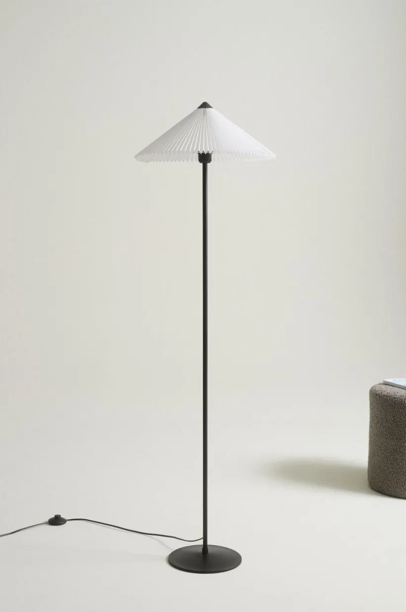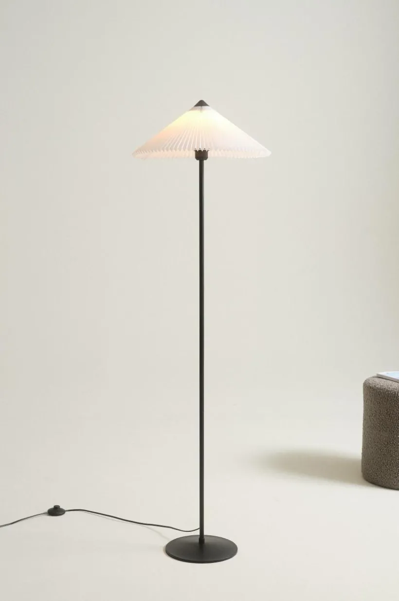 Golvlampan LORI är enkel och lättplacerad med svartlackerad metallfot och ljus textilskärm. Skärmen har diskret metallstomme och svart topp. Svart plastsladd med strömbrytare på sladden.
