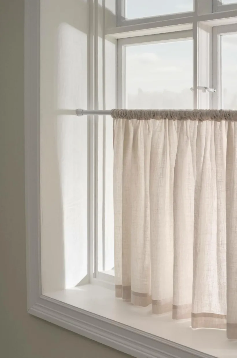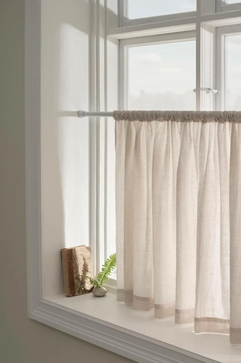 En cafégardin i luftigt tyg med melerad effekt. Tyget är vävt i bomull och har en skönt avslappnad känsla. Cafégardinen LUNI har en sydd kanal upptill och den hängs på gardinstång nedtill i ditt fönster och ger på så sätt insynsskydd samtidigt som ljuset kommer in ovanför gardinen, härligt att alltid se himlen.