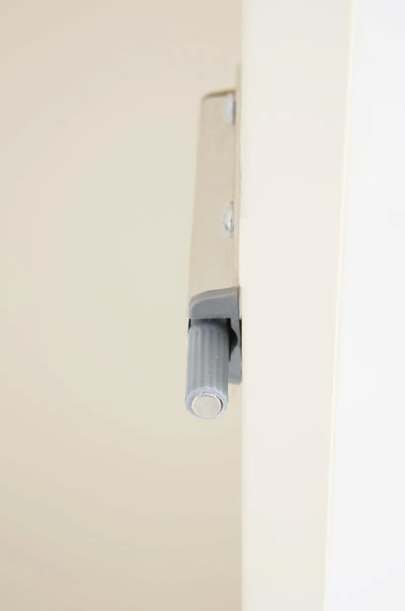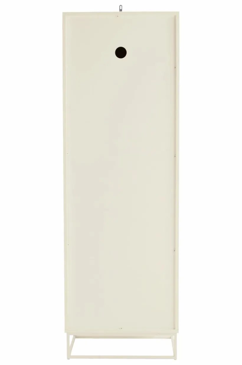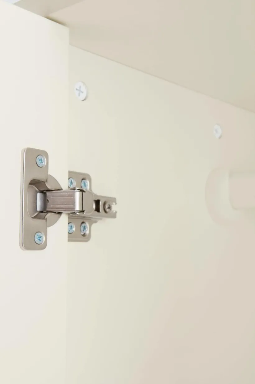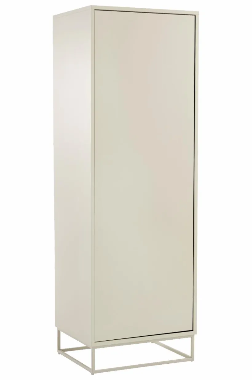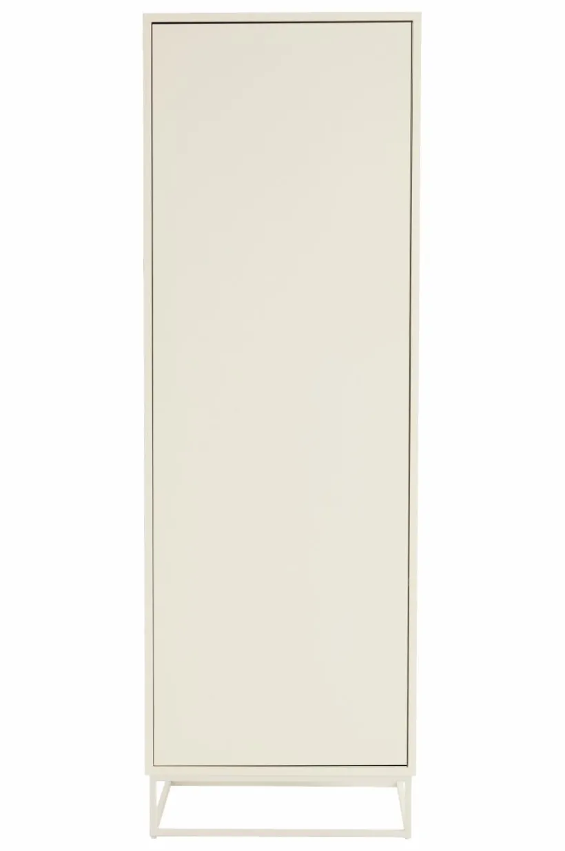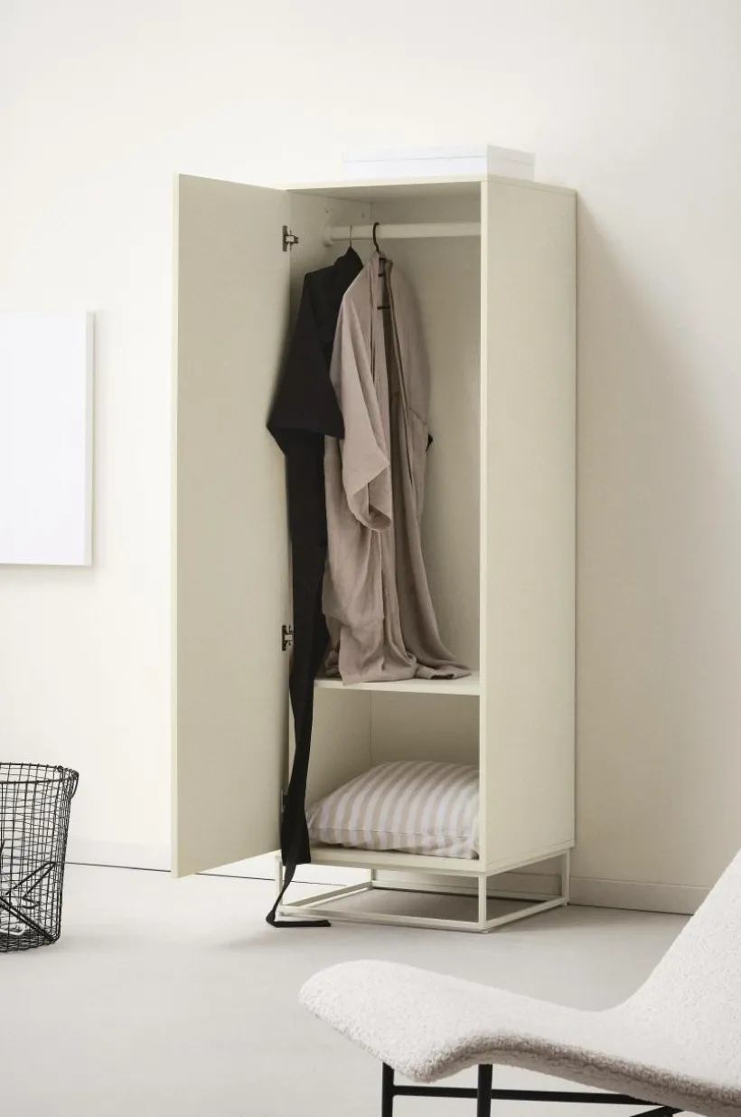 Garderob av MDF med underrede av metall. Den avskalade och stilrena garderoben har en dörr med pushfunktion. Det gör att garderoben är helt slät utan handtag och ändå lätt att öppna. Garderoben har klädstång av massiv bok och en fast hylla. Dörren är vänsterhängd. Du kan själv byta sida så dörren blir högerhängd, men observera då att du har hål kvar på vänster sida. Delarna av MDF har vattenbaserad lack. Underredet är av fyrkantsprofil med pulverlack. Väggfäste gör att skåpet kan fästas i väggen vid behov. Viss montering krävs. Monteringsanvisning medföljer.