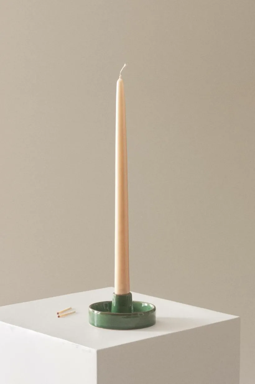 Handgjord ljusstake av keramik. Ljusstaken är stilren och klassisk i sin form och den har glaserats i en fin nyans. Ljusstaken smälter in fint i en gammaldags rustik miljö och den gör sig också bra i en modern, avskalad stil. Den praktiska kanten runt foten gör att stearinet samlas upp om det skulle råka rinna lite, och din duk eller bordsskivan klarar sig från fläckar. Det fina hantverket gör varje ljusstake unik.