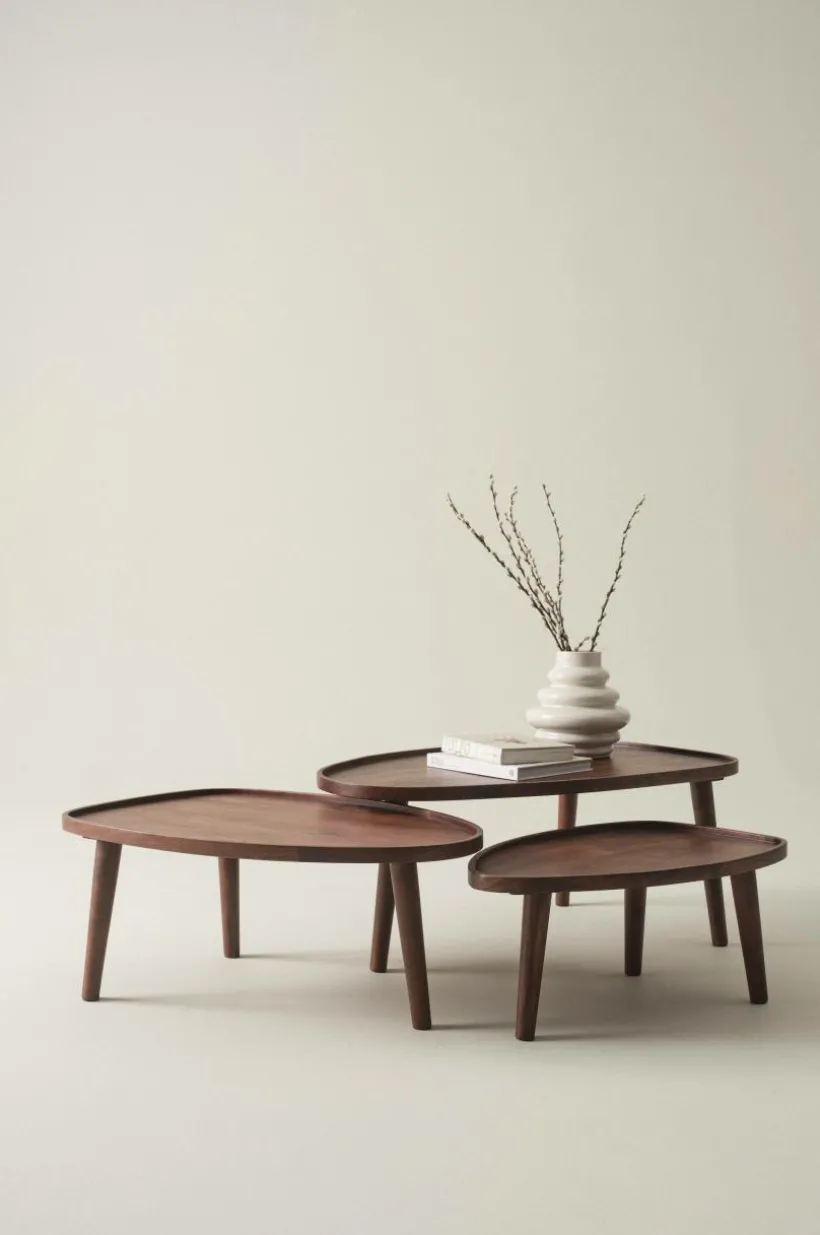 Tre snyggt formade soffbord av mangoträ med vacker ytbehandling som ger mustig lyster till träet samtidigt som ådringen bibehålls. De tre borden fungerar som ett klassiskt satsbord där du kan skjuta in borden under varandra. Bordsskivorna har strykjärnsform med runda hörn.