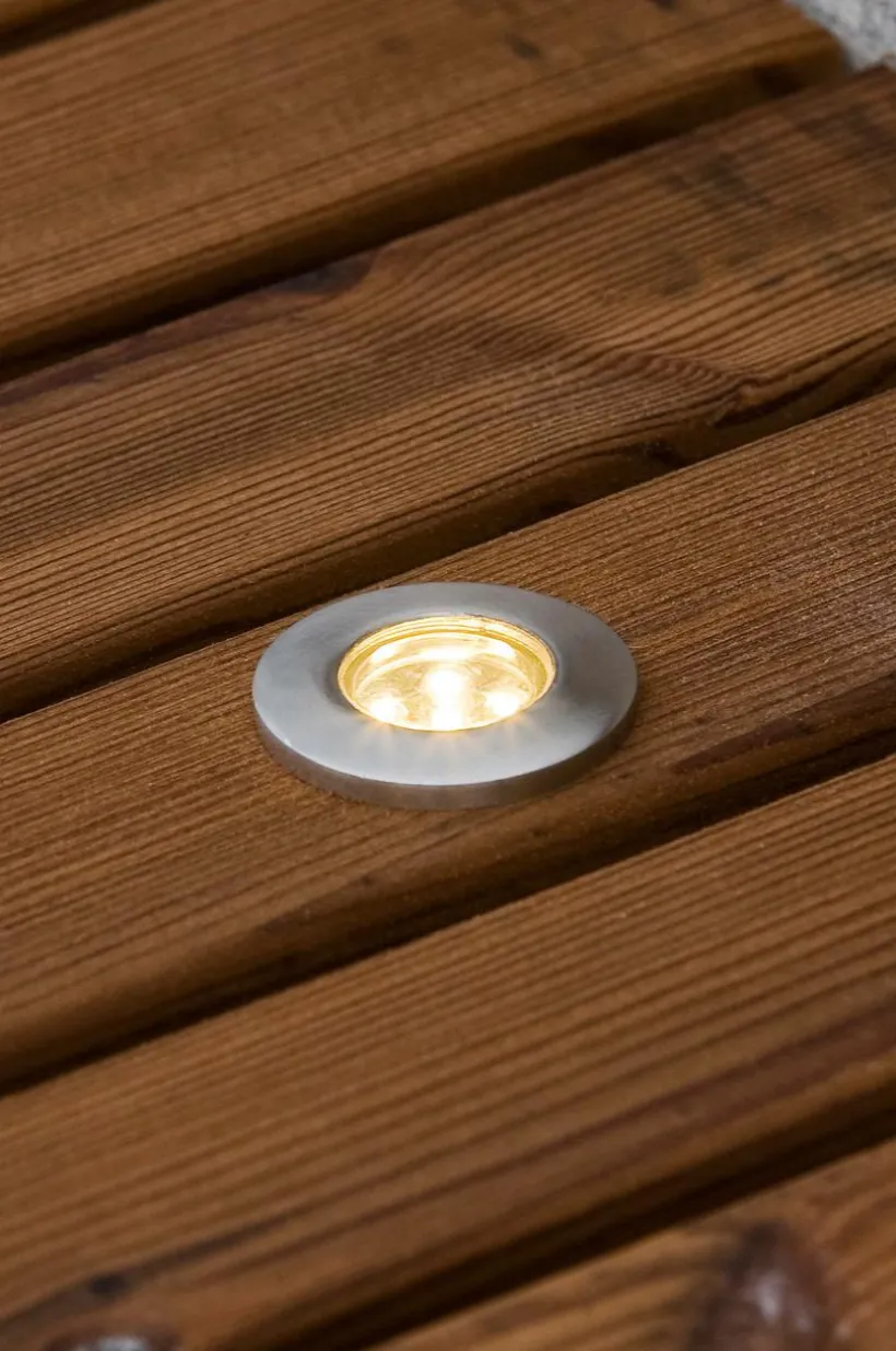 Mini markspot för tralldäcket som ger ett härligt ljus i mörkret. Tillverkad i rostfritt stål och har en plan topp. Ett set med6x0,36wled ljuskällor. 12v 6st/set plan topp inkl. Transformator 3,5 cm i diameter och 4 cm hög.