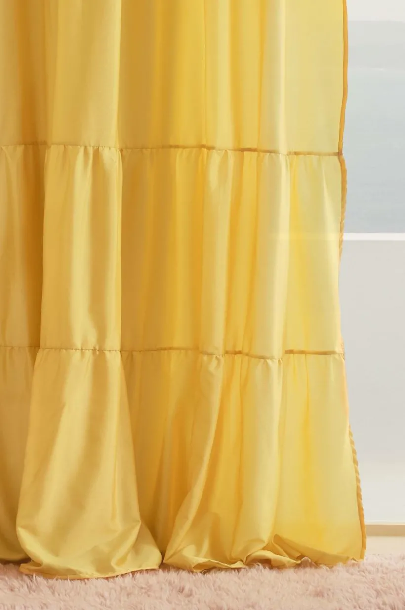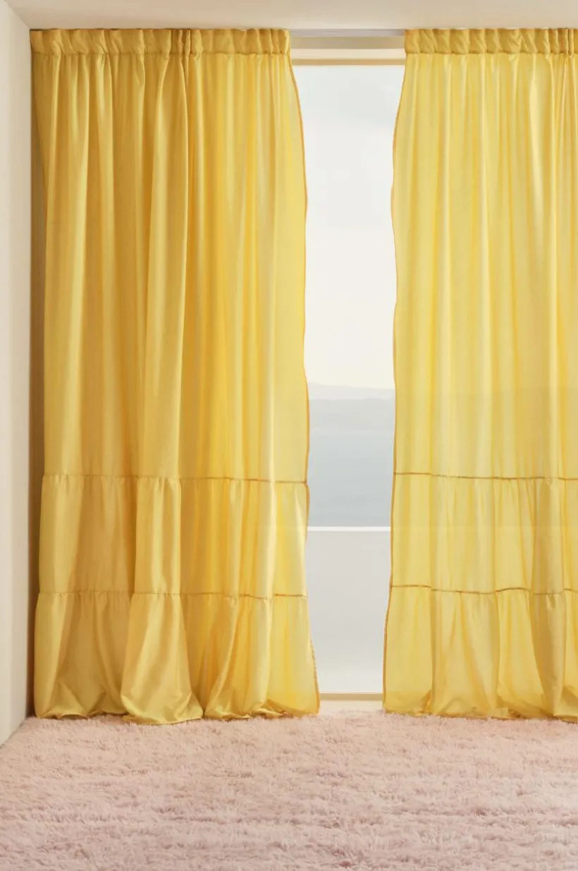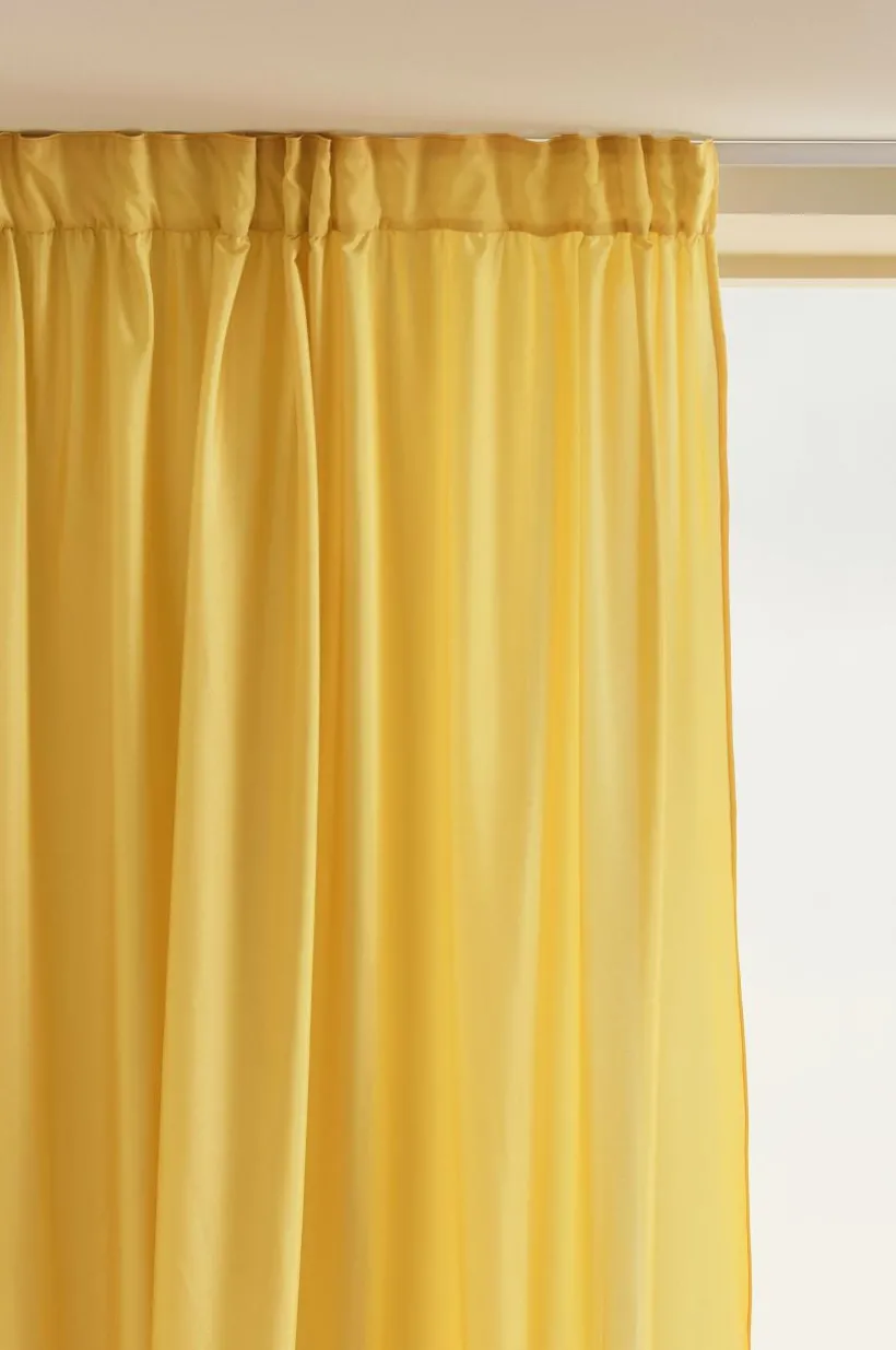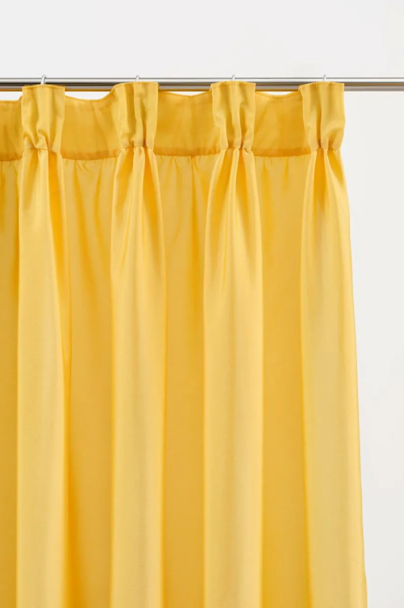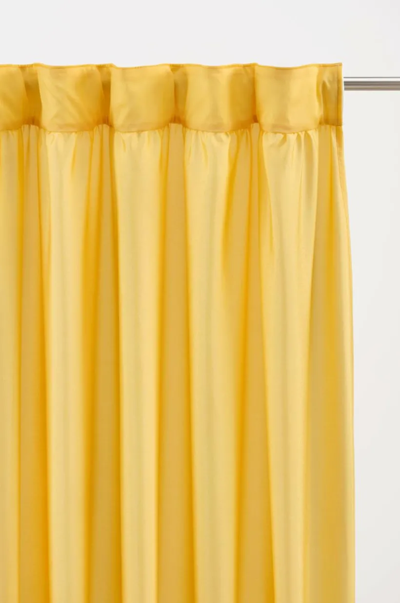 Två gardinlängder i enfärgat tyg av polyester i fina färger som skimrar och glittrar lite lätt. Längderna har breda volanger nedtill, en fin detalj som gör längderna speciella. Påsytt multifunktionsband upptill. Gardinen kan hängas upp med fingerkrokar, kanal samt dold hälla.