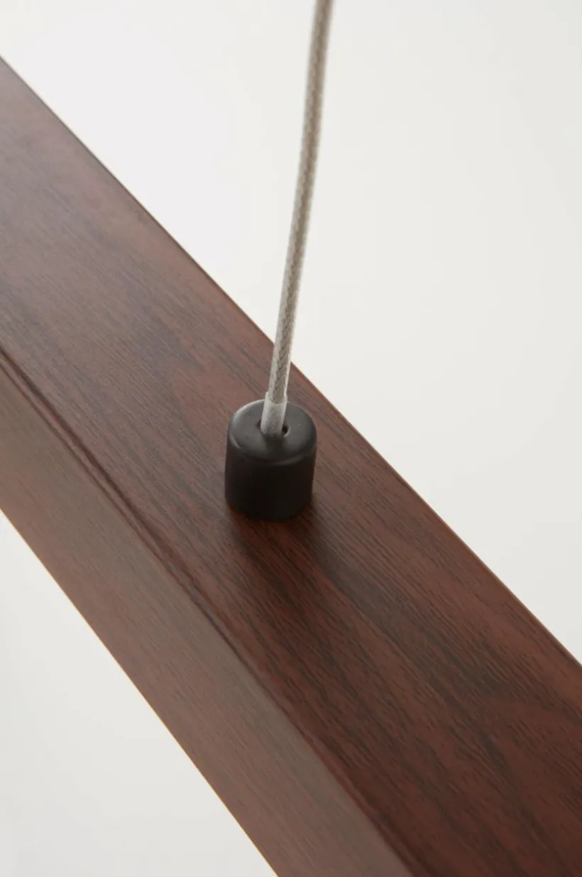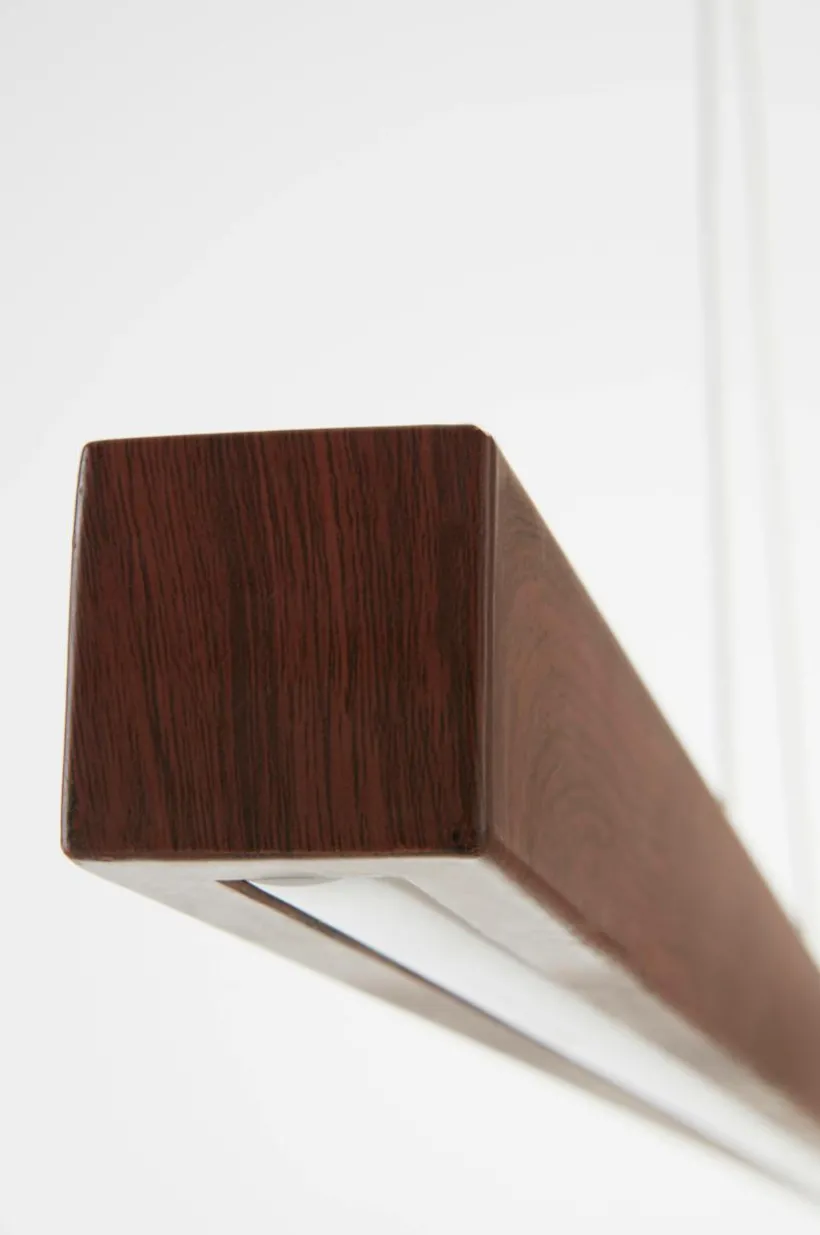 Taklampa av valnötsmönstrad stål med LED-belysning. METIS har ett stilrent och grafiskt uttryck som ger ditt rum trendig belysning på ett smakfullt sätt. Denna typ av linjär armatur passar som arbetsbelysning ovanför en köksö eller ett skrivbord likväl som ovanför matbordet. Ytan har tryckt mönster. Den smäckra lampan hänger i vajrar från takfästet och höjden är justerbar. Transparent sladd. Svart takkopp av stål med krok för upphängning.