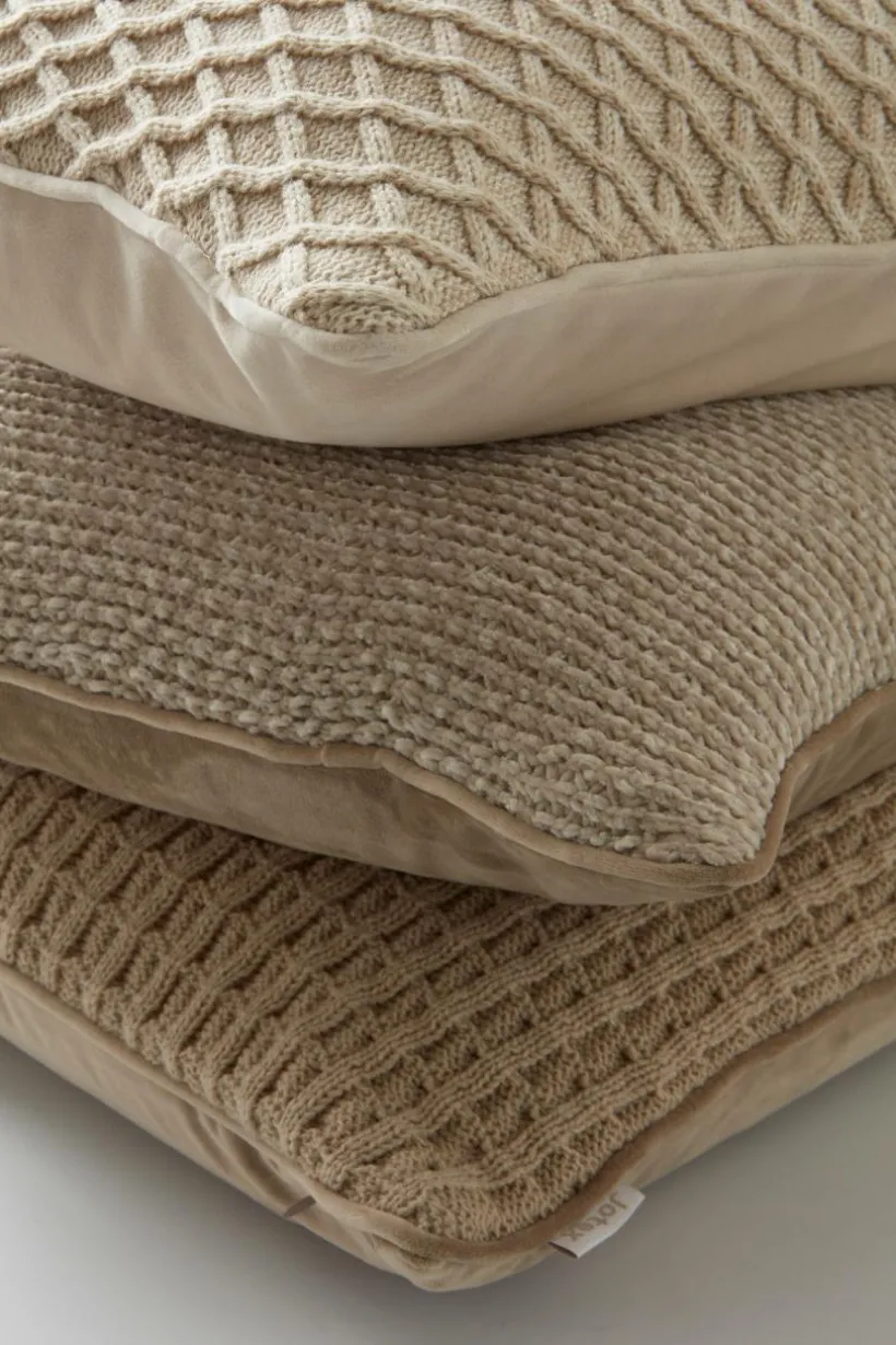 3-pack kuddfodral med stickad framsida. Baksidan är i skimrande sammet. De tre kuddfodralen är olika och matchar varandra perfekt, två är kvadratiska och ett är rektangulärt. Kuddfodralet har en liten kant runt om och en dragkedja i nederkant.