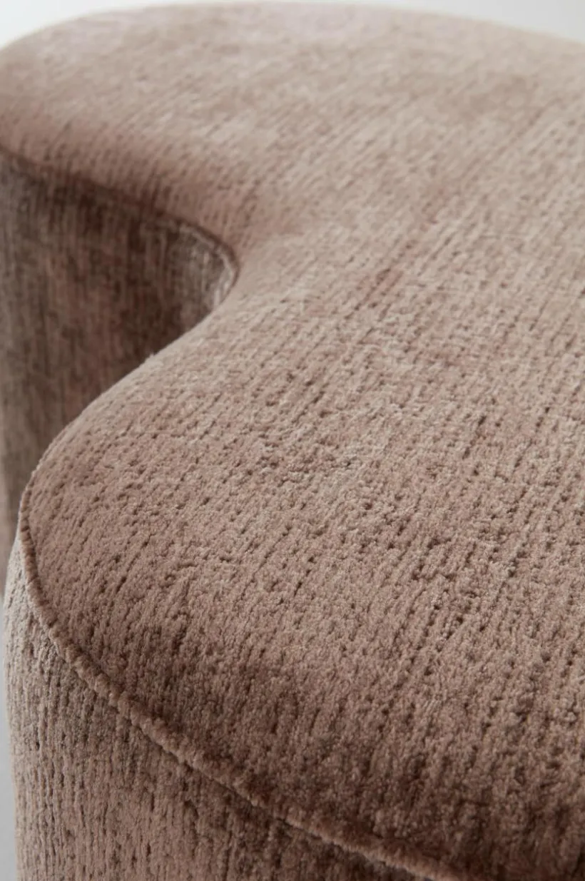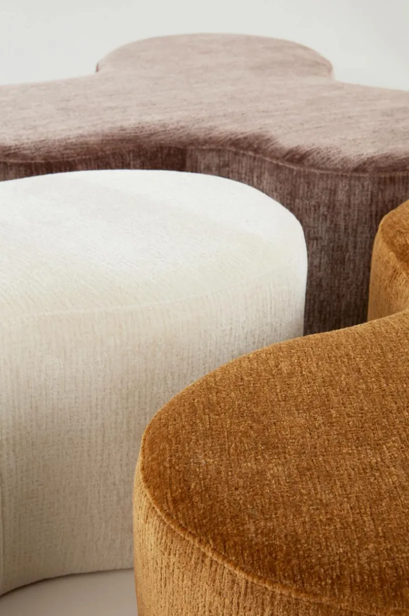 MINTAKA är en läcker sittpuff, kanske du tänker på en treklöver eller en blomma? Formen är speciell och klädseln är minst lika speciell. Den är i ett mjuk chenilletyg med oregelbunden struktur och fin glans. Chenille innebär att tyget är vävmönstrat med inslag av sammetsgarn. Tyget är av återvunnen polyester i härliga färgval och den har slitstyrka på 55000 Martindale.