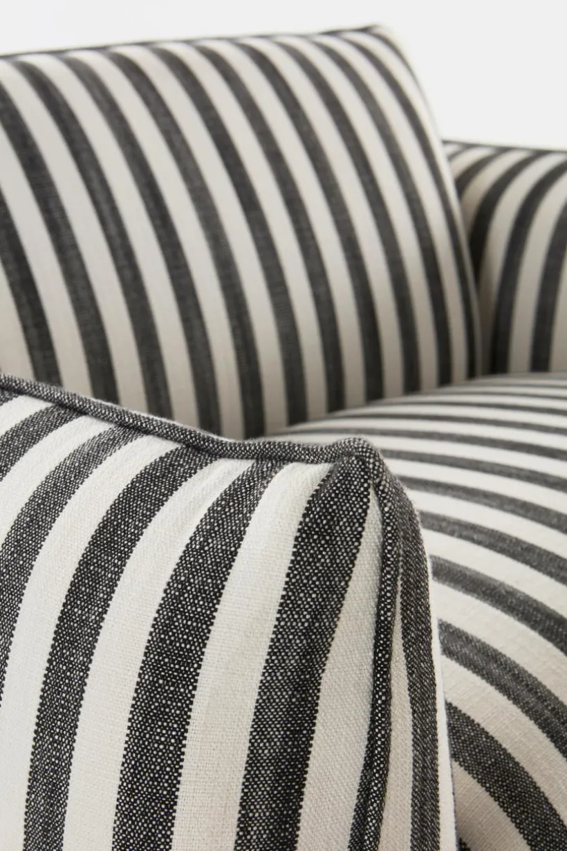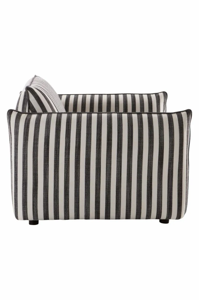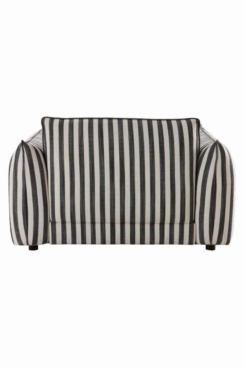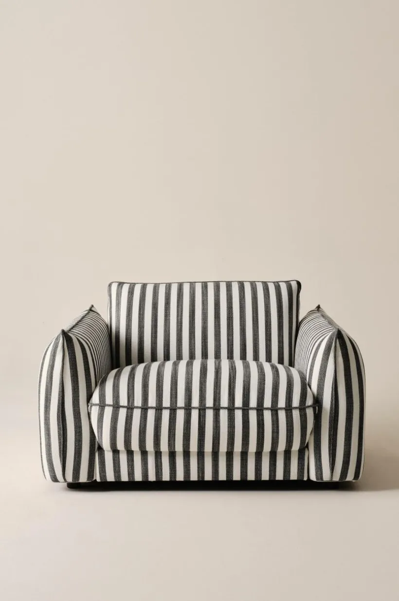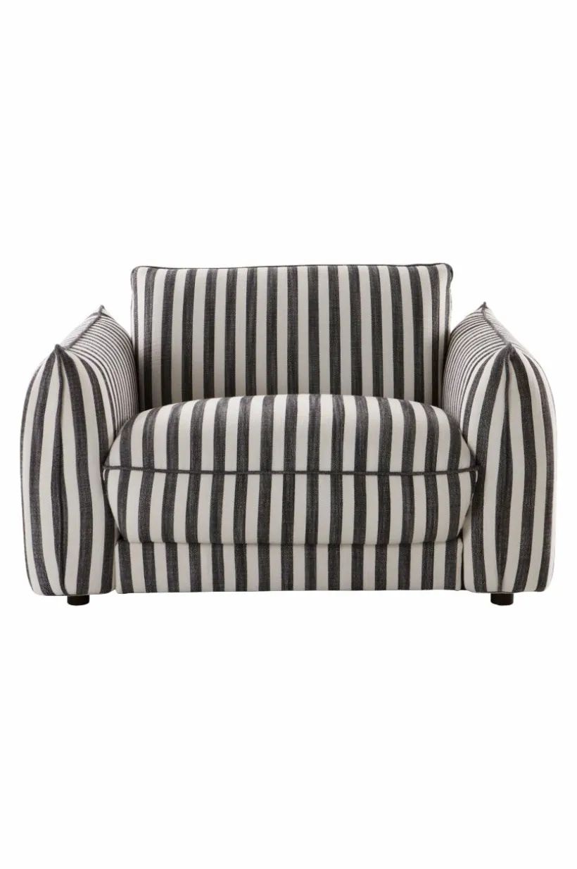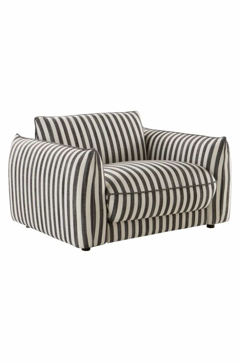 Rymlig fåtölj med stora, fylliga kuddar och mjuka, fina former. Designen är både tilltalande och avslappnad med runda former och stilren randig klädsel. Fåtöljen har en stabil ram av furu och plywood. Sittdelen är tillverkad av kallskum och sicksackfjädring, vilket ger god sittkomfort, MOLTON är en fåtölj som passar perfekt när det är dags att träffa vänner, kanske är det lite partyspel på gång?