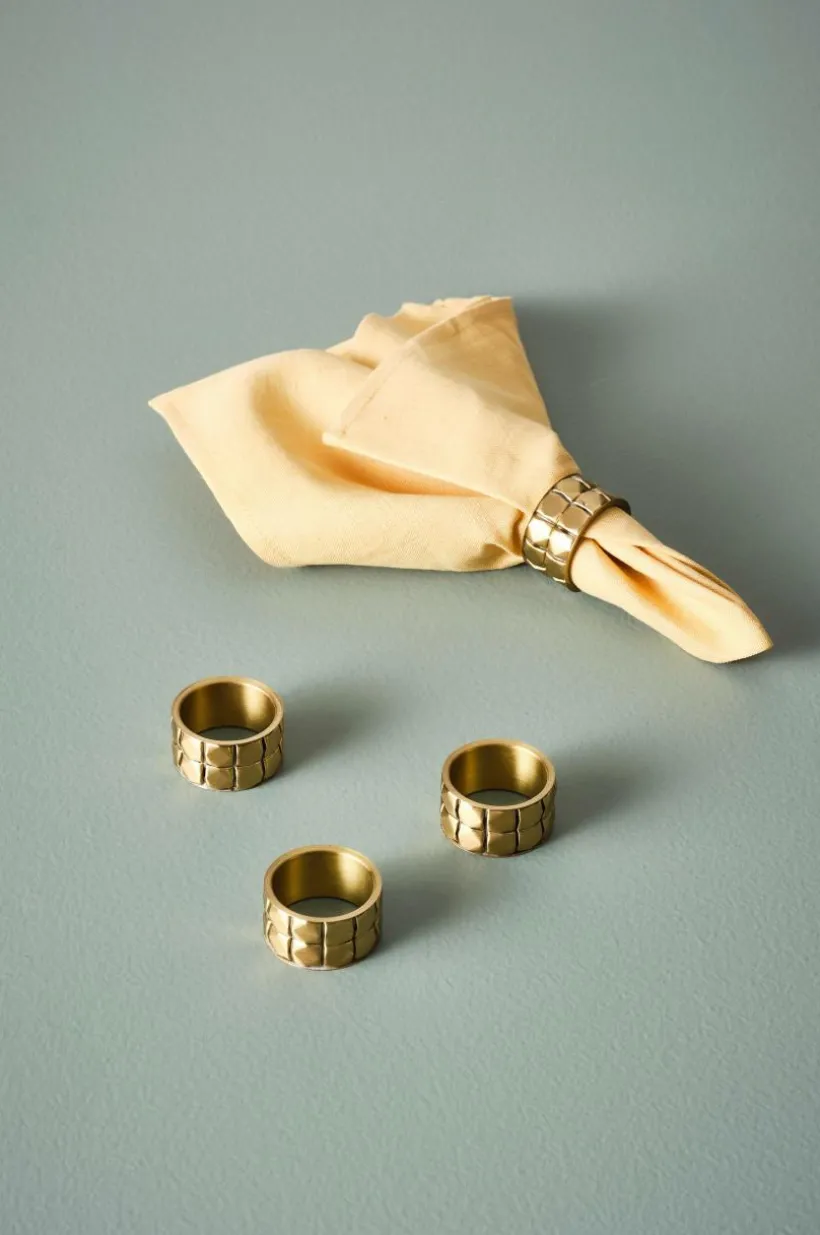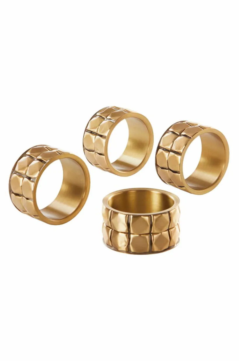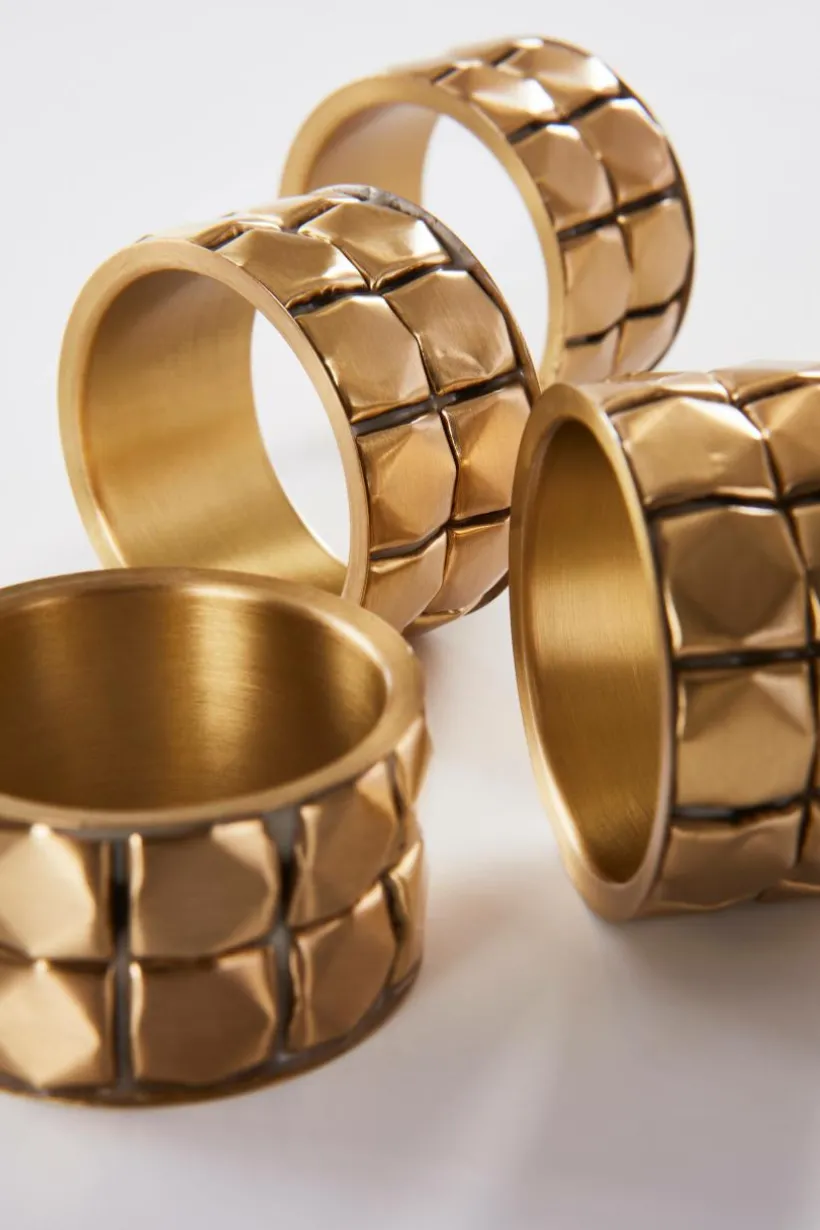 4-pack servettring av mässing med dekorativt reliefmönster.