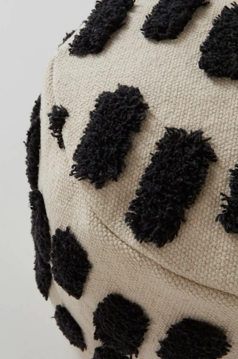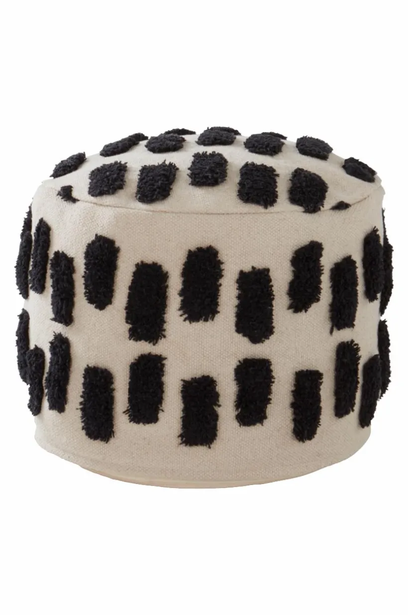 Rund puff av kraftigt, vävt tyg med tuftat mönster, luggen bildar kvadrater på den linnefärgade botten. Puffen har en innerkudde med mjuk stoppning av polystyrenkulor som formar sig bekvämt när du sitter på den. Dragkedja längs nederkanten, så du kan ta av överdraget. Lugghöjd 1 cm.