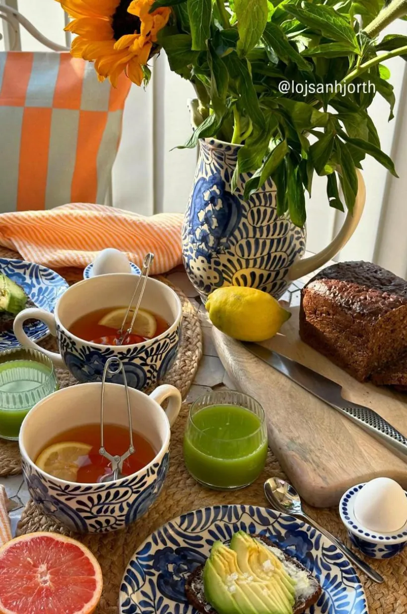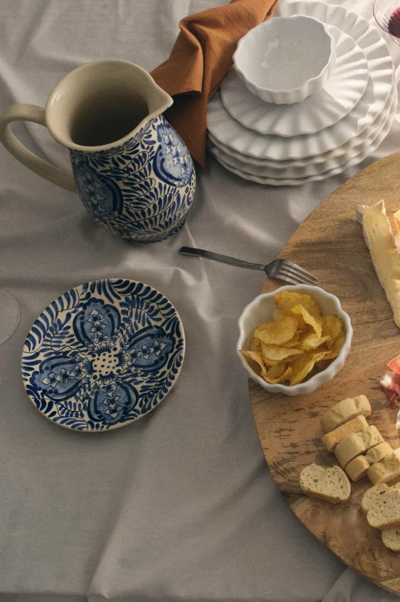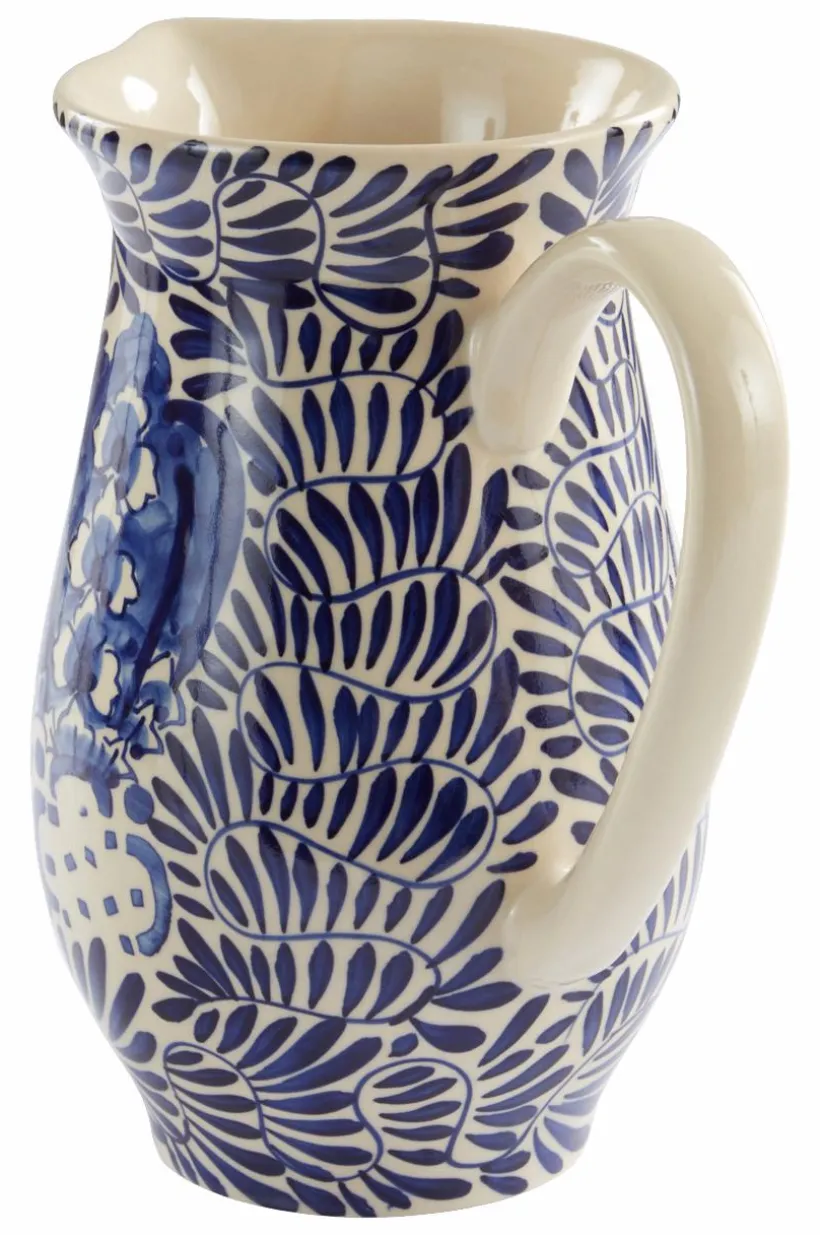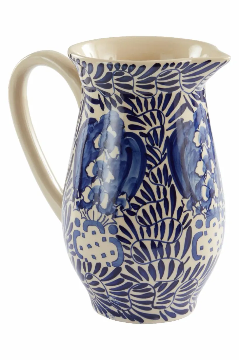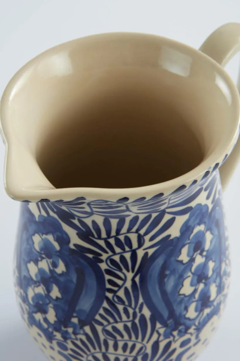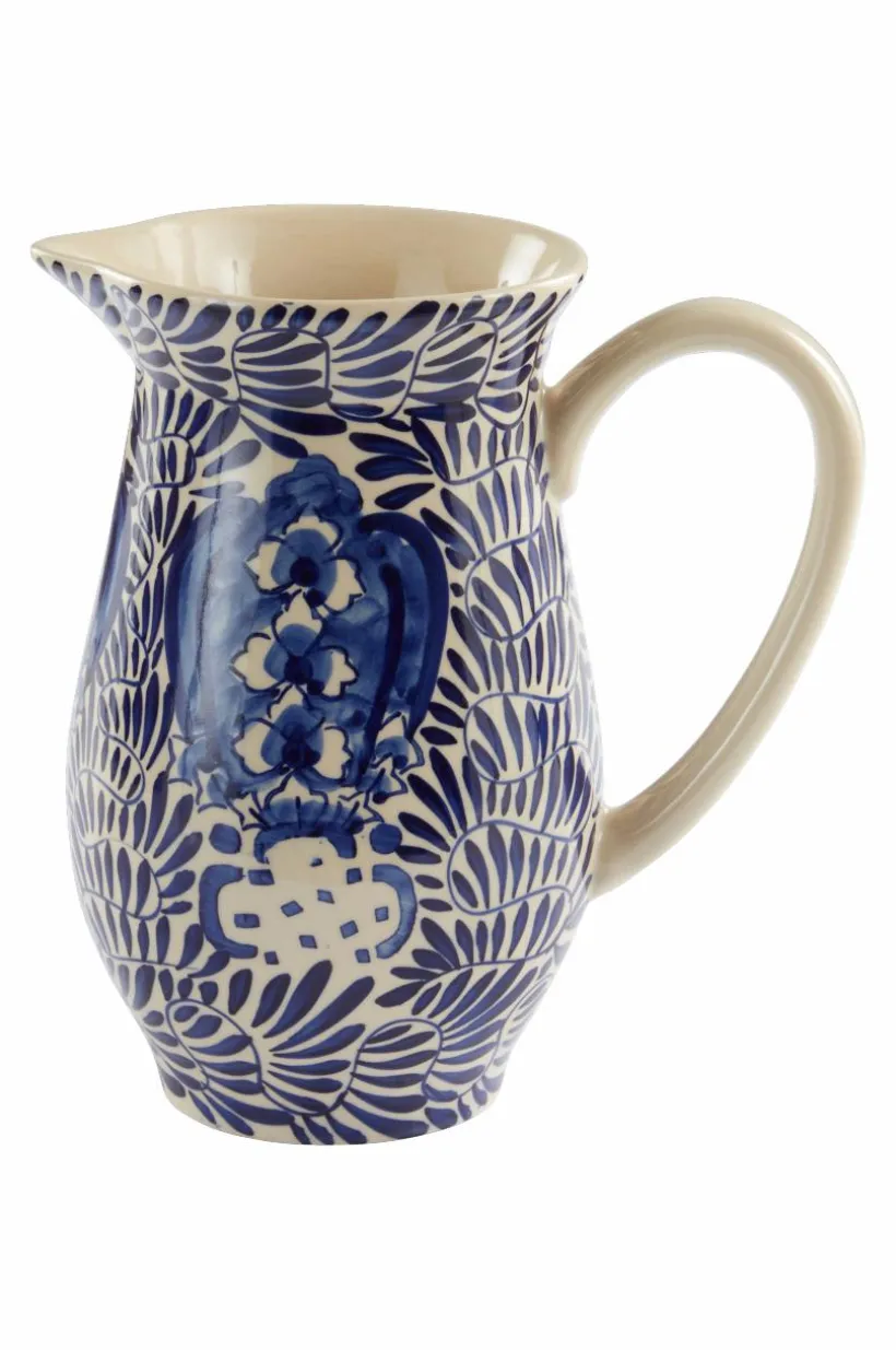 Kanna i keramik med handmålad blomdekor i blå nyanser på naturvit botten. Kannan har vacker form med ett greppvänligt, enfärgat handtag i naturvitt.Insidan är glaserad och naturvit. Det fina hantverket med handmålad dekor gör att varje del är unik.