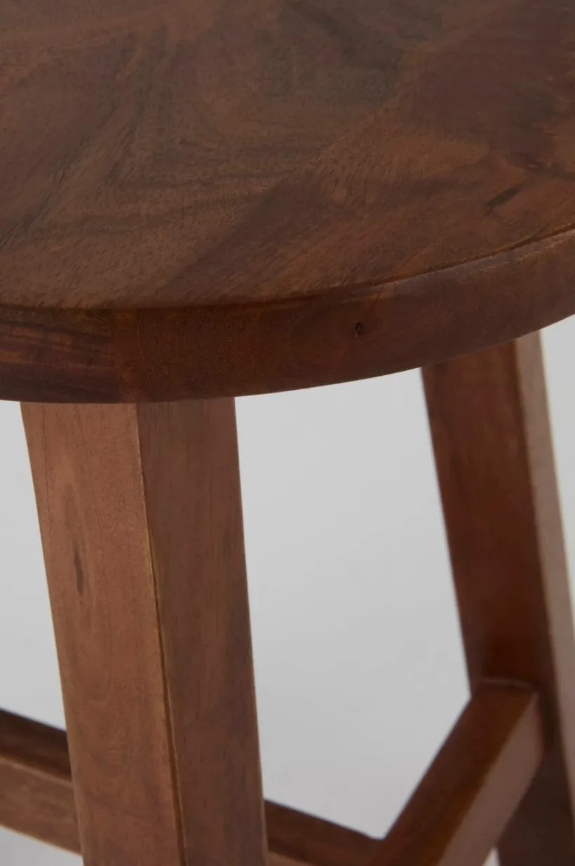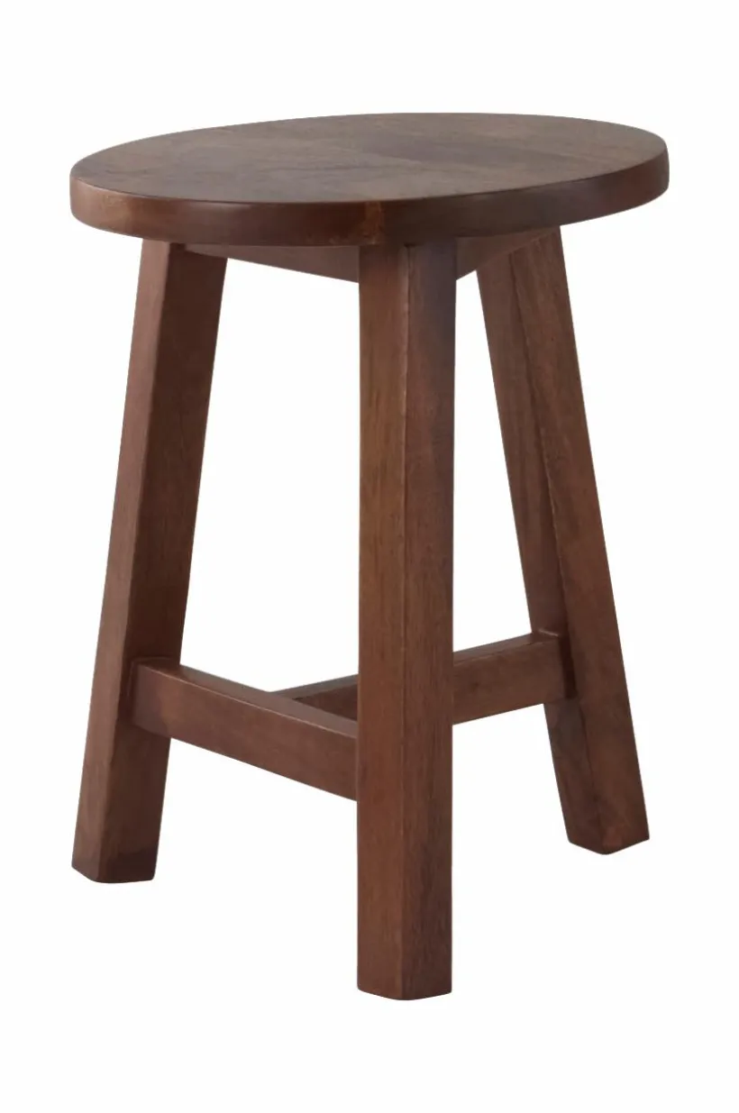 OLDEN pall. Tillverkad helt i mangoträ. Har en rik brunbetsad finish. Med tre robusta ben är den ett elegant tillskott till alla kök. Den här pallen är perfekt för moderna och trendiga utrymmen och ger en touch av naturlig elegans. OLDEN-pallen är mångsidig och elegant och förenar form och funktion på ett sömlöst sätt.