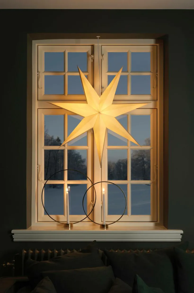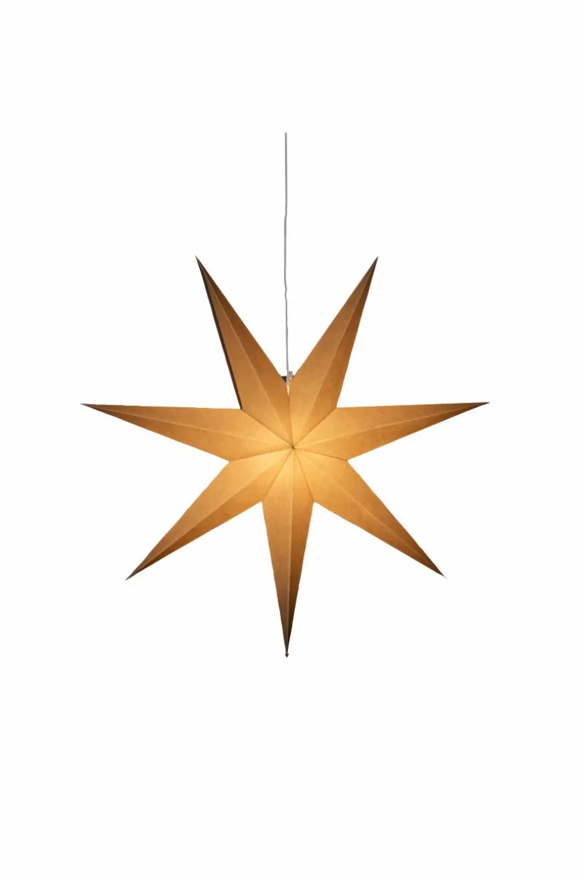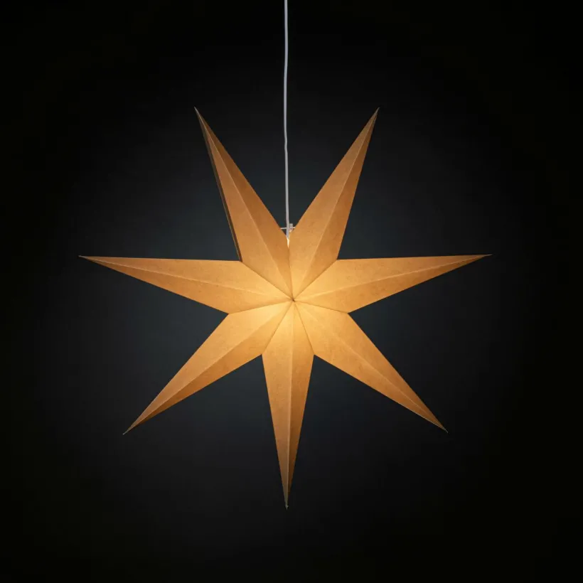 Hängande pappersstjärna med 7 uddar. Sladdställ med 5 meter anslutningssladd ingår, E14-sockel. Sladdströmbrytare. Diameter 78 cm