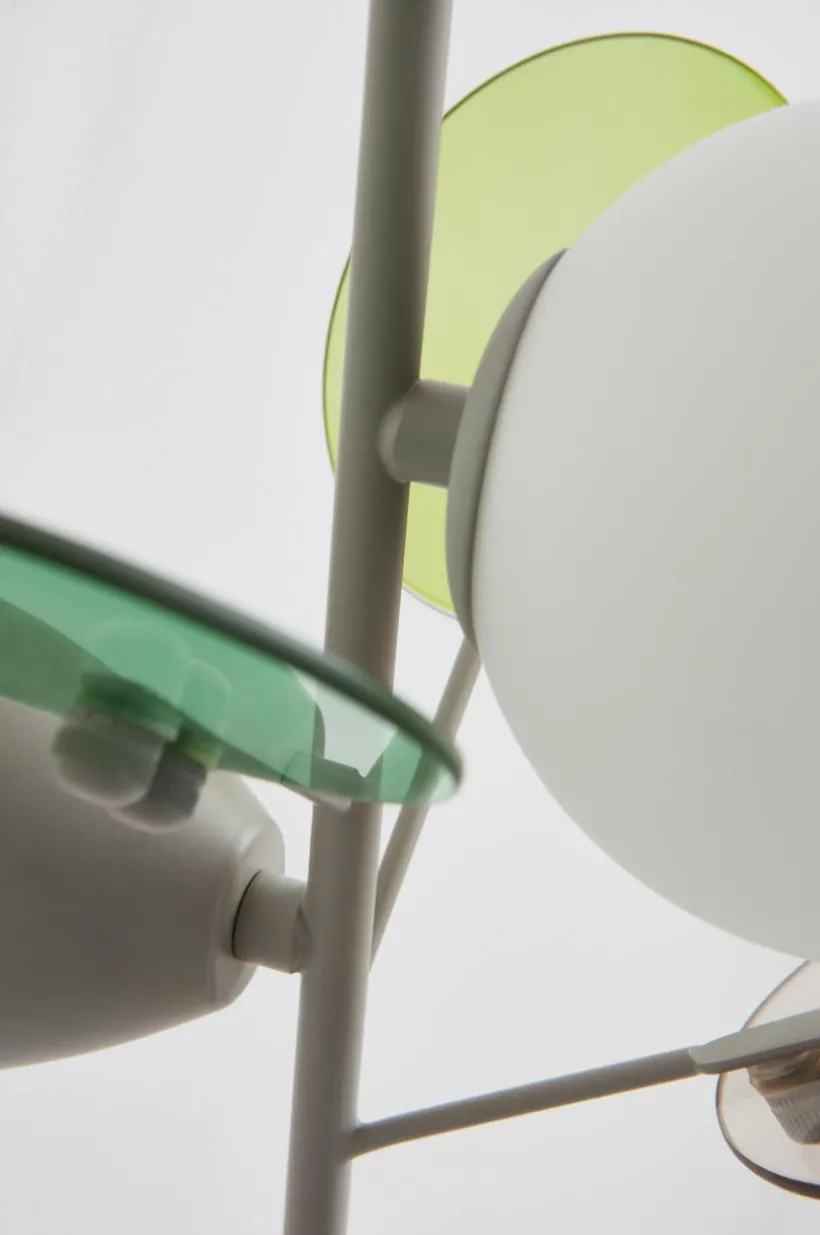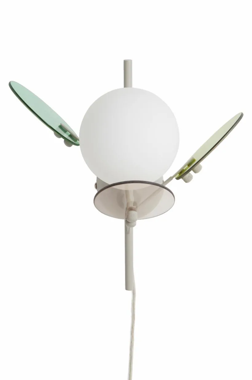 Vägglampa i lekfull modell som utmanar fantasin. Kupan är av vitt opalglas och runt kupan svävar tre dekorativa glasblad i väl kombinerade färger. Fäste och stomme är av järn som lackats i matchande färg med satinlyster. PETAL är både spännande och dekorativ och blir ett smycke på din vägg. Sladden har väggkontakt och strömbrytare.