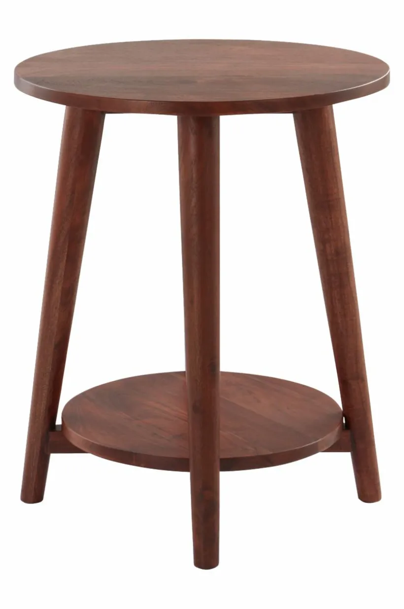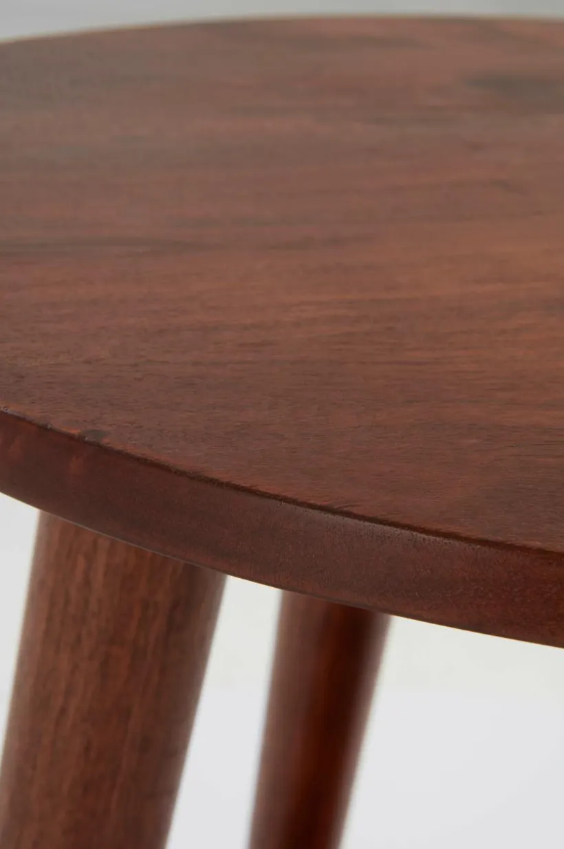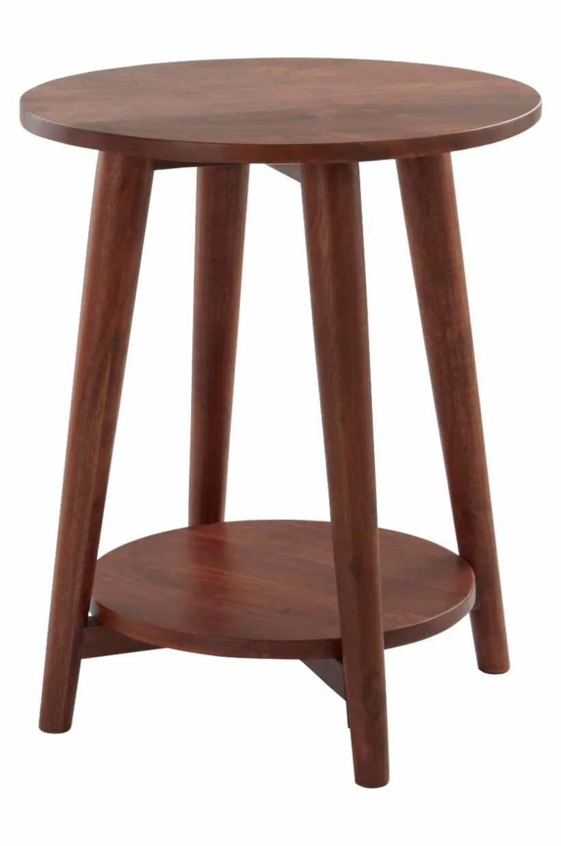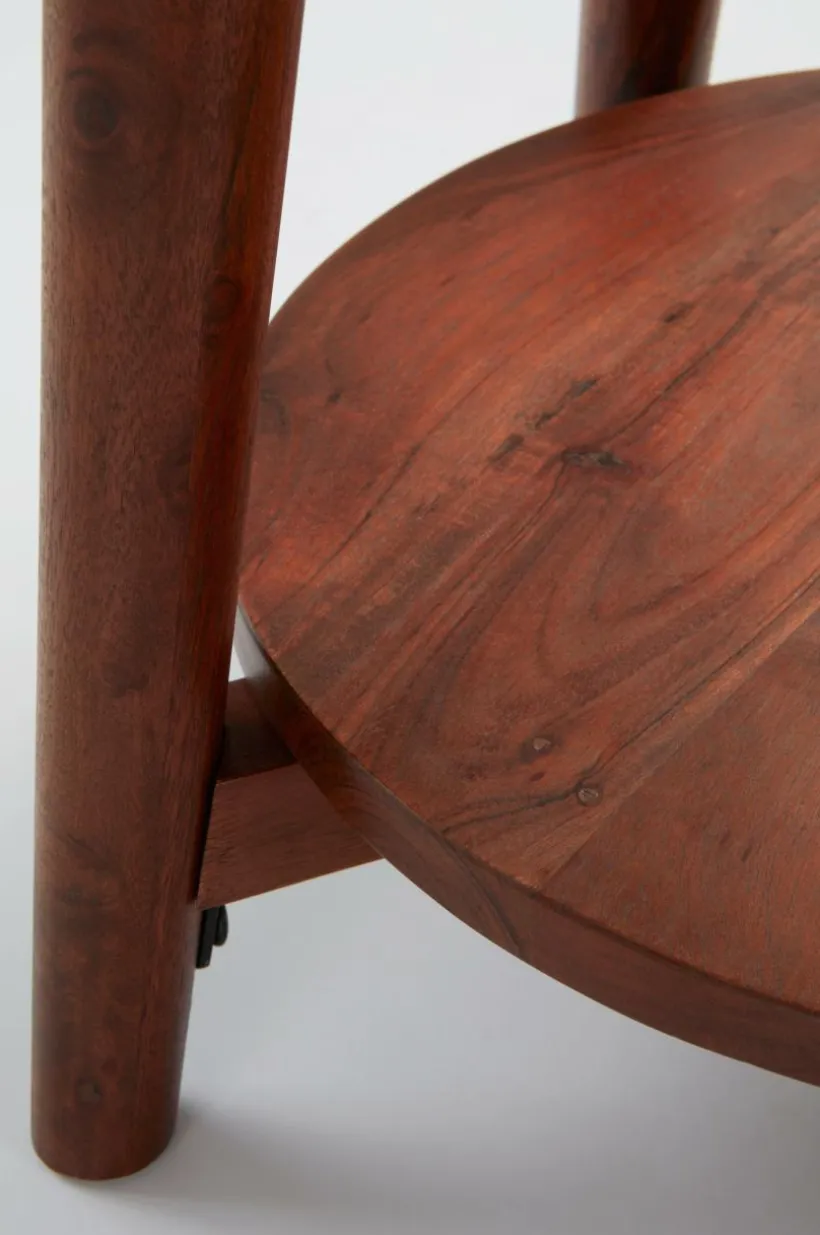 Rustikt sidobord av massivt mangoträ med ytbehandling som ger träet vacker färgton och som gör att den fina ådringen bibehålls. Det runda bordet har fyra lätt utställda ben och en avlastningsskiva nära golvet. Det här bordet är också fint som piedestal med en lummig växt på varje bordsskiva, gröna växter ger rummet en inbjudande känsla. Viss montering krävs. Monteringsanvisning medföljer.