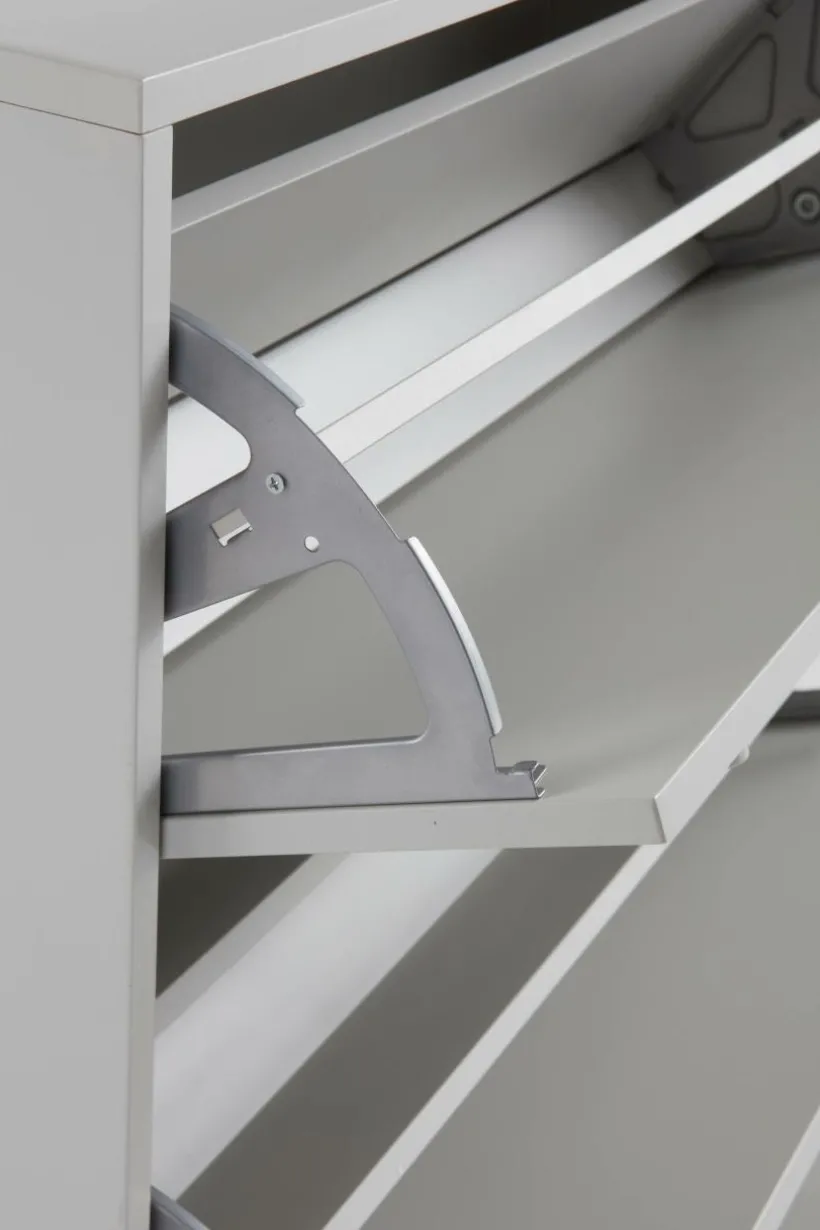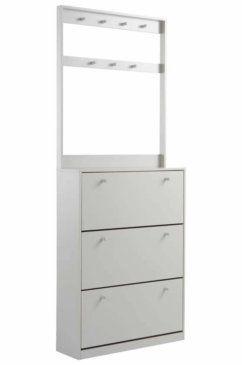 Hallmöbeln har tre skofack som är mycket praktiska och de tippas ut med mjukstängande gångjärn. Eftersom skorna förvaras stående rymmer den många par skor och tar ändå liten plats i hallen. Facken kan justeras för lite högre skor. Upptill har möbeln två knopplister med fyra respektive tre hängare där du kan hänga allt från jackor till sjalar och väskor. Hallmöbeln har väggfäste på baksidan. Viss montering krävs. Monteringsanvisning medföljer.