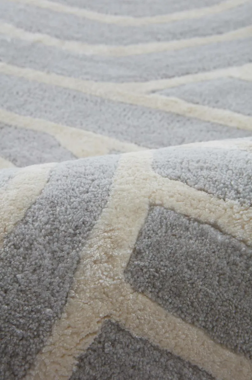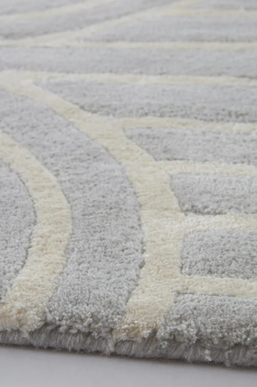 Handtuftad matta av viskos och ull i mjuk och behaglig mix. Mattan har ett vackert randmönster som bildar bågar, det geometriska mönstret förmedlar lugn och balans. Mattan är tätvävd och välarbetad. En handgjord matta är ett fint hantverk och varje matta är unik. Lugghöjd 0,8-0,9 cm. Tjocklek 1-1,2 cm. 3800-4000 g/m².