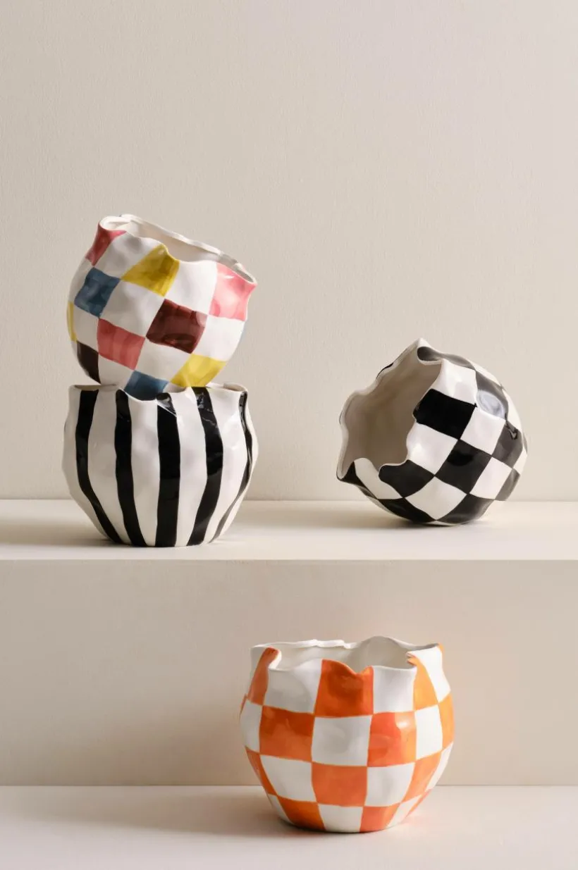 Handgjord keramikkruka i böljande, asymmetrisk form med randigt mönster, mönster och form står i fin kontrast till varandra. Krukan har en blank glasyr och även insidan är glaserad. RUTAN STRIP är vacker som dekoration även utan en växt.