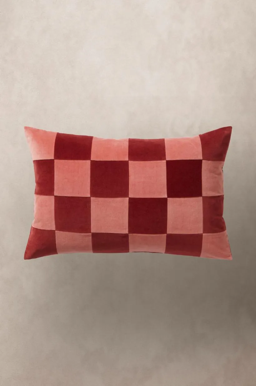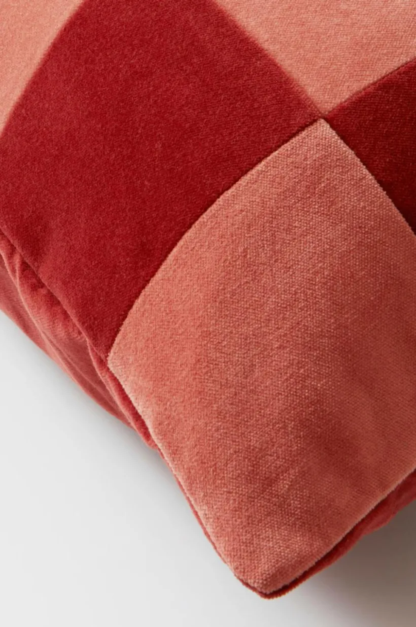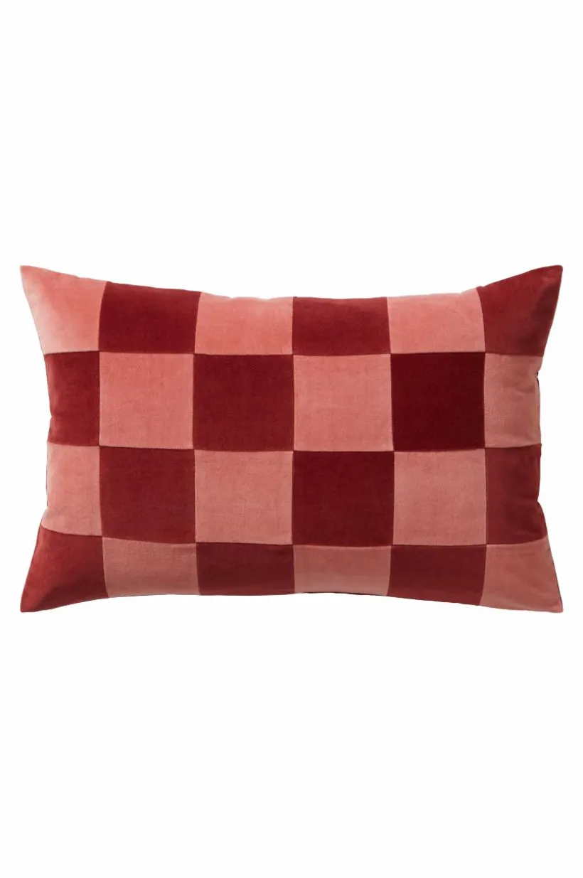 1-pack kuddfodral i mjuk sammet av bomull med matt yta. Framsidan på kuddfodralet är sytt i lapptäcksteknik och schackrutorna är i väl valda nyanser. Sammetstyget har fin lyster och rutorna skimrar i vackra nyanser med ljuset, tyget är tvättat för extra mjuk känsla. Baksidan är enfärgad i en av rutornas kulör. Dold dragkedja på baksidan. Kuddfodralet är fodrat med mikrofiber av polyester. Tygets gramvikt 230 g/m².