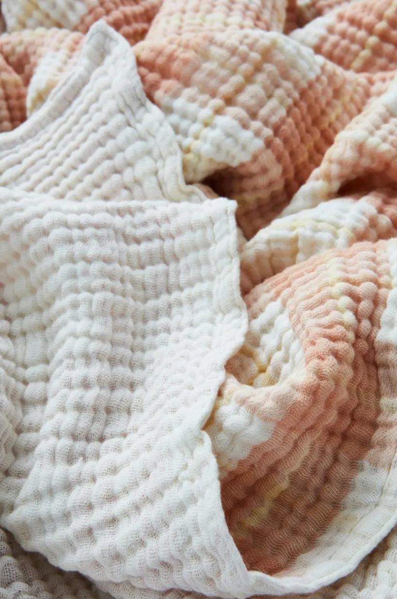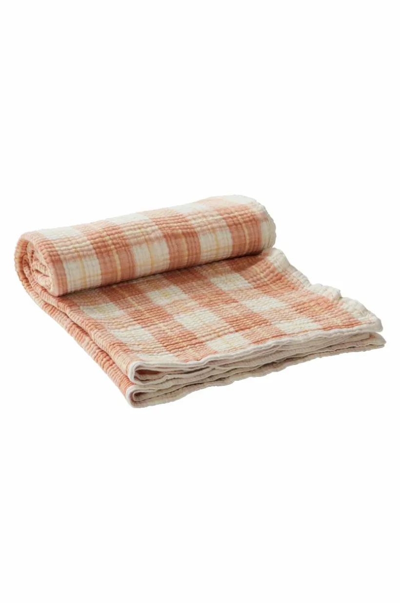 RUTHY är en härlig och luftig pläd i muslinkvalité av bomull med bandkant runt om. Muslin är en behaglig kvalité som vävts i flera lager, RUTHY är fyralagers och blir bara mjukare ju mer den används. Pläden är garnfärgad vilket innebär att garnet färgats innan vävning och pläden har rutig struktur. RUTHY är alldeles lagom tjock och värmer skönt, mycket tack vare luften som skapas i den speciella vävtekniken, gramvikt 210 g/m².