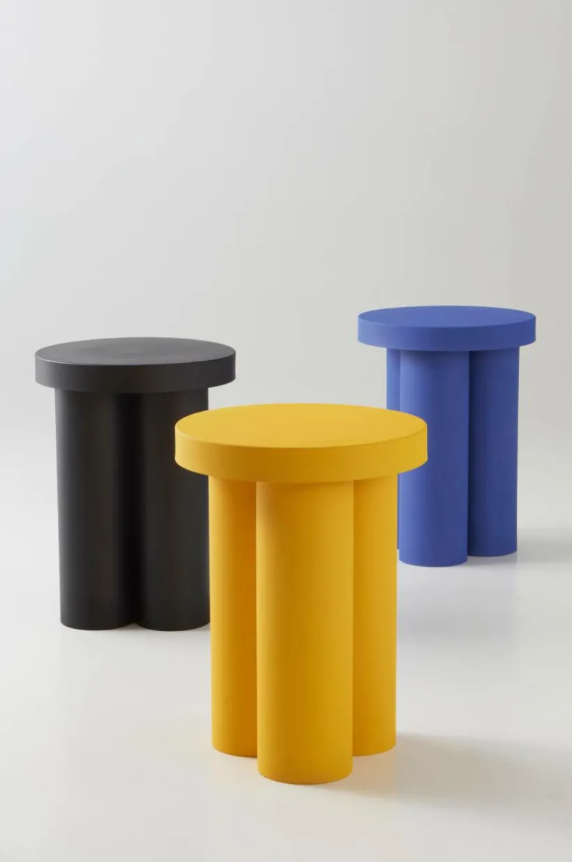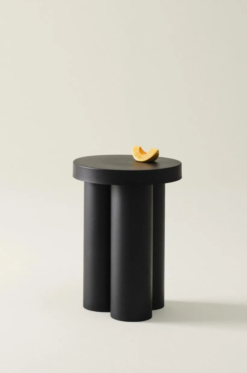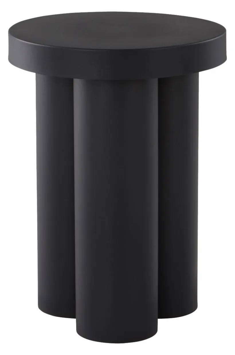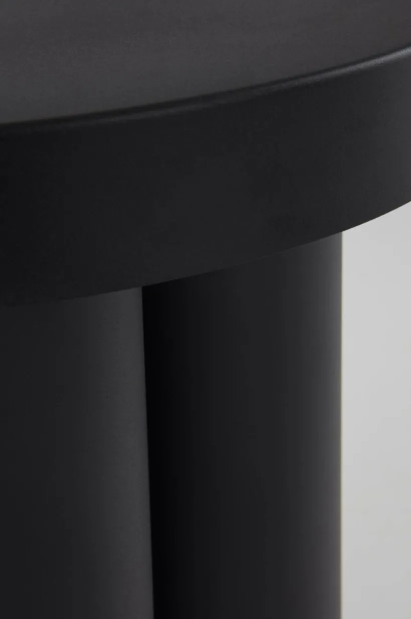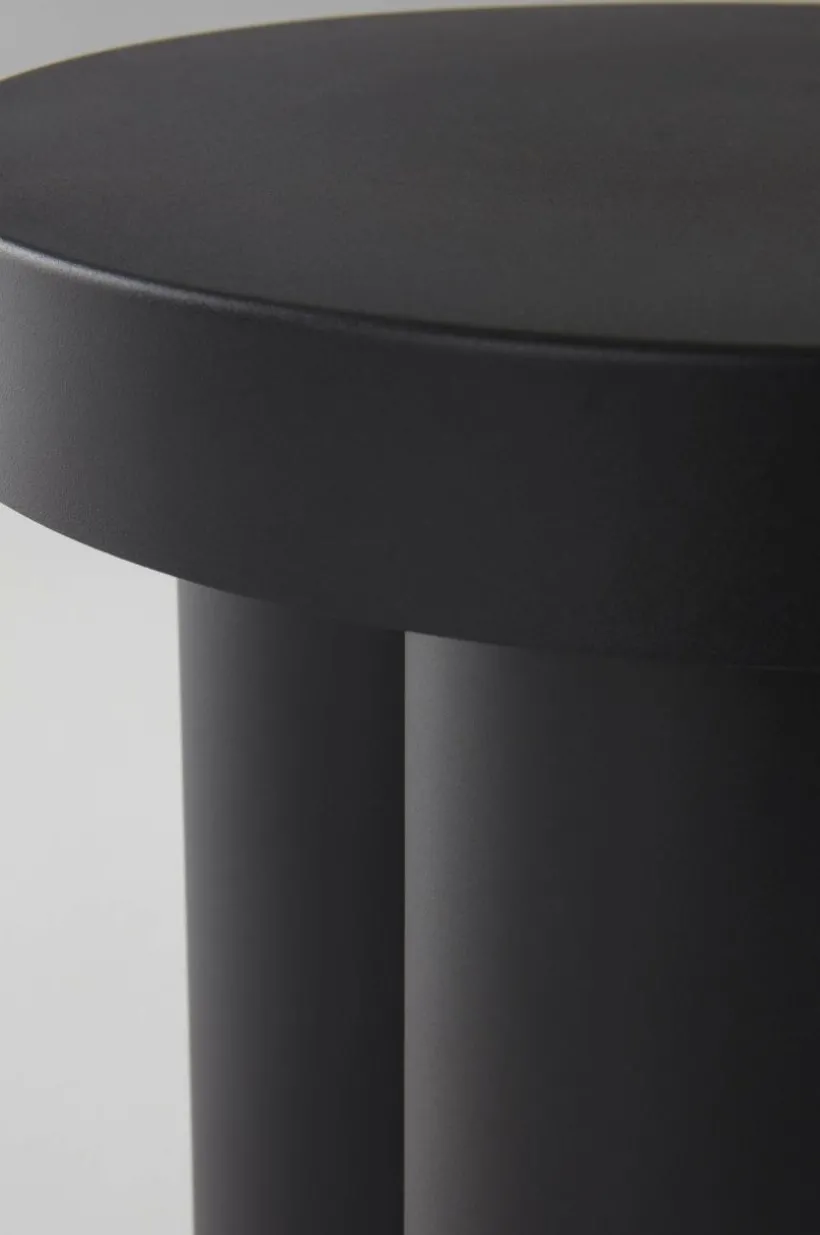 Sidobord av järn med pelarfot som består av tre runda rör tillsammans och på det en rund bordsskiva som kombinerats med snygga proportioner. Bordet är helt enfärgat och ytan har pulverlackerats med matt finish. Sidobordet skapar en lättsam och lekfull känsla i rummet.