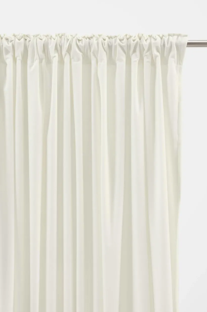 En gardinlängd i enfärgad sammet av polyester. Sammet har fin lyster och mjuk känsla, färgen skimrar vackert i olika ljus. Längden har påsytt multifunktionsband. Gardinen kan hängas upp med fingerkrokar, kanal samt dold hälla.