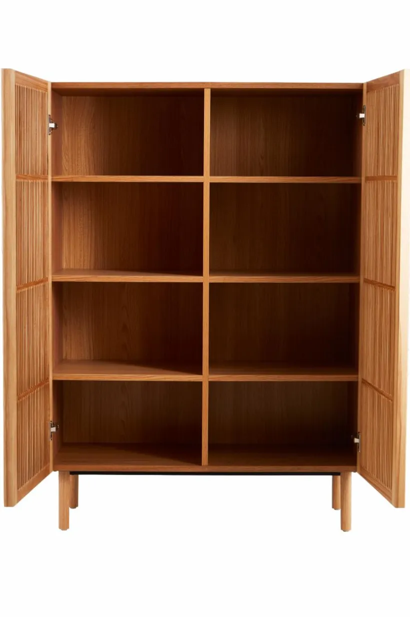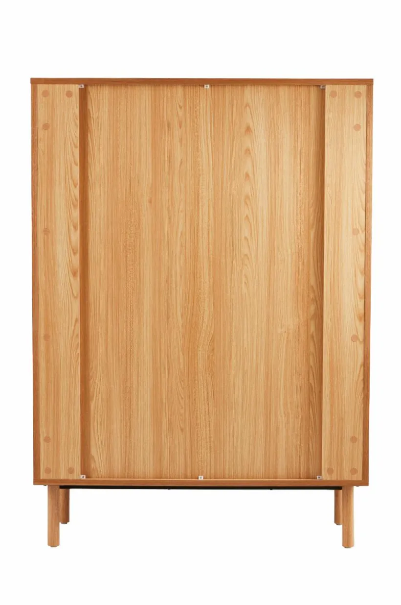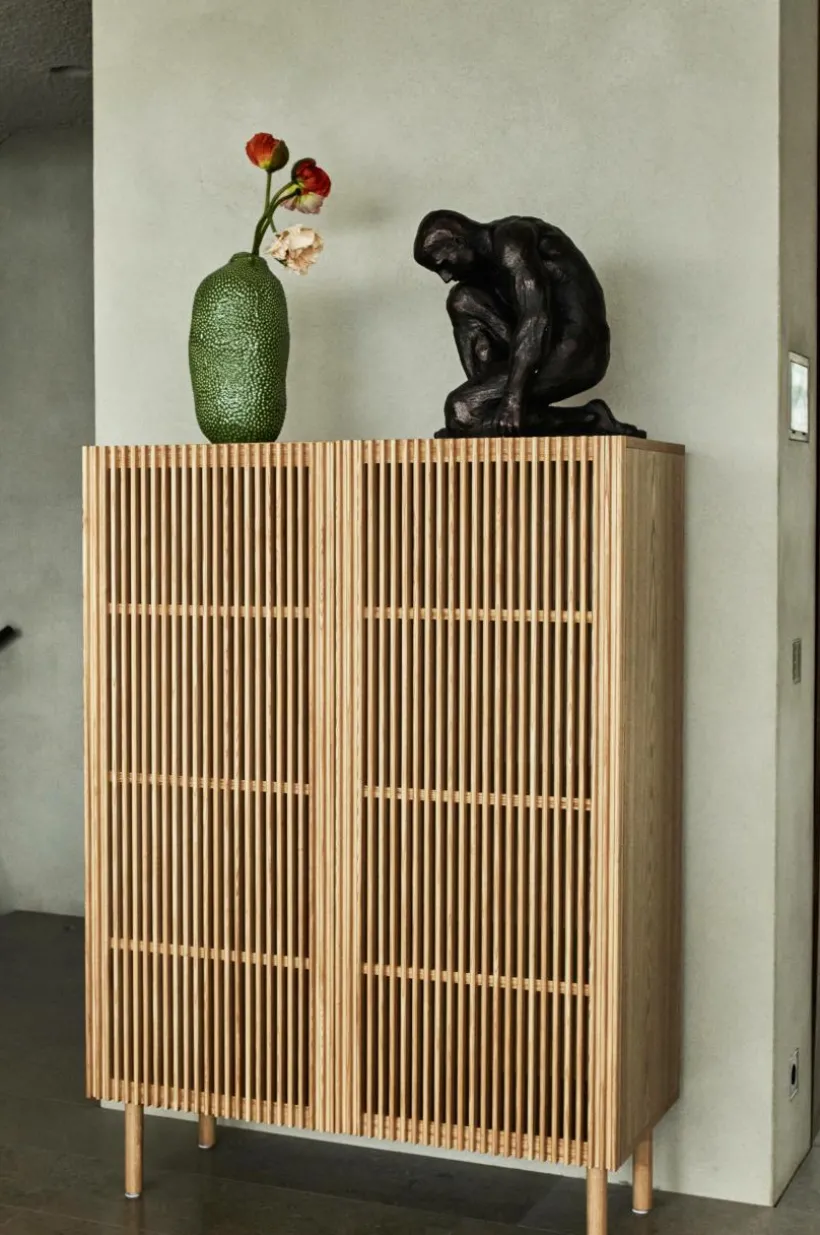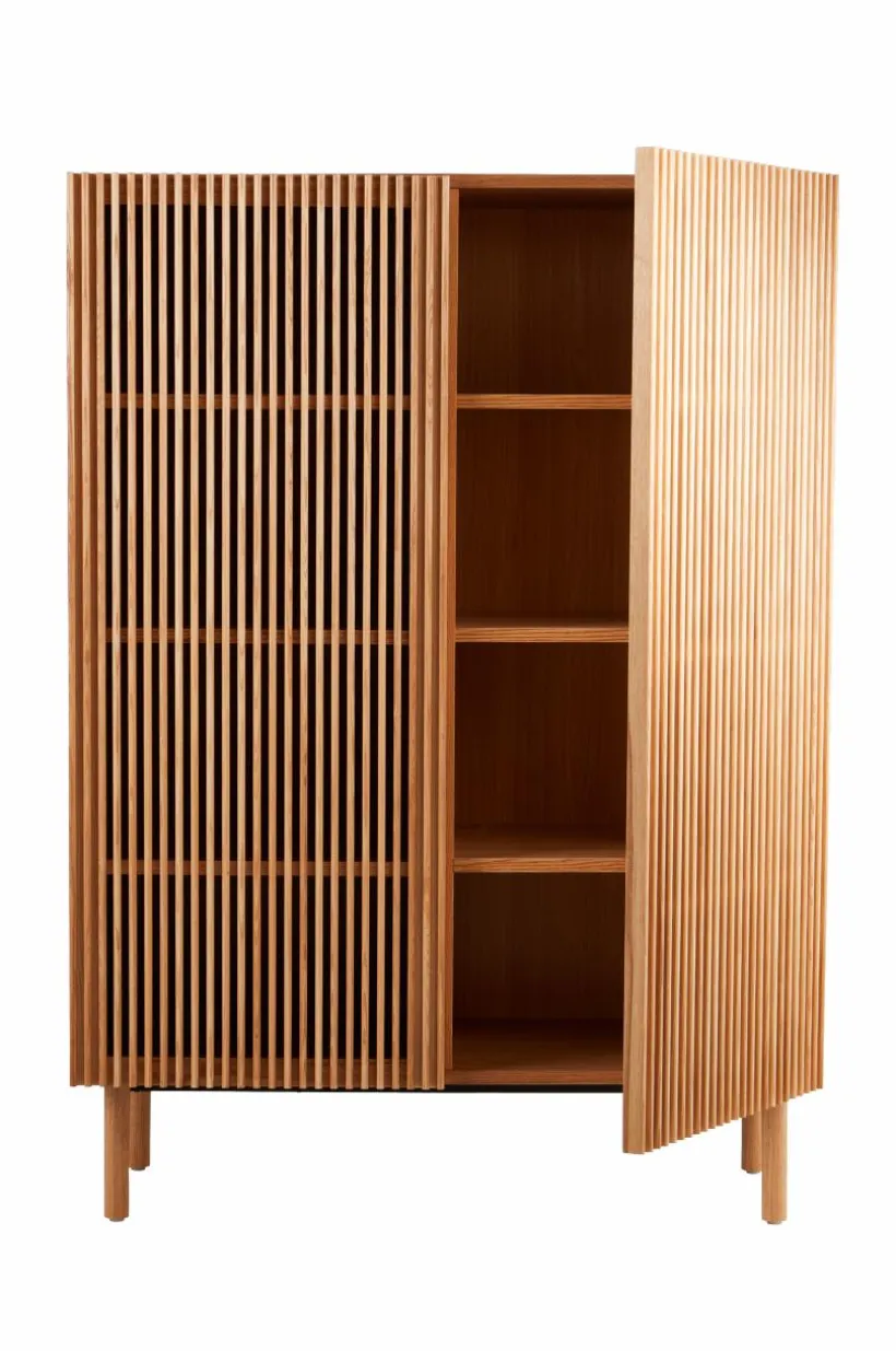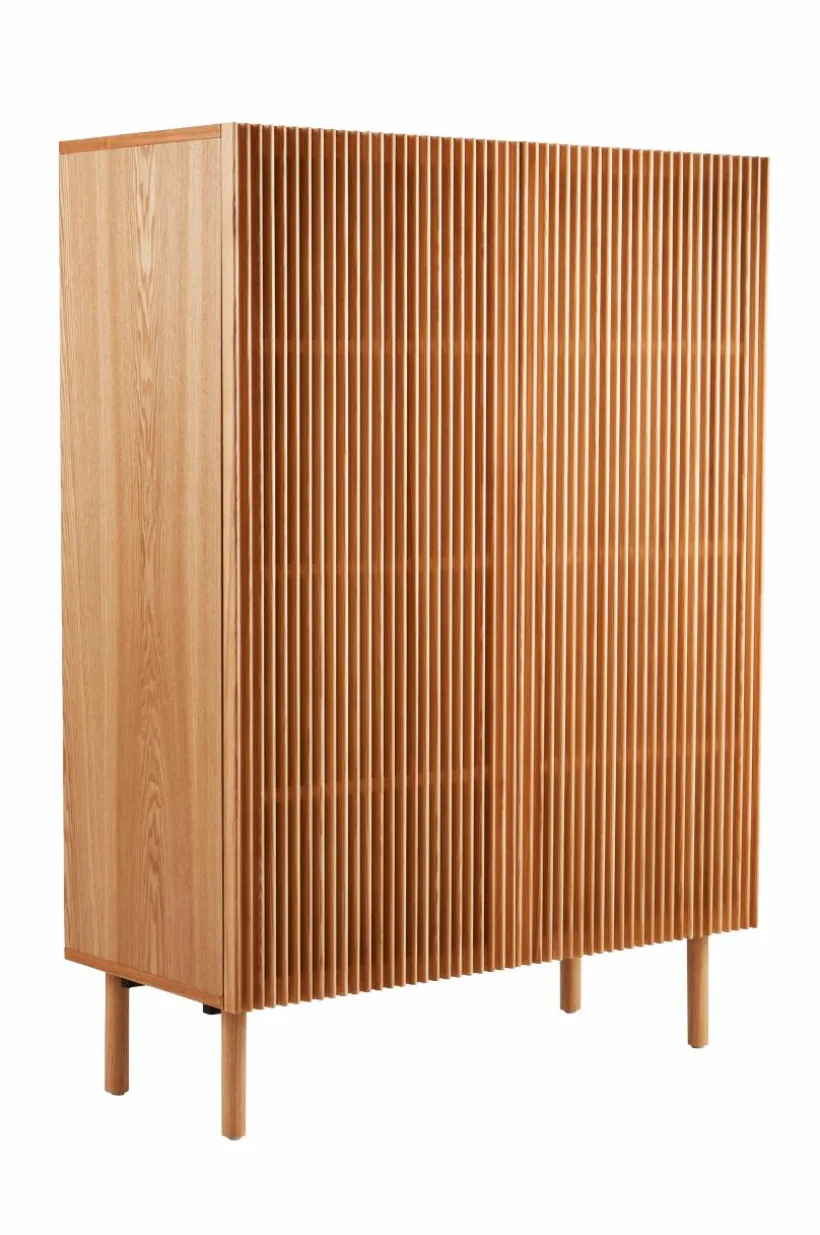 Skåp med dörrar och ben av massiv ask, stomme av MDF med askfaner. Skåpet ger en naturlig känsla i sin skandinaviska stil med en touch av retro. De stilrena dörrarna består av askribbor med rundad kant och lätt transparens uppstår i mellanrummen. Skåpet har tre fasta hyllplan. Raka, runda ben ger en nätt känsla. Skruvar medföljer. Viss montering krävs. Monteringsanvisning medföljer.
