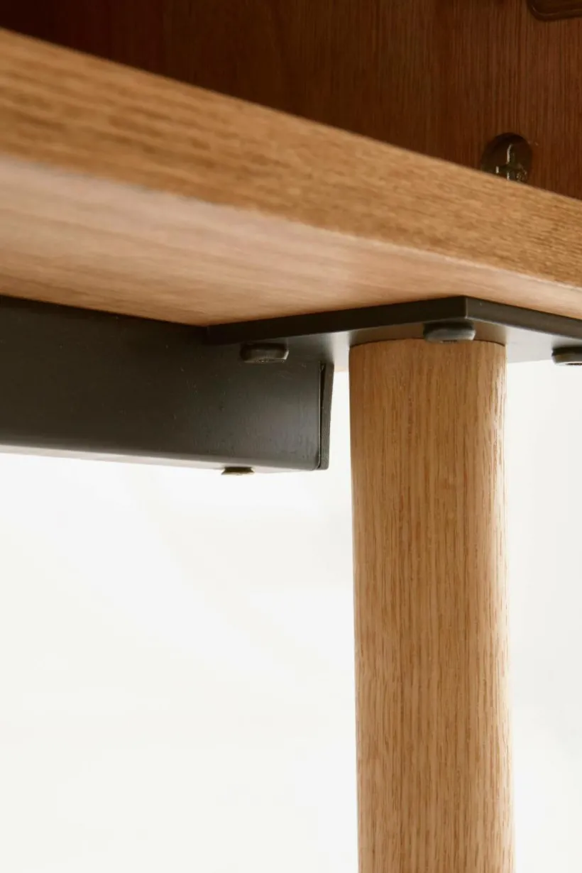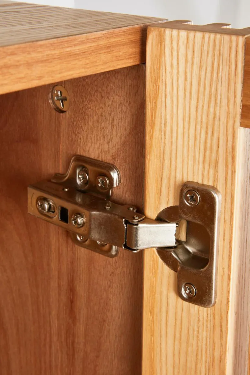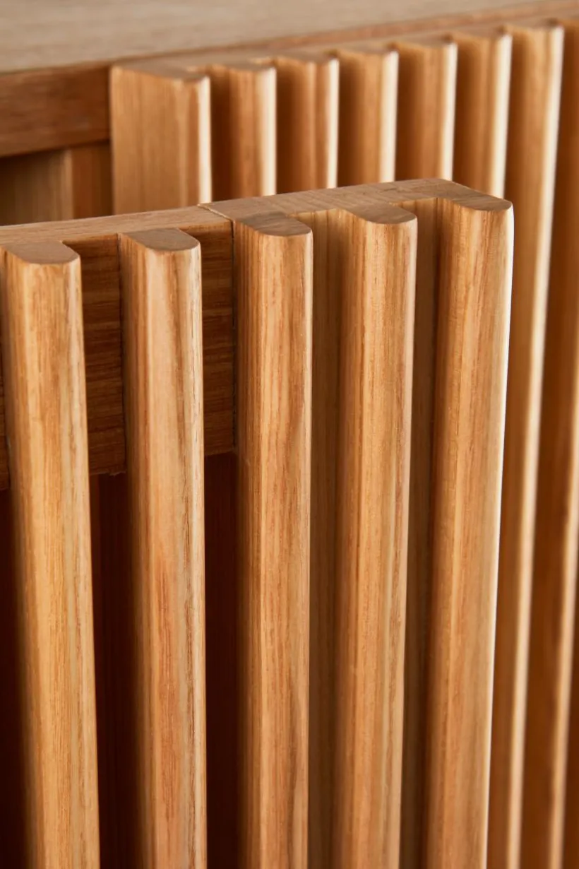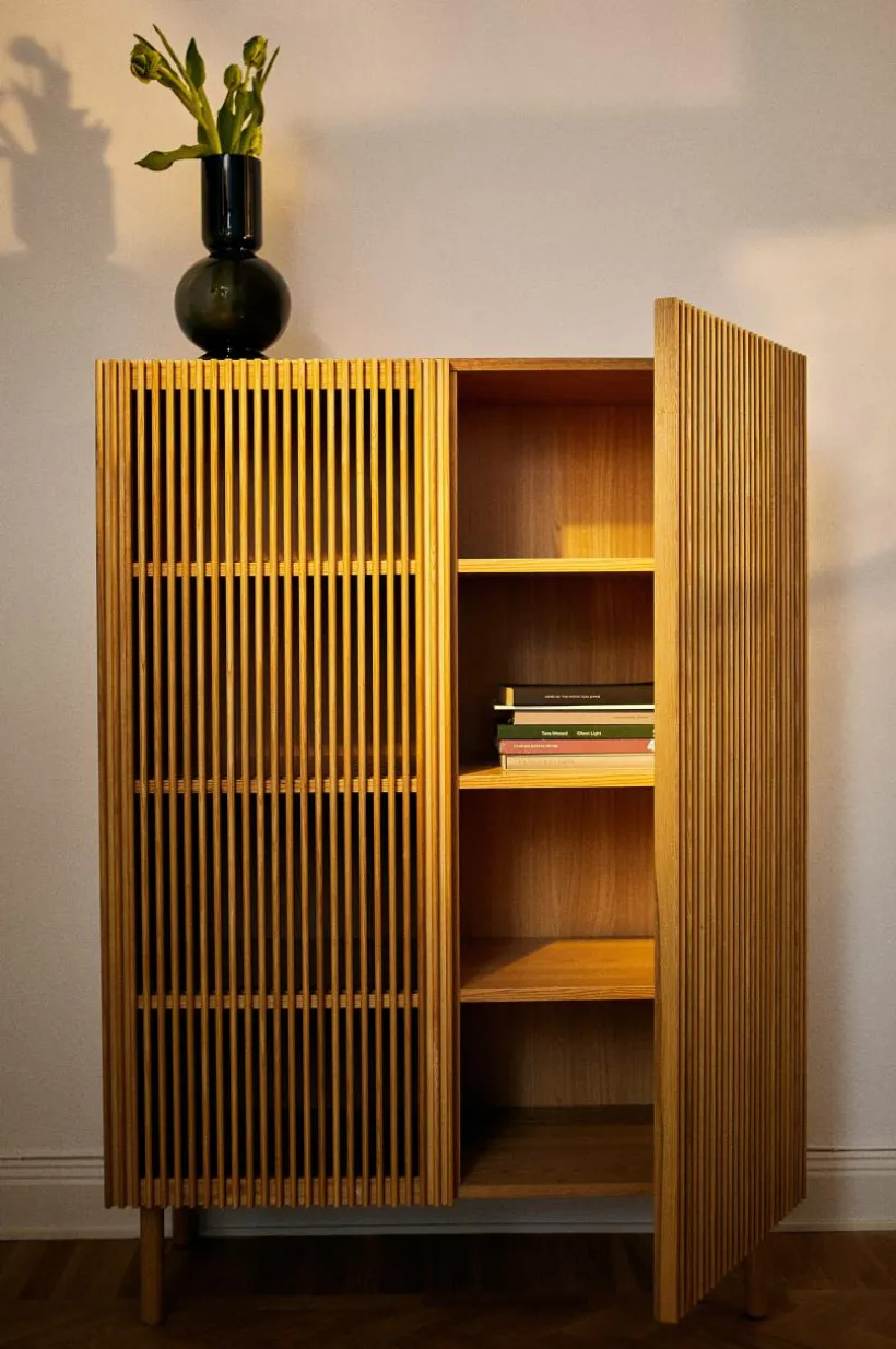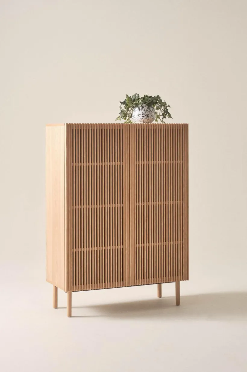Skåp med dörrar och ben av massiv ask, stomme av MDF med askfaner. Skåpet ger en naturlig känsla i sin skandinaviska stil med en touch av retro. De stilrena dörrarna består av askribbor med rundad kant och lätt transparens uppstår i mellanrummen. Skåpet har tre fasta hyllplan. Raka, runda ben ger en nätt känsla. Skruvar medföljer. Viss montering krävs. Monteringsanvisning medföljer.