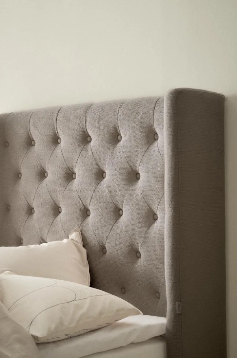 Fristående sänggavel klädd med ett enfärgat tyg som är mjukt och behagligt. Sänggaveln har vingar framåt och de djuphäftade, klädda knapparna ger en lyxig känsla. Stommen är av plywood och massivt trä som vadderats med skumgummifyllning. Väggfäste ingår, en ramp på baksidan gör det enkelt att hänga upp gaveln om du vill det. Du kan också klämma fast sänggaveln mellan sängen och väggen. Viss monterings krävs. Monteringsanvisning medföljer.