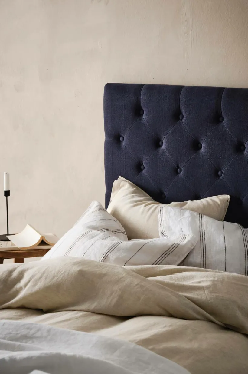 Fristående gavel klädd med linne och djuphäftade klädda knappar. Skapa hotellkänsla i sovrummet med en djuphäftad sänggavel i finaste linne. Väggfästen medföljer.