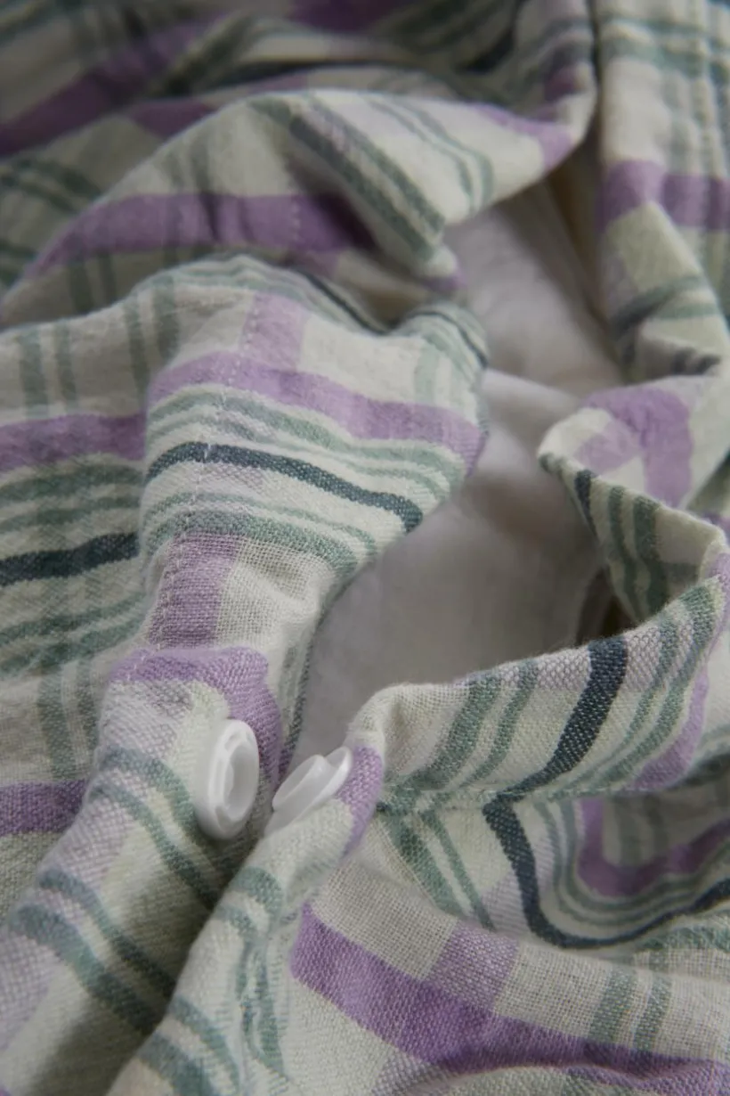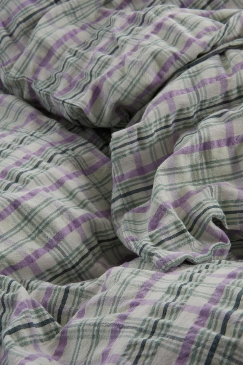 Påslakanset i 3 delar av härlig bomull med fräscht, garnfärgat rutmönster. Bäckebölja är en kvalité som passar extra bra under sommarhalvåret. Det lite bubbliga tyget ger en sval och luftig känsla och andas skönt. Öppning i övre hörnen på påslakanet, som underlättar att trä påslakanet över täcket. Trådtäthet på 144 tc. (Trådtätheten talar om antalet trådar, thread counts, per kvadrattum i ett tyg. Ju högre trådtäthet desto högre kvalité.)