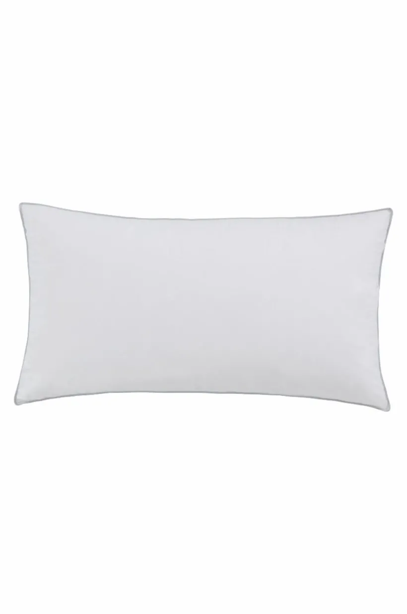Det vita yttertyget är av tät bomull som inte läcker dun och har två silvergrå passpoalkanter runt om. Dunkudden levereras i en tygväska av bomull. .