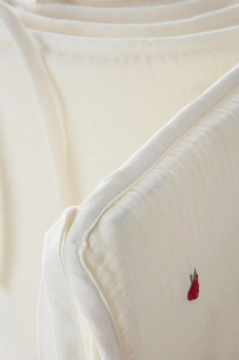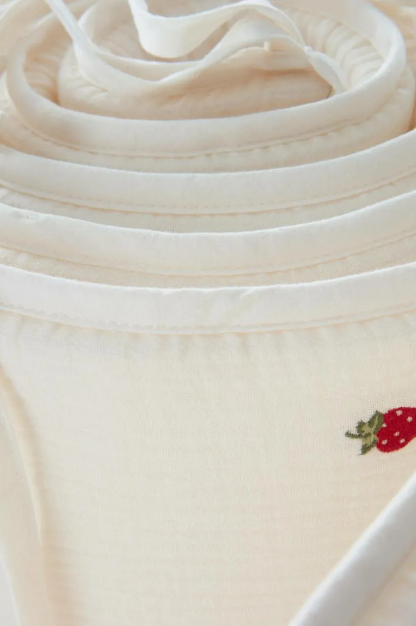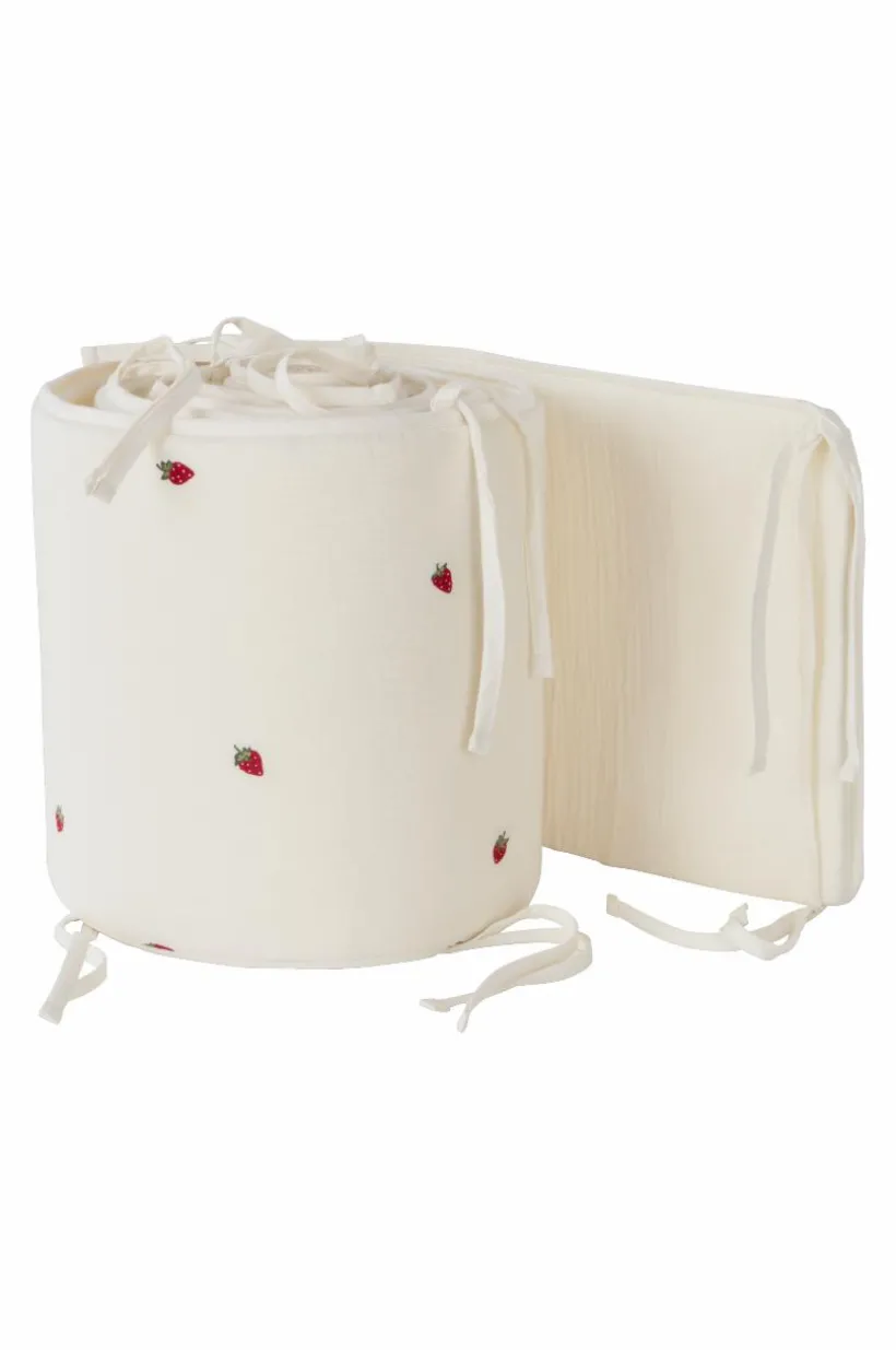 Spjälsängsskydd med yttertyg av härlig, ekologisk bomullsmuslin med broderade jordgubbar. Muslin är ett mjukt, tunt tyg i två lager, vävt med lite bubblig effekt, vilket gör tyget mjukt och extra lättskött. Du behöver inte stryka eller mangla. Det behagliga muslintyget är härligt mot huden. Spjälsängsskyddet har fyllning av polyester med mjuk skumgummikärna. Det gör spjälsängen mer ombonad och mysig, samtidigt som det hindrar barnet från att slå emot spjälorna i sömnen. Spjälsängsskyddet knyts fast med knytband. Yttertyget är avtagbart med dragkedja i öppningen och tvättbart. Spjälskyddet passar en spjälsäng med måtten 60×120 cm. Trådtäthet på 178 tc. (Trådtätheten talar om antalet trådar, thread counts, per kvadrattum i ett tyg. Ju högre trådtäthet desto högre kvalité.)