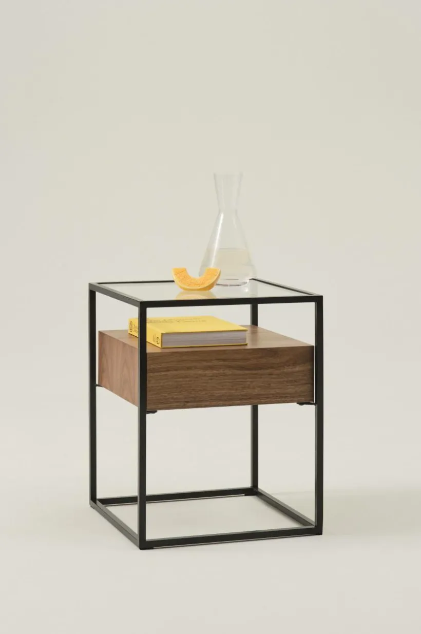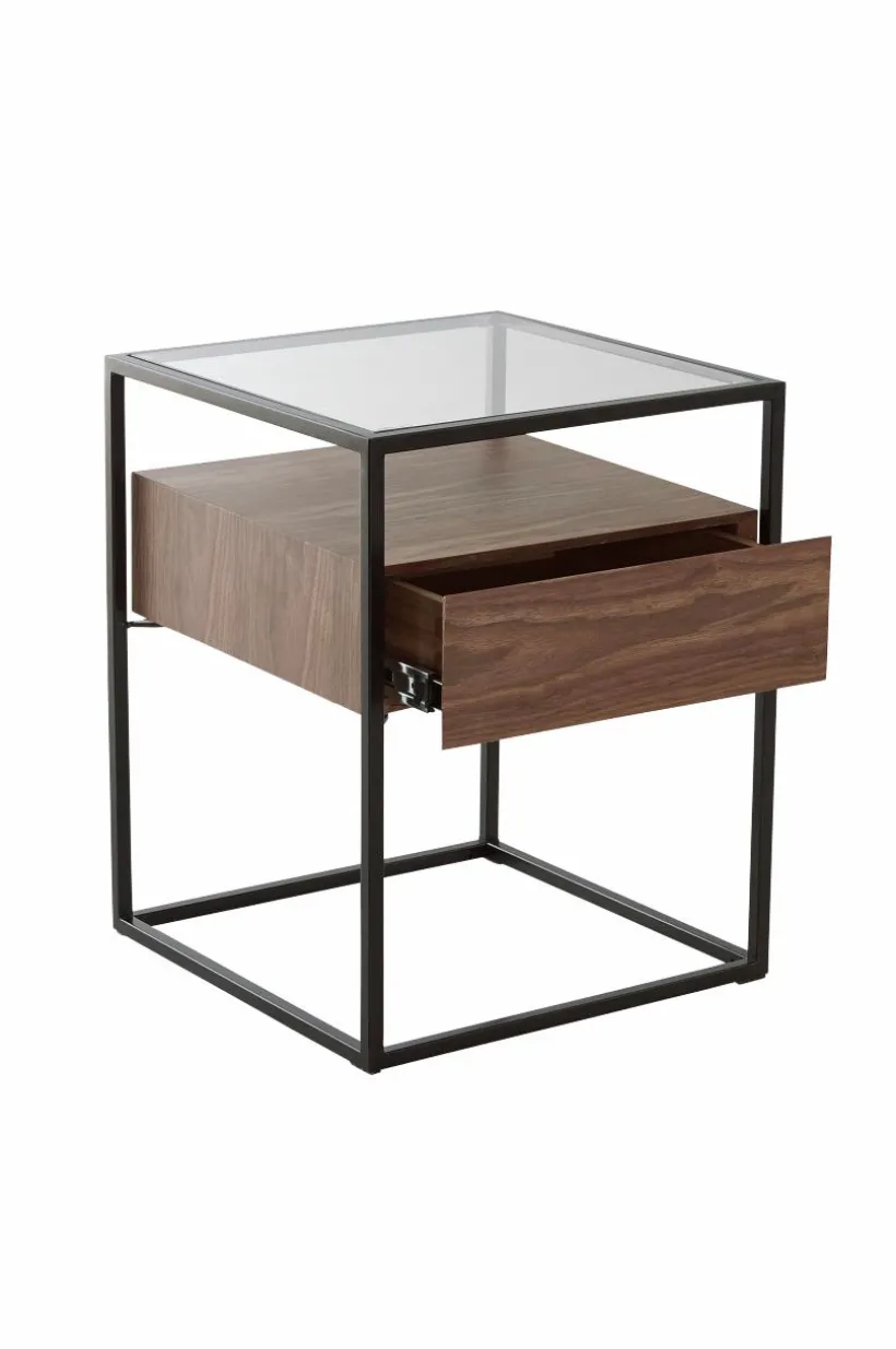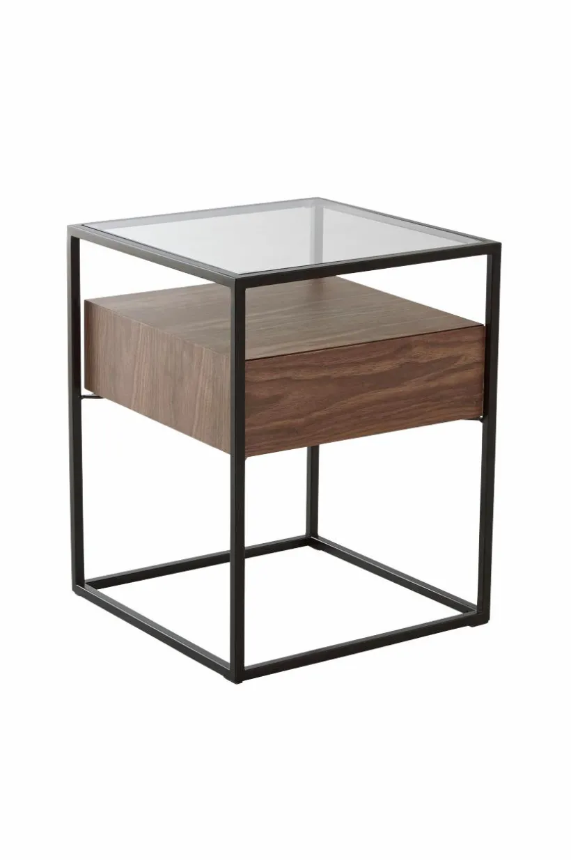Fyrkantigt sidobord med klarglas som skiva, liten låda av fanerad MDF och metallram. Ett modernt sidobord med dold förvaringslåda och ett utsvarvat handtag i underkant som gör lådan enkel att öppna.