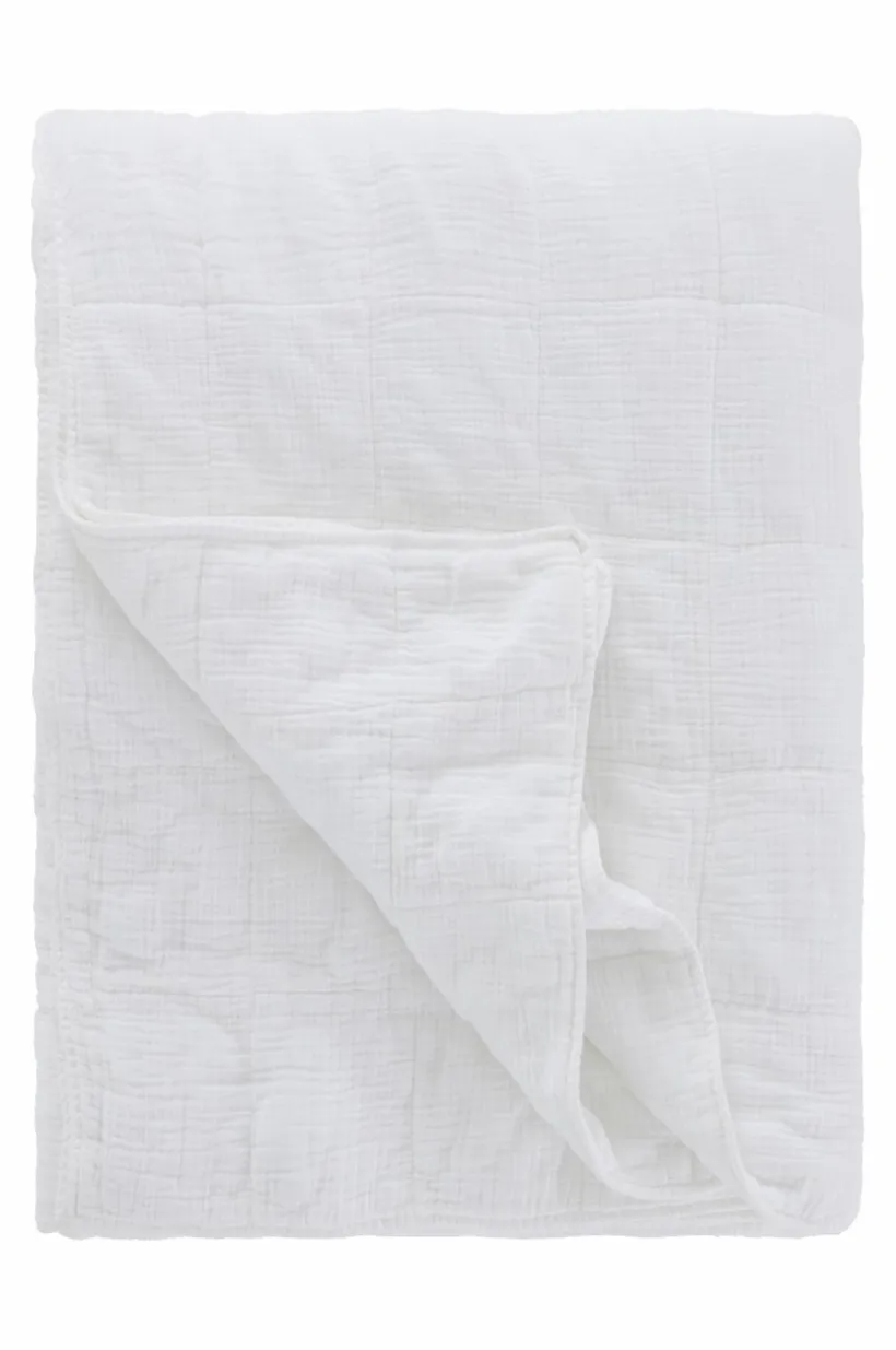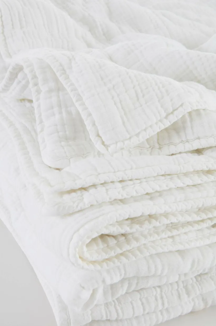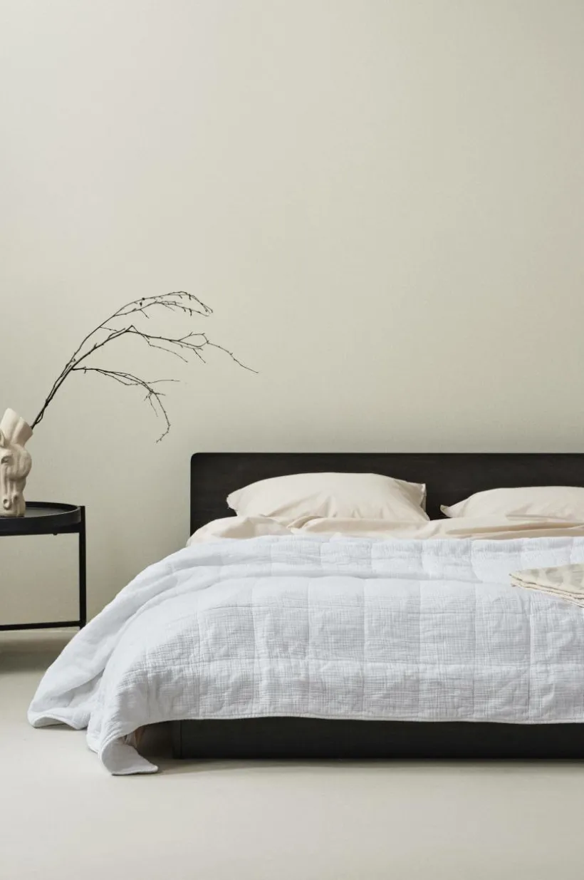 Enfärgat överkast i härlig, ekologisk bomullsmuslin med lätt och fluffig vaddering. Quiltsömmar i kvadratmönster håller vadderingen på plats. Muslin är ett mjukt, tunt tyg i två lager, vävt med lite bubblig effekt, vilket gör tyget mjukt och extra lättskött. Du behöver inte stryka eller mangla. Det är dessutom tvättat för en mjukare känsla och för att få fram den bubbliga strukturen. Trådtäthet på 178 tc. (Trådtätheten talar om antalet trådar, thread counts, per kvadrattum i ett tyg. Ju högre trådtäthet desto högre kvalité.)