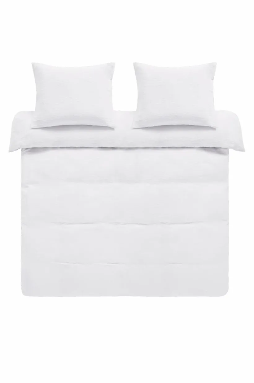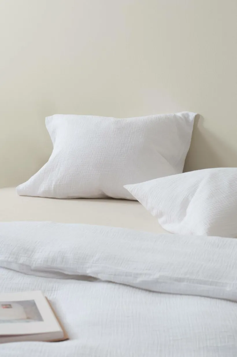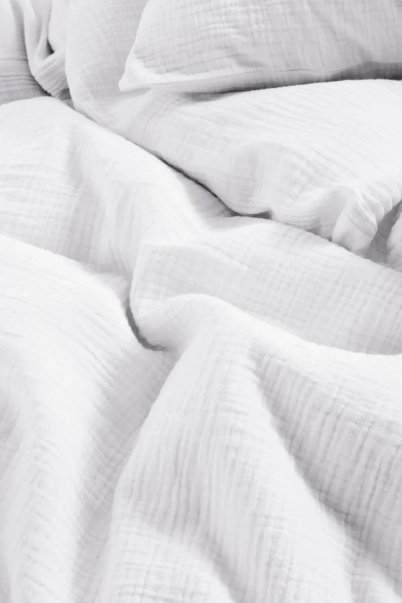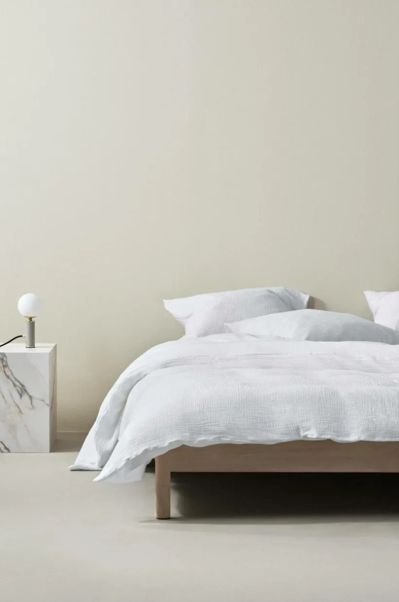 Enfärgat påslakanset med ett extra brett påslakan och två örngott, i härlig, ekologisk bomullsmuslin. Muslin är ett mjukt, tunt tyg i två lager, vävt med lite bubblig effekt, vilket gör tyget mjukt och extra lättskött. Du behöver inte stryka eller mangla. Det är dessutom tvättat för en mjukare känsla och för att få fram den bubbliga strukturen, det behagliga muslintyget är skönt att sova i. Öppning i övre hörnen på påslakanet, som underlättar att trä påslakanet över täcket. Trådtäthet på 178 tc. (Trådtätheten talar om antalet trådar, thread counts, per kvadrattum i ett tyg. Ju högre trådtäthet desto högre kvalité.)