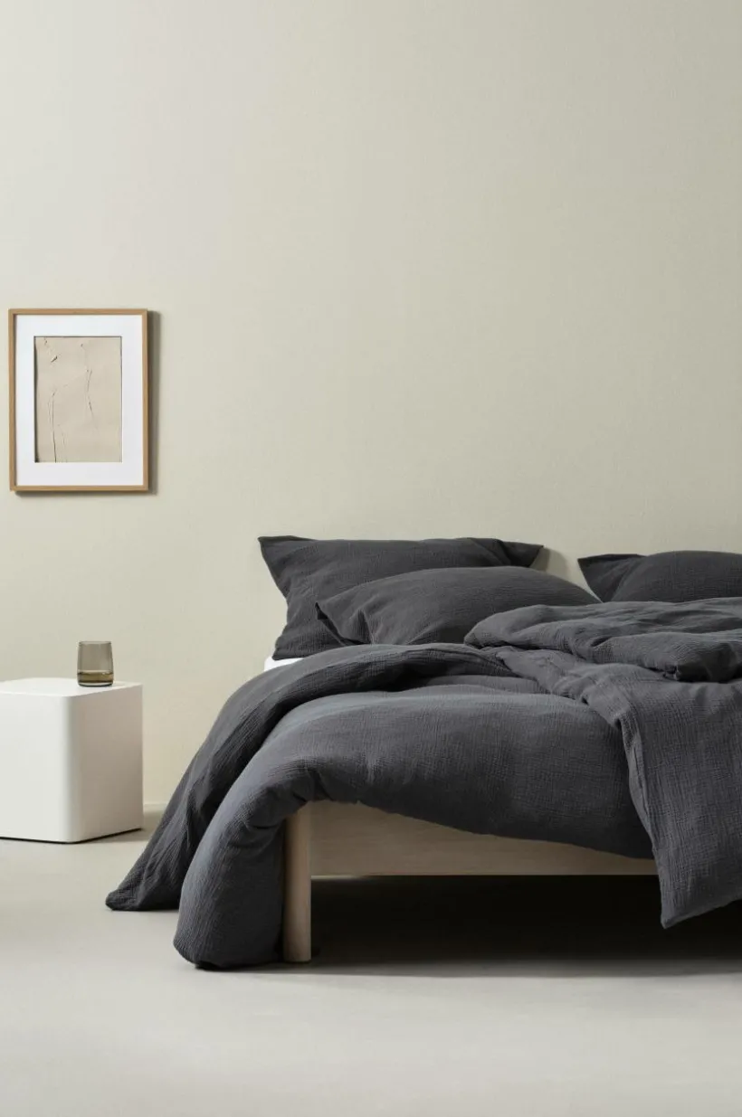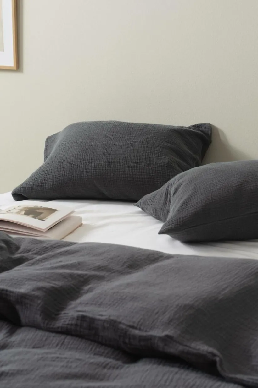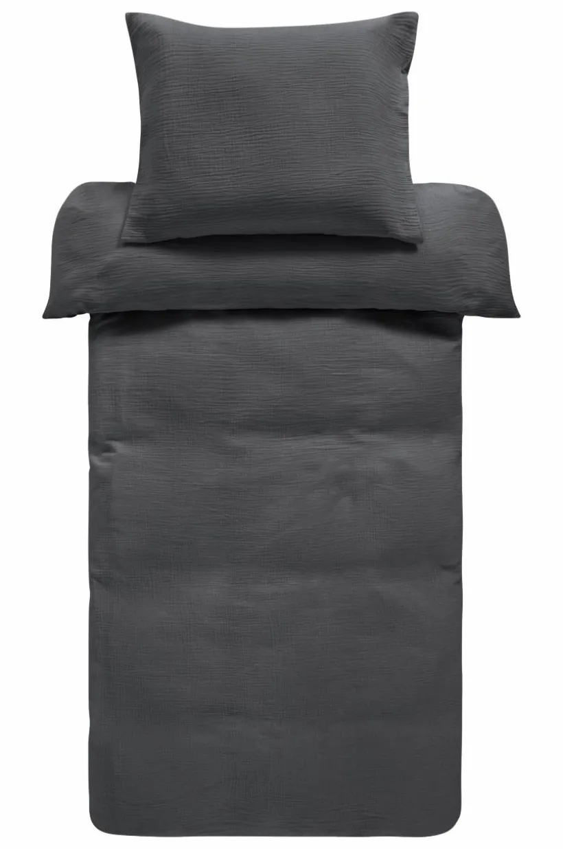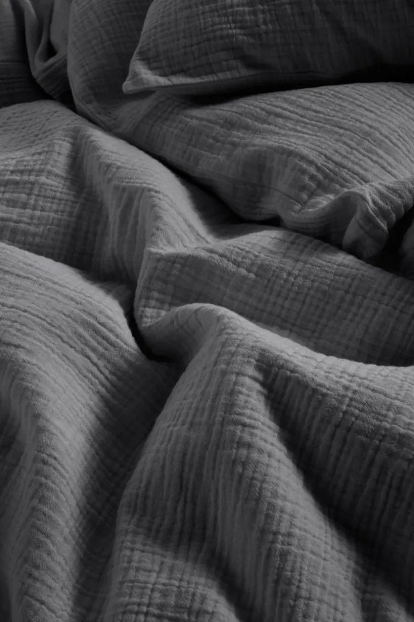 Enfärgat påslakanset med ett påslakan och ett örngott, i härlig, ekologisk bomullsmuslin. Muslin är ett mjukt, tunt tyg i två lager, vävt med lite bubblig effekt, vilket gör tyget mjukt och extra lättskött. Du behöver inte stryka eller mangla. Det är dessutom tvättat för en mjukare känsla och för att få fram den bubbliga strukturen, det behagliga muslintyget är skönt att sova i. Öppning i övre hörnen på påslakanet, som underlättar att trä påslakanet över täcket. Trådtäthet på 178 tc. (Trådtätheten talar om antalet trådar, thread counts, per kvadrattum i ett tyg. Ju högre trådtäthet desto högre kvalité.)