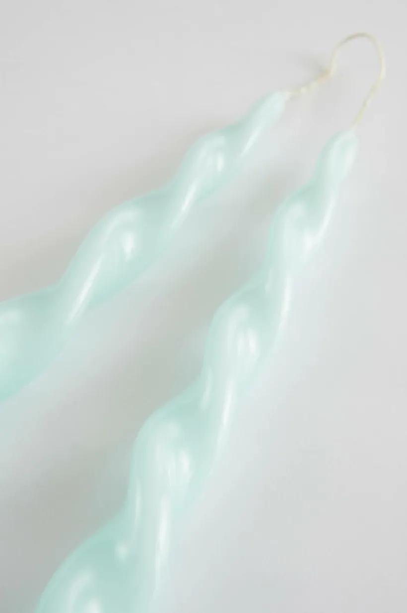 2-pack levande ljus av stearin och paraffin som sedan doppats i färg och lackats. Ljusen är vackert skruvade och de har vridits för hand för att skapa formen. Ljusen är mycket dekorativa även när de inte brinner. Levande ljus skapar en extra mysig känsla. Stearinet innehåller inte palmolja.