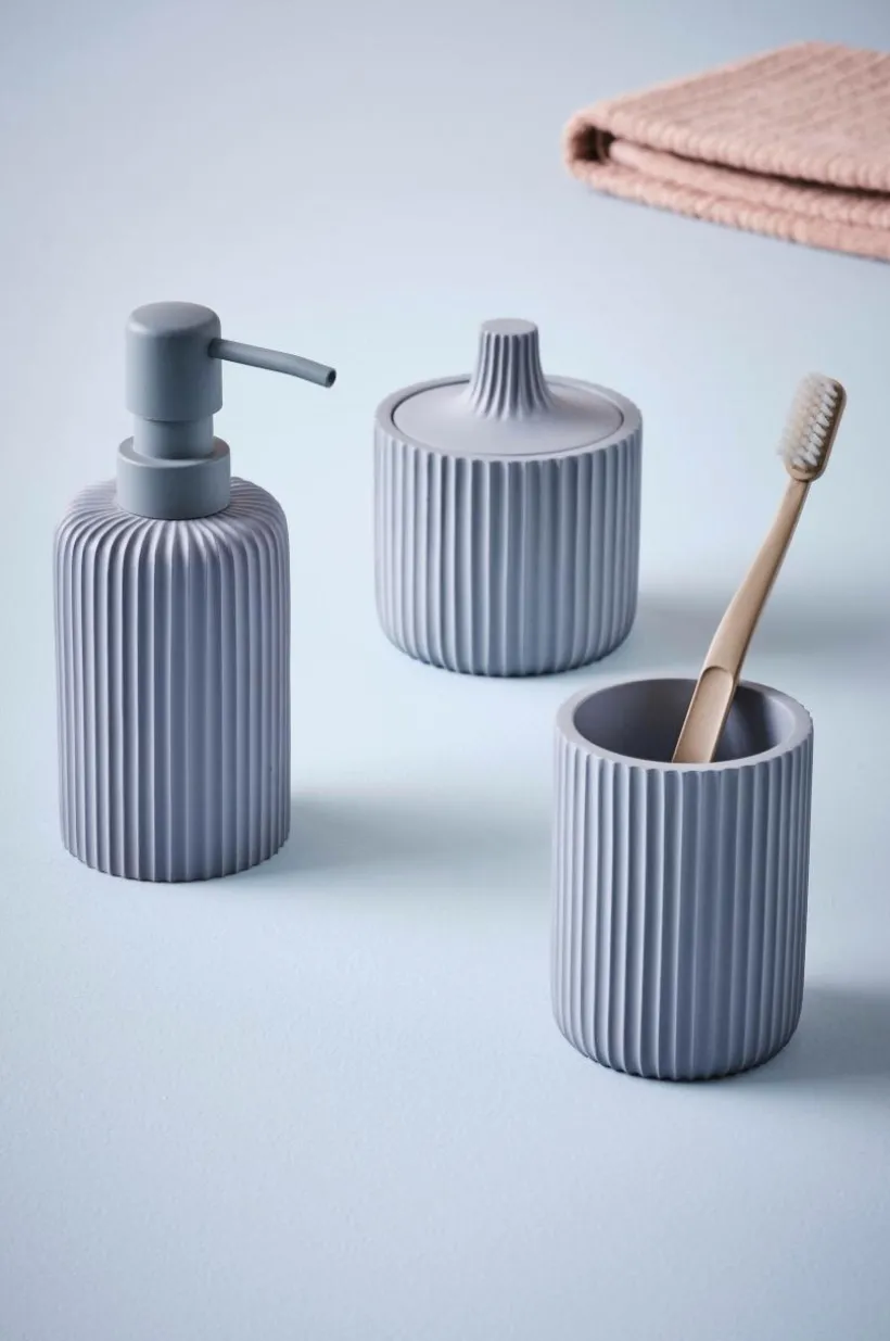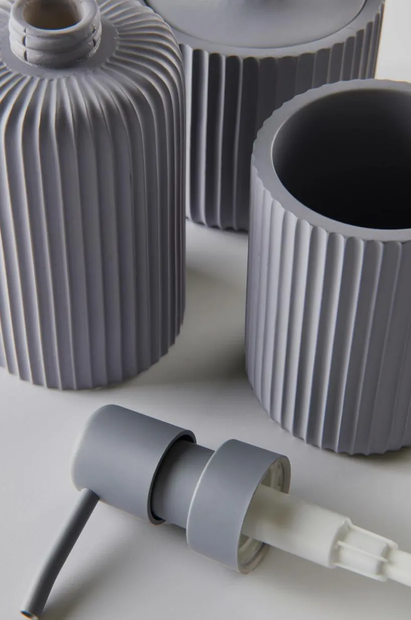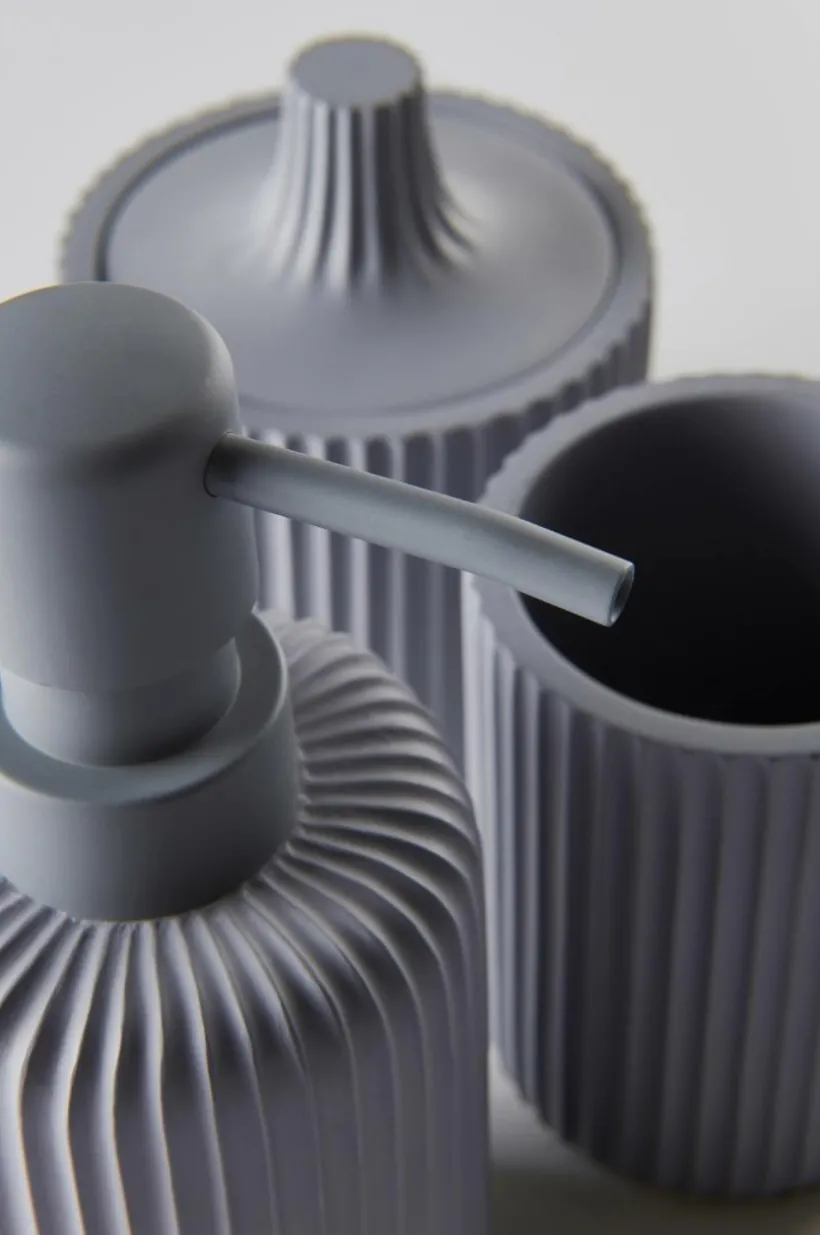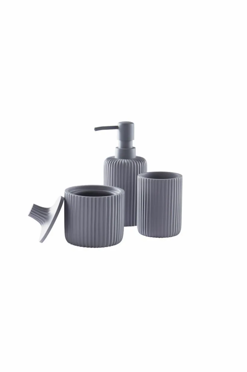 Badrumsset med tre delar i polyresin. Det snygga badrumssetet är helt enfärgat med strukturränder och är i ett lät och tåligt material som passar i badrummet. Setet innehåller en mugg, burk med lock och en dispenser med plastpump. Dispensern fyller du på med din flytande favorittvål, att köpa refill är ett bättre val för miljön då mängden plast minskar. Den är också bra att använda till hudlotion eller schampo.