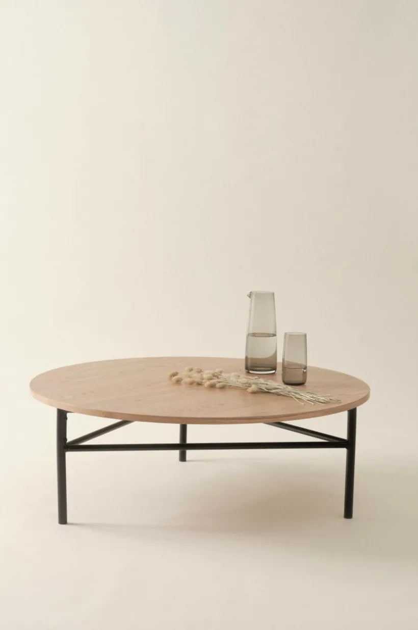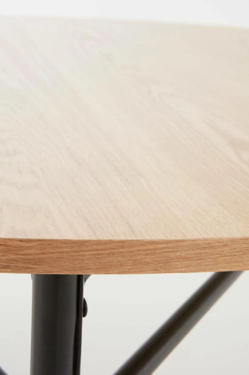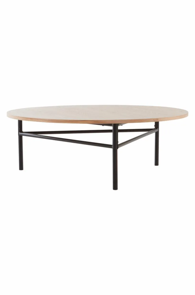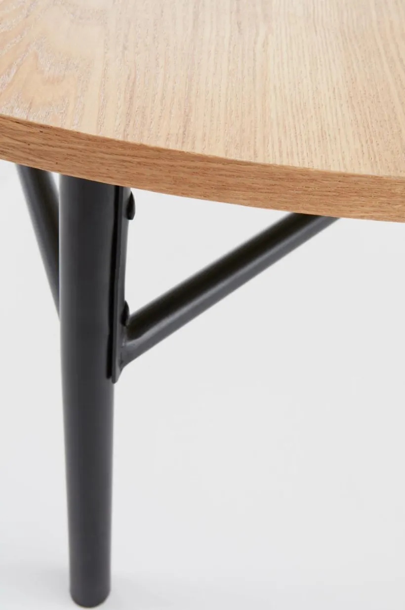 Runt soffbord med ben av stål och bordsskiva av MDF med askfaner. Underredet är trebent och har svart lack. Viss montering krävs. Monteringsanvisning medföljer.