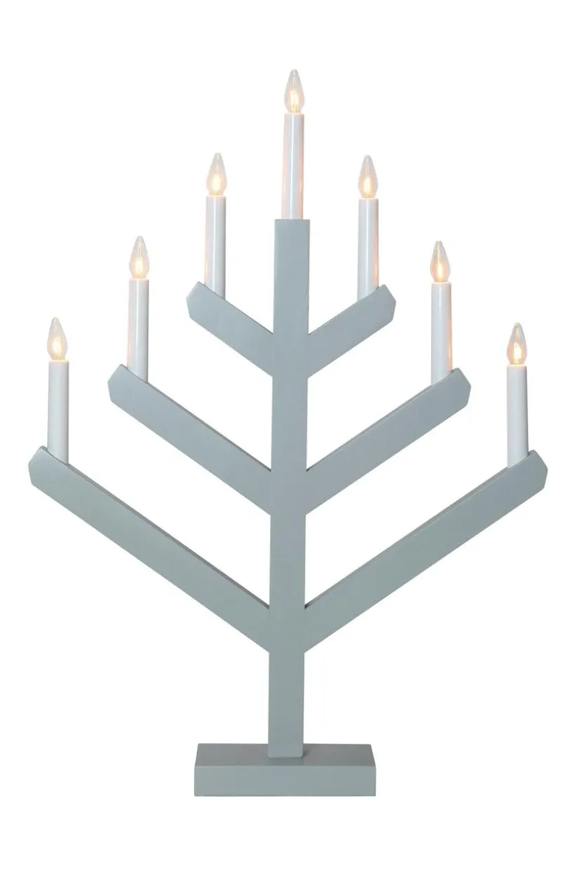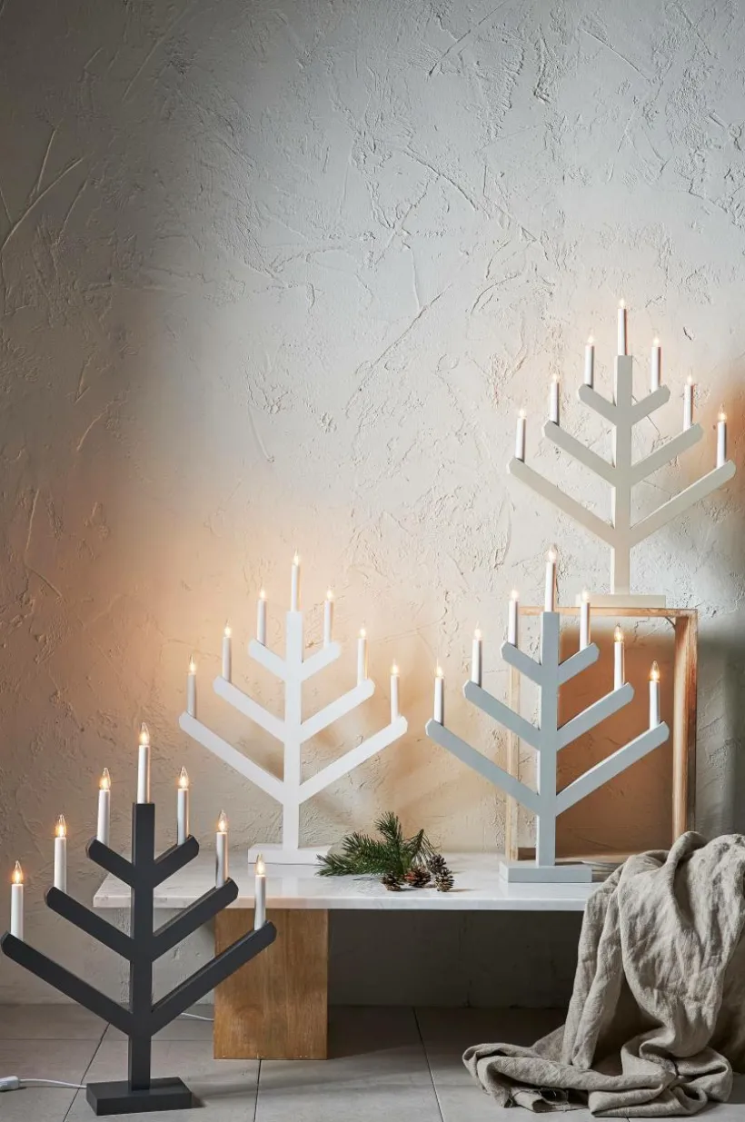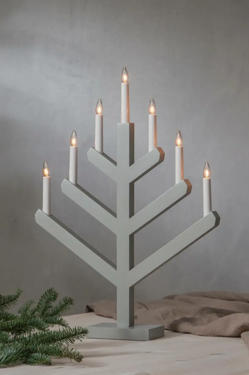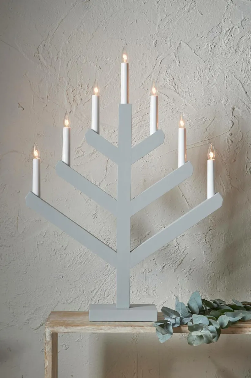 Elljusstake av trä som målats i neutrala färger. Den femarmade ljusstaken är stilren och nordisk i designen med enkla, strama linjer. VINGA passar lika bra i det klassiska som det moderna hemmet. Vit sladd med strömbrytare. För inomhusbruk. Medellivslängd 1000 timmar.
