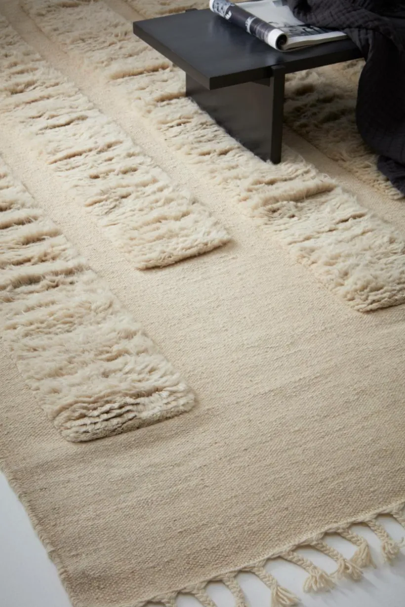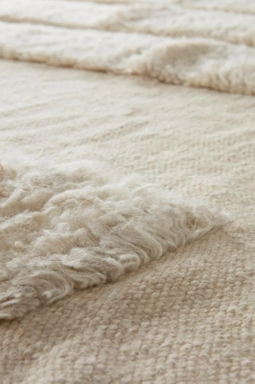 Handknuten ullmatta som har slätvävd botten och mönstret skapas av den knutna lugggen. Mattan har fint flätad franskant längs kortsidorna. Ull är ett naturligt material, varmt och skönt. En handgjord matta är ett fint hantverk och varje matta är unik. Franslängd 7 cm. Lugghöjd 2,6 cm. Tjocklek 2,9 cm. 2200 g/m².
