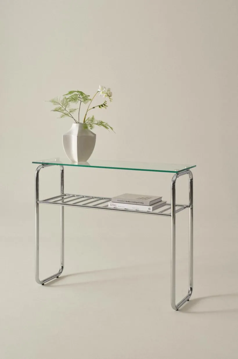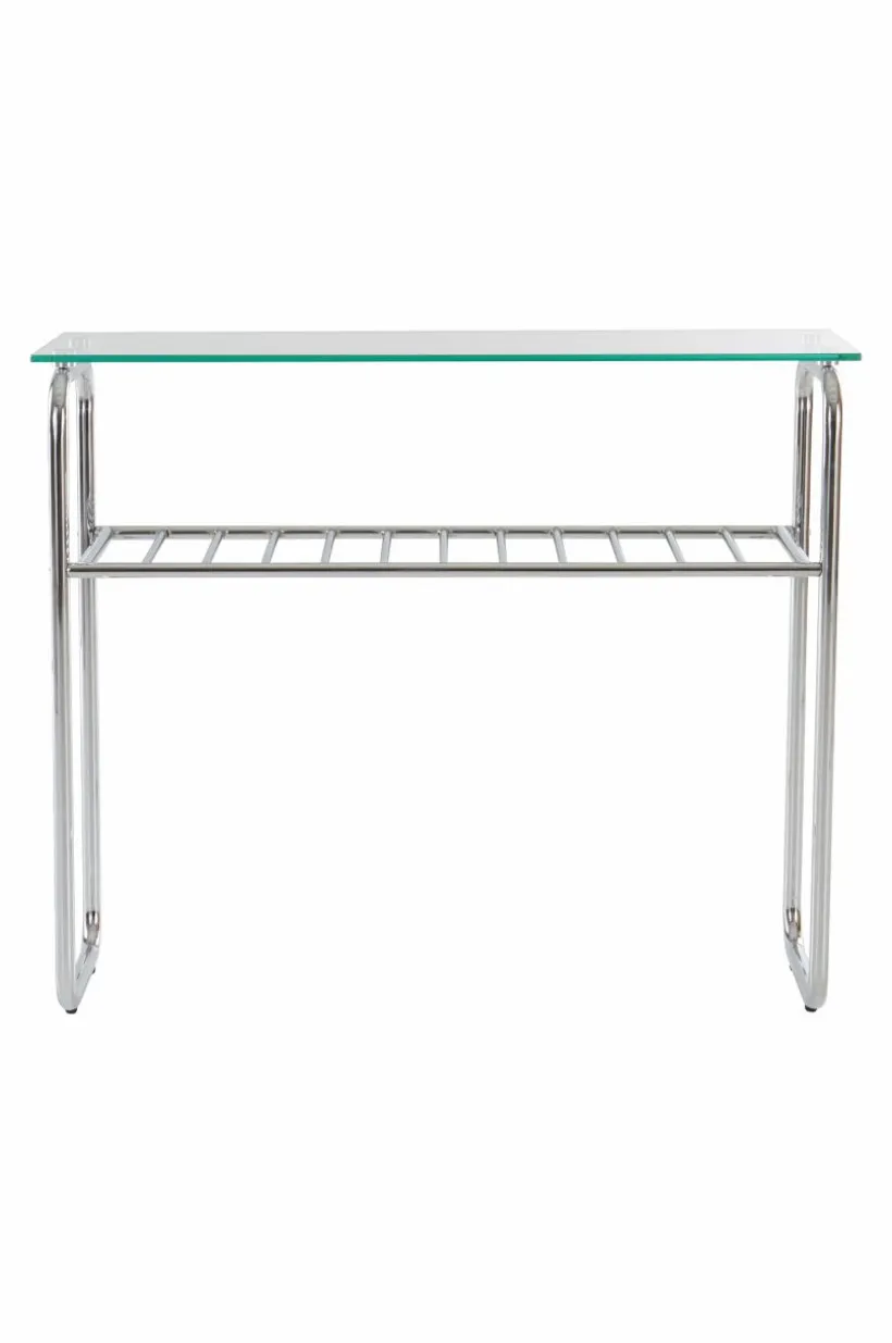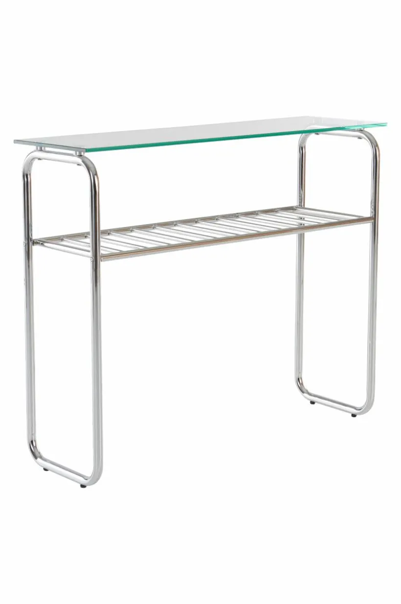 Storlek: Höjd 76 cm, bordsskiva 32×100 cm. Stålrör stomme ø 2,5 cm och hyllplan 1,6 cm.