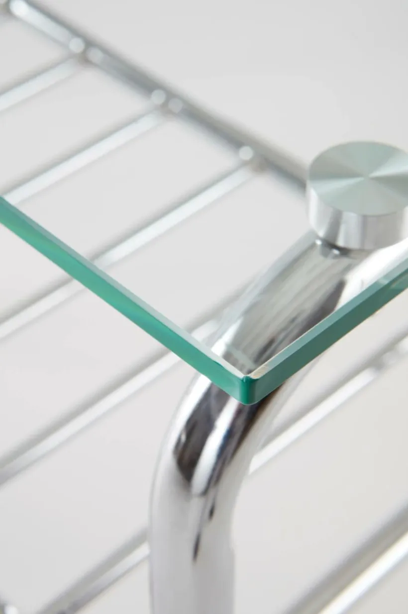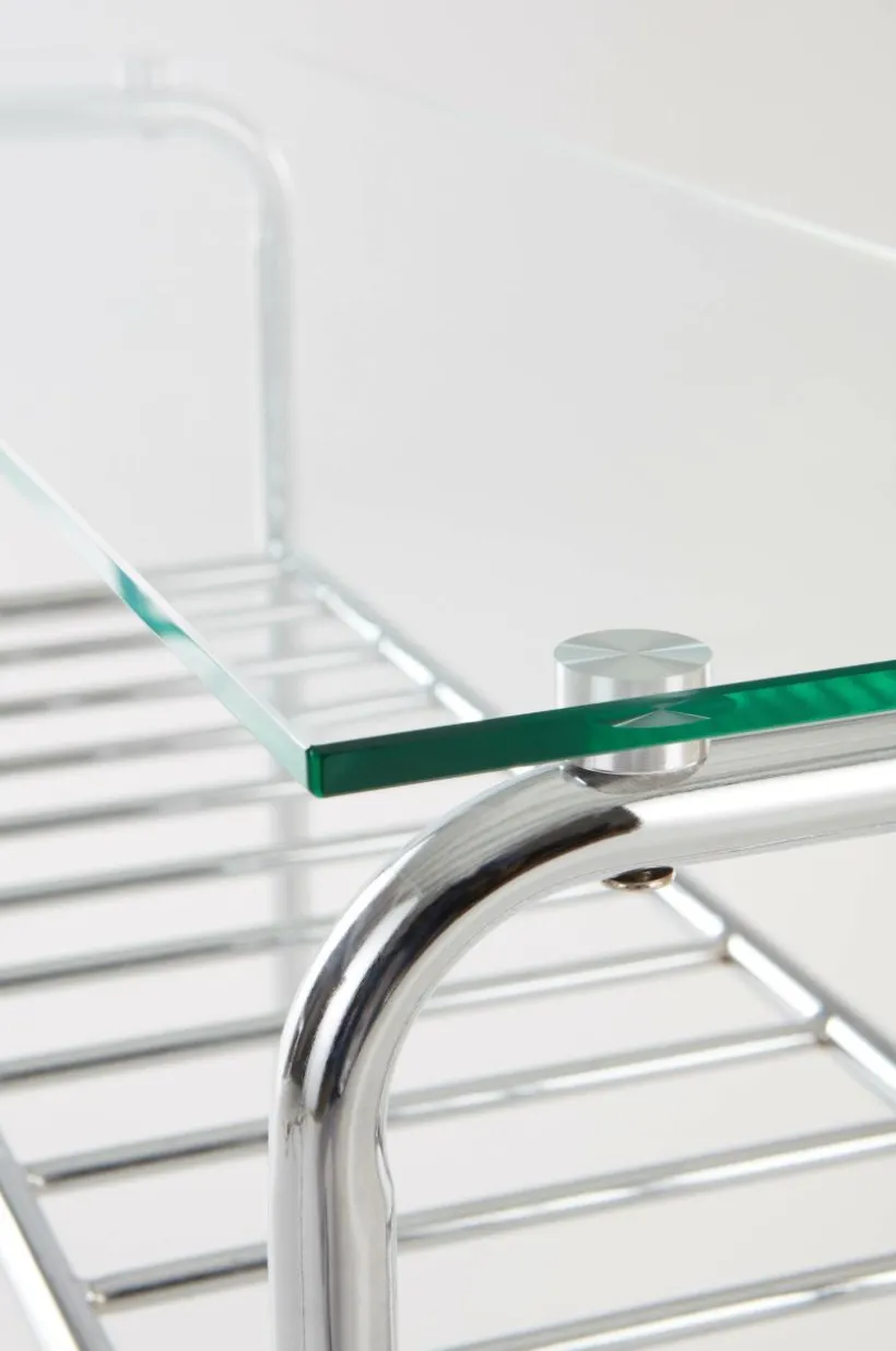Sideboard med bordsskiva av härdat glas och metallstomme av kromat stålrör. Stommen har rundade hörn och möbeln andas 70-tal. Viss montering krävs. Monteringsanvisning medföljer.
