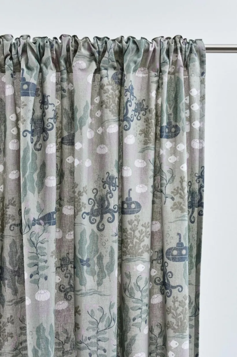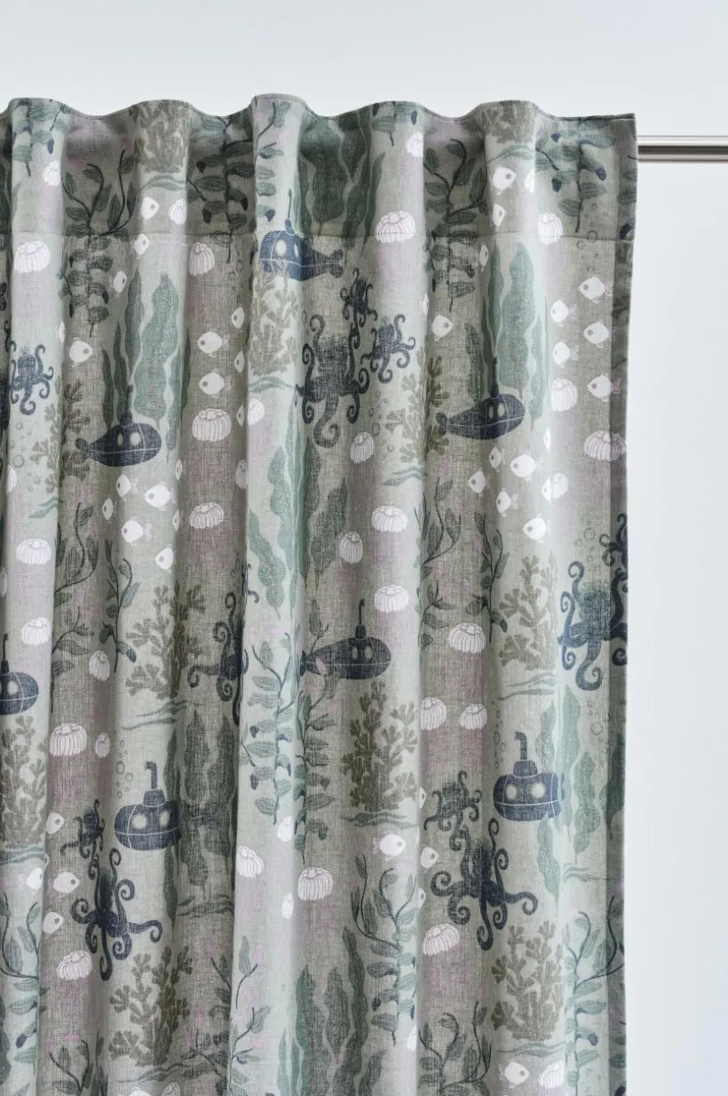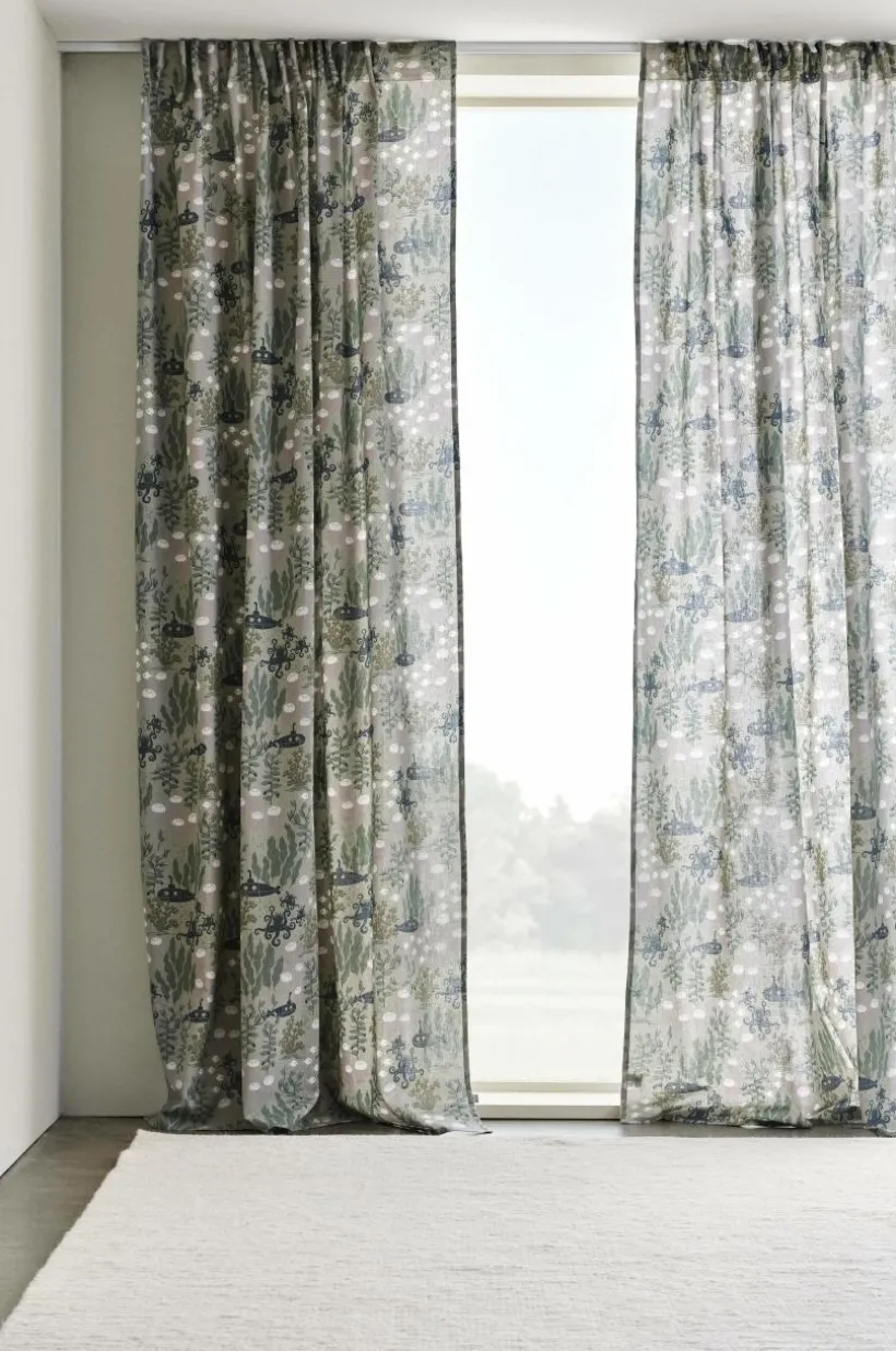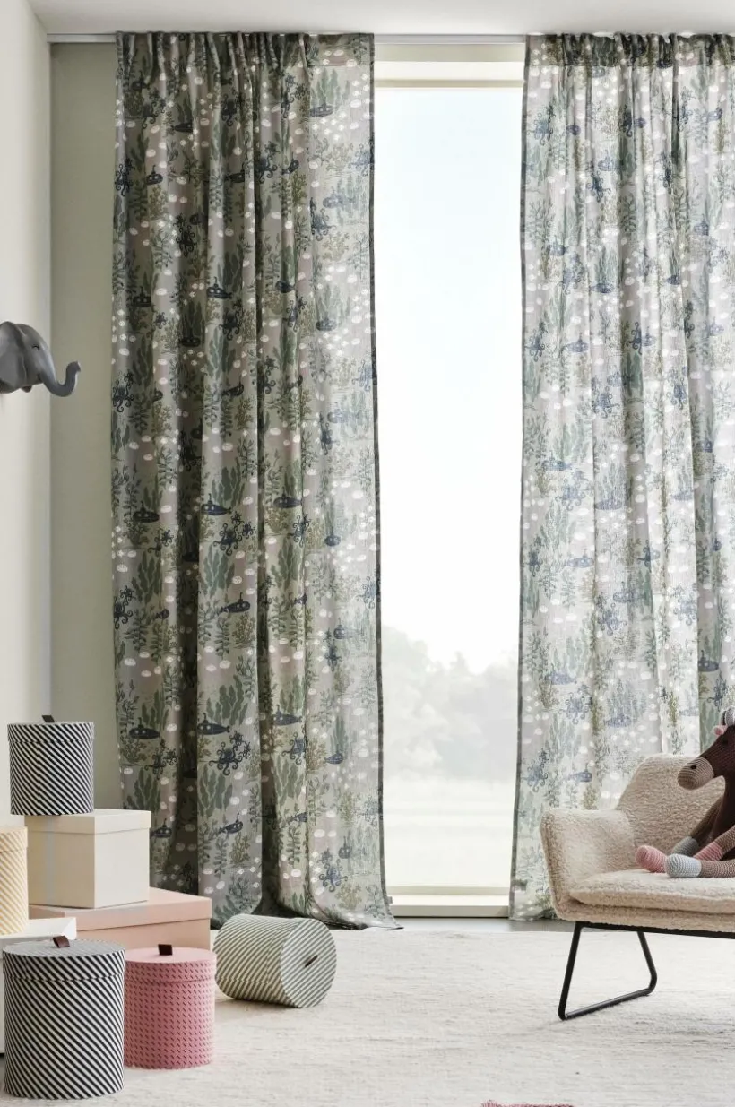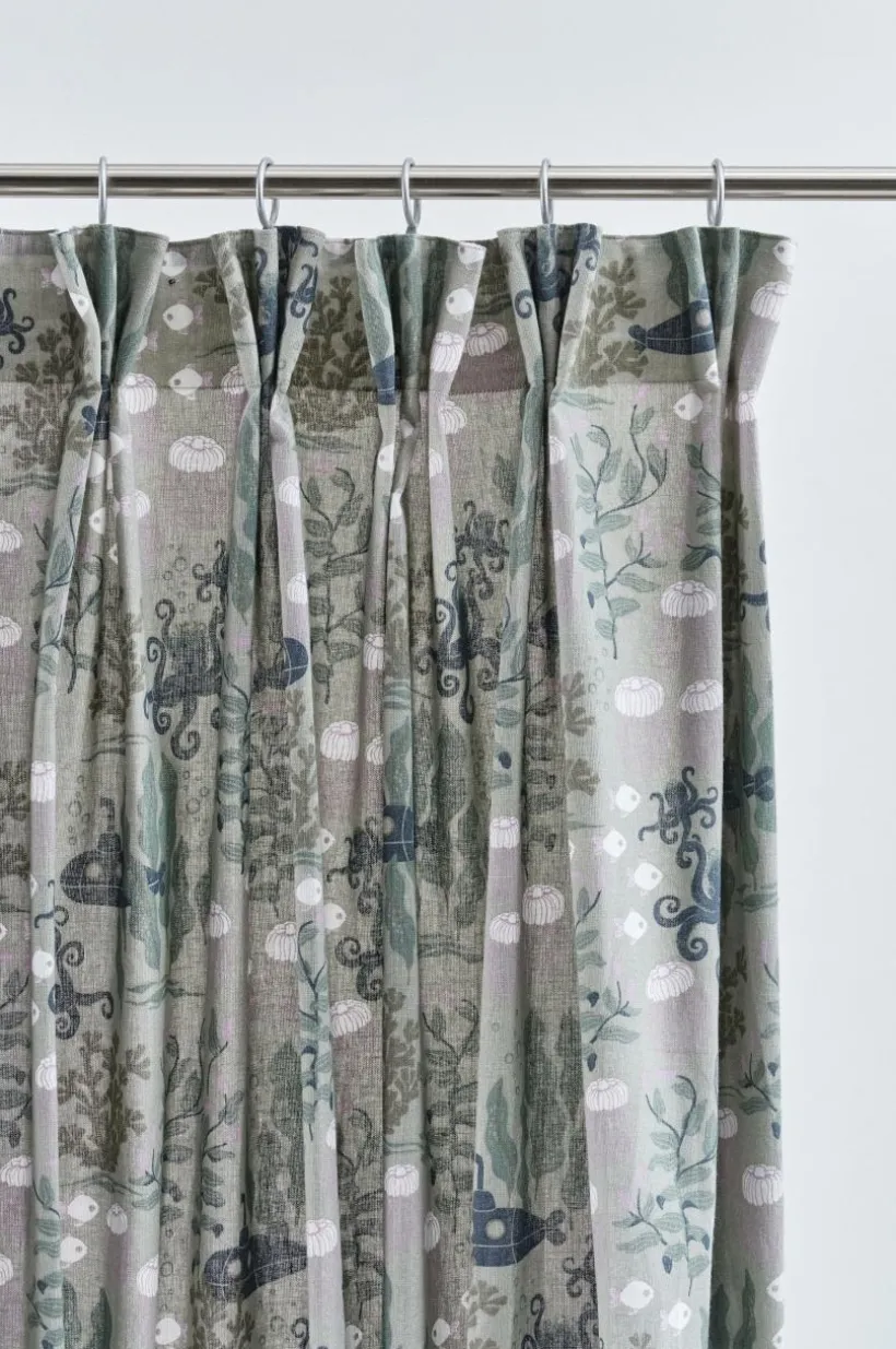 Två gardinlängder i fin kvalité av linne och bomull med tryckt mönster designat av Maria Carlberg. Det härliga mönstret har inspirerats av ett sagoliv under vattenytan och färgerna är lugna och harmoniska. WATERS är en mysig kollektion som ger utrymme för fantasin. Längderna har påsytt multifunktionsband och kan hängas upp med fingerkrokar, kanal samt dold hälla.