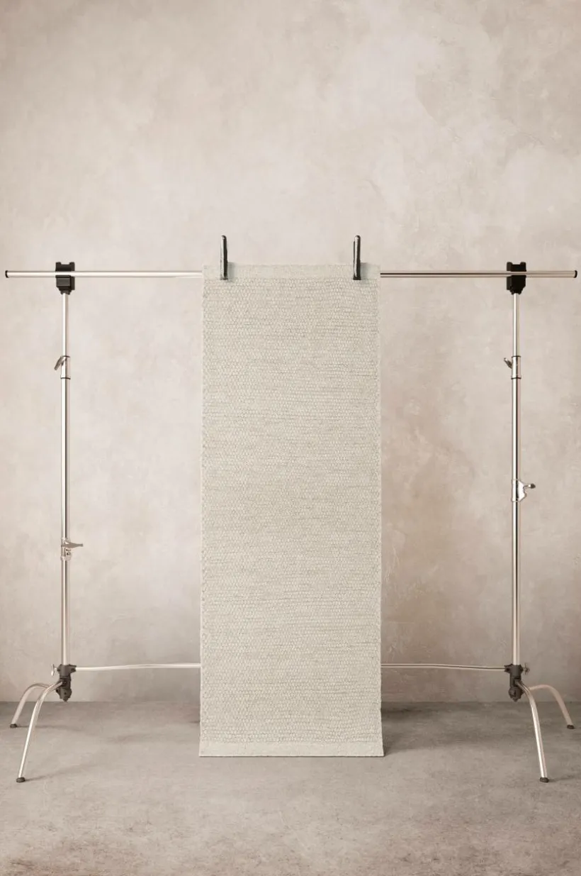 Handgjord matta i fin ull i kombination med bomull. Mattan är slätvävd med en lite strävare känsla och har en stilren design som passar in i många olika stilar och trender. En diskret rand längs kortsidan fångar blicken och mattan blir en lugn och balanserad bas i ditt rum. Ullen i mattan kommer från gårdar där fåren lever ett liv som är naturligt för arten och i samklang med naturen. .